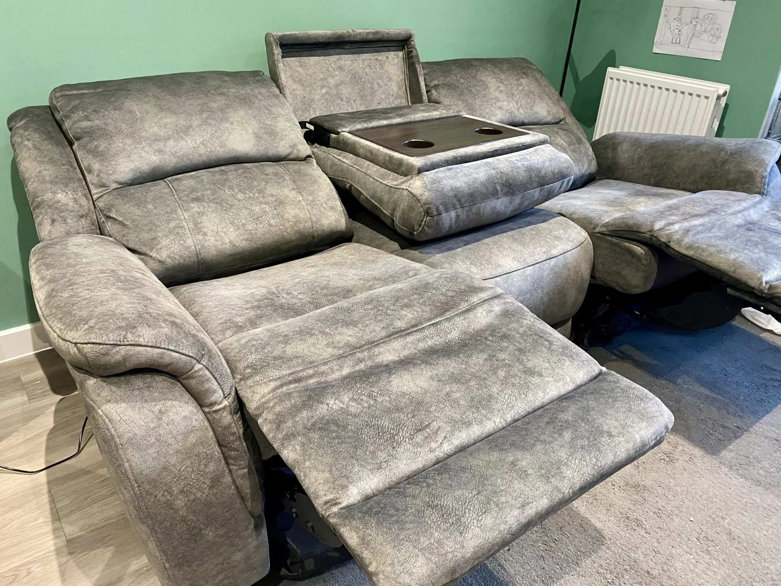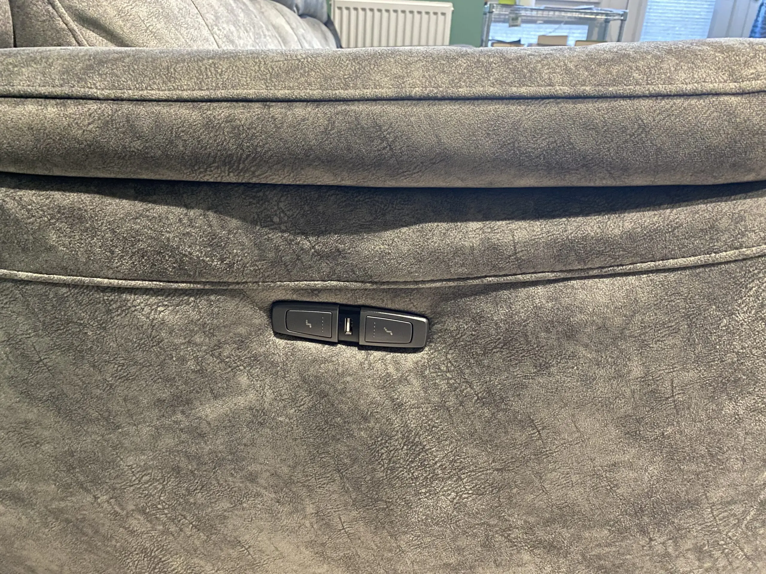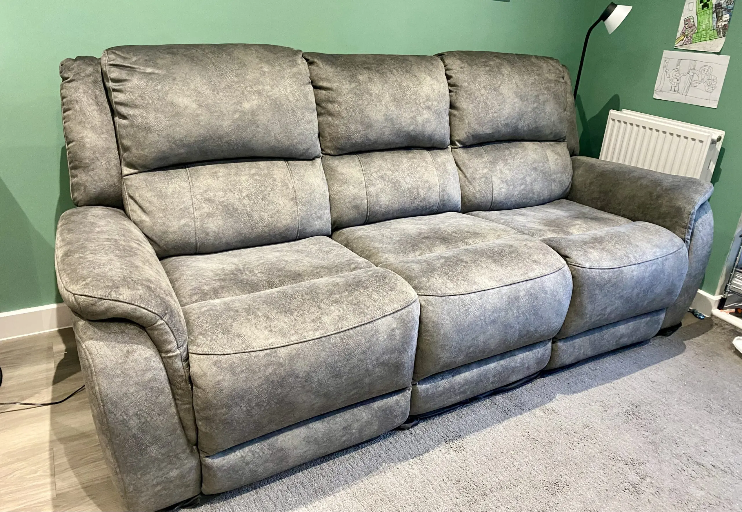The DFS Dylan 3 seater sofa is a double power recliner so you can choose to recline independently. It has a fold down centre table and cup holders. Upholstered in Mayson, an indulgent fabric that looks like suede with the feel of velvet. It has supportive foam seat cushions – which spring back into shape, for a more consistently plump look across the seat of your sofa, with minimal maintenance. It also features built in USB/USB-C device chargers on both ends of the sofa. Includes new and unused fabric care kit provided by DFS as well as Eaziglide casters designed to make moving your sofa quick and easy when cleaning or rearranging your space.