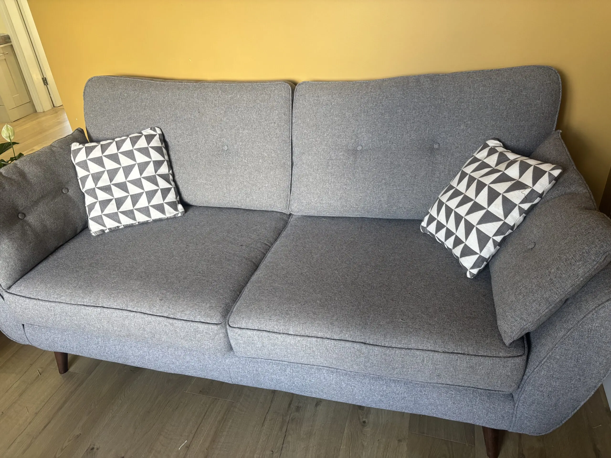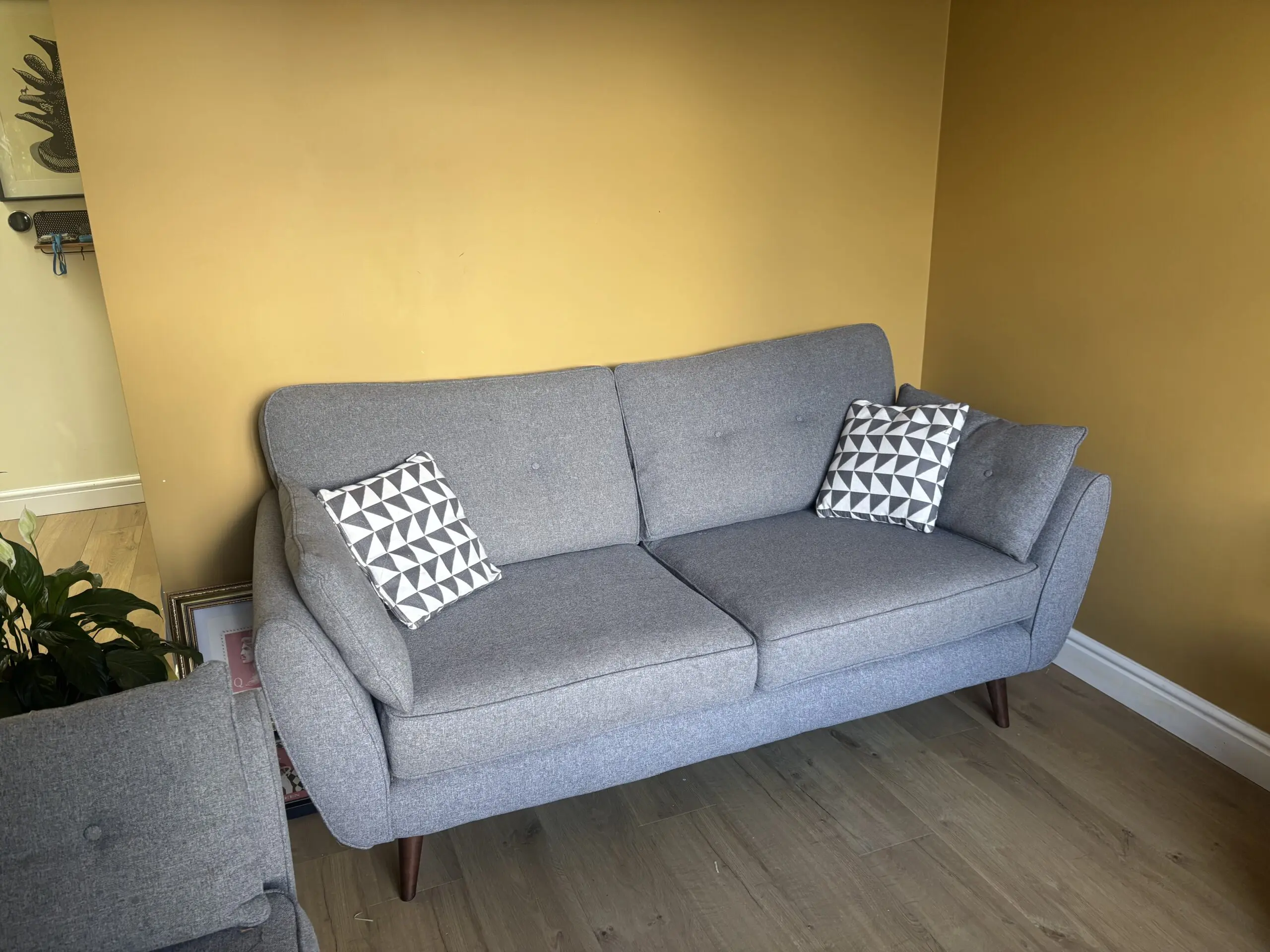 Kids are taking over this room so selling the 3 seater charcoal grey sofa and also the cuddle seat which seats 2. The geometric scatter cushions are included. Cushions still really firm and no snagging but but some small stains which aren’t significantly visible.