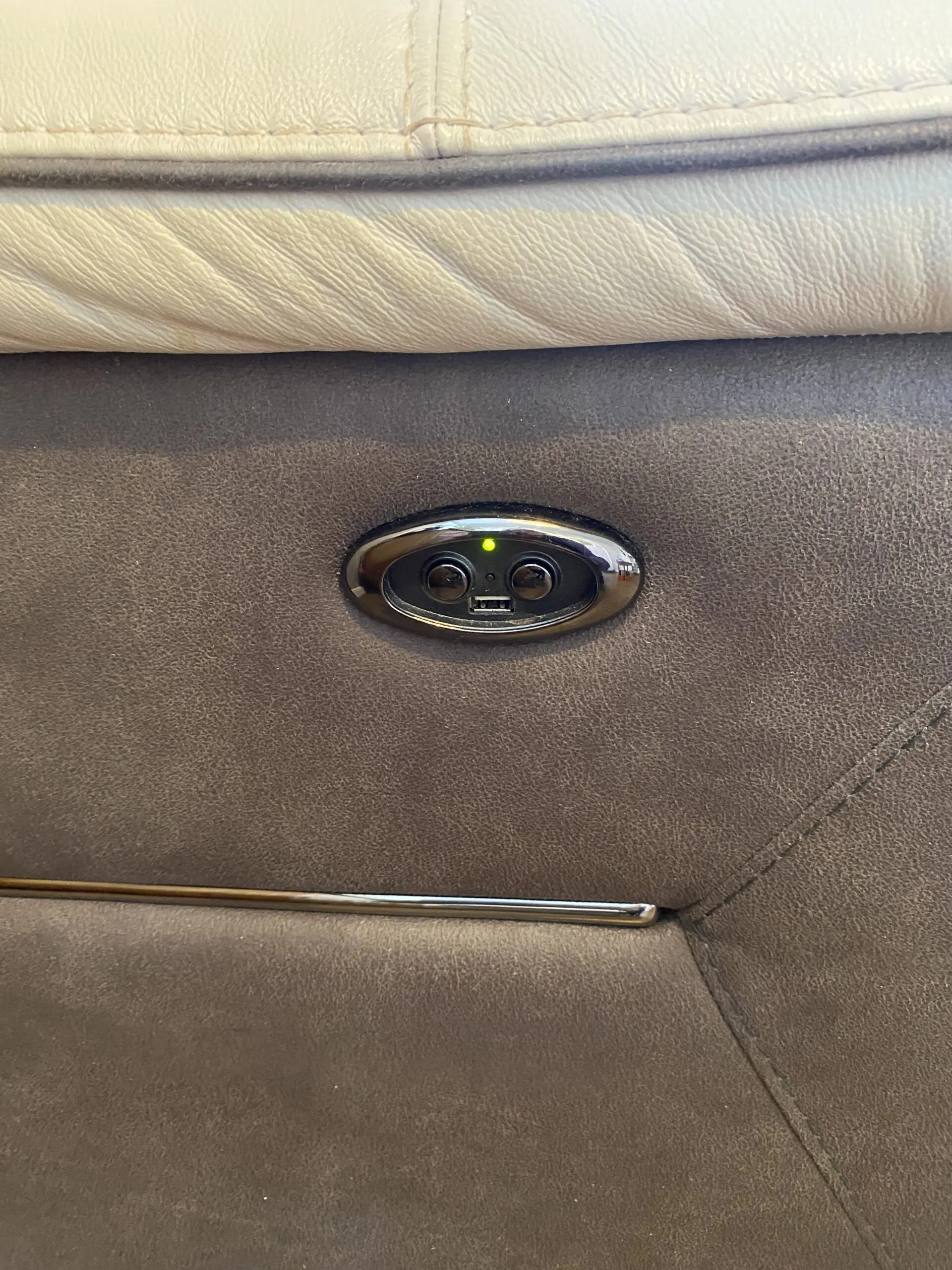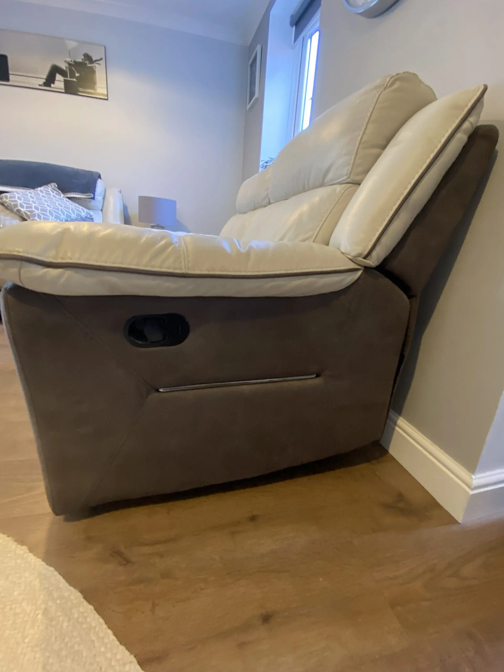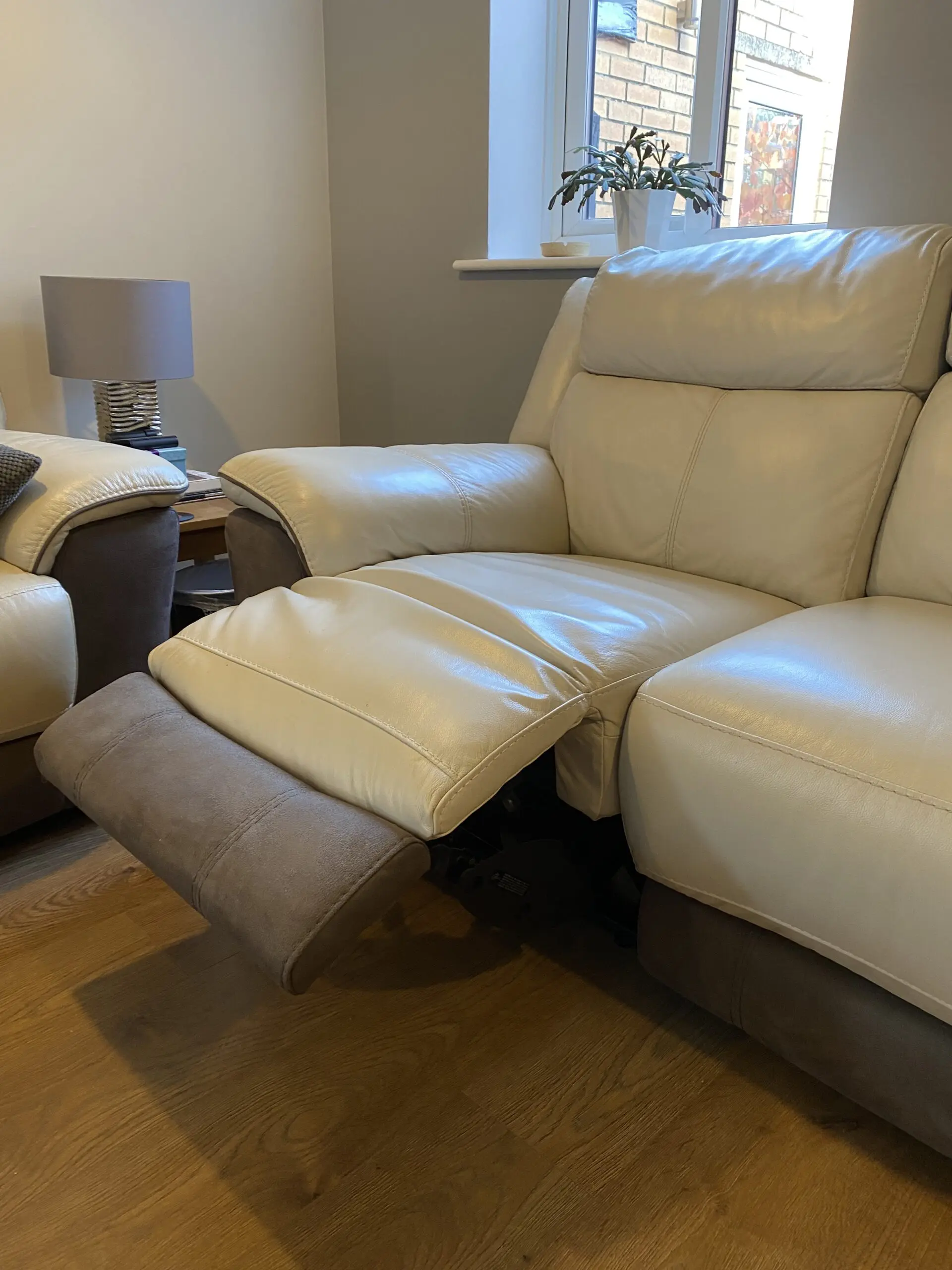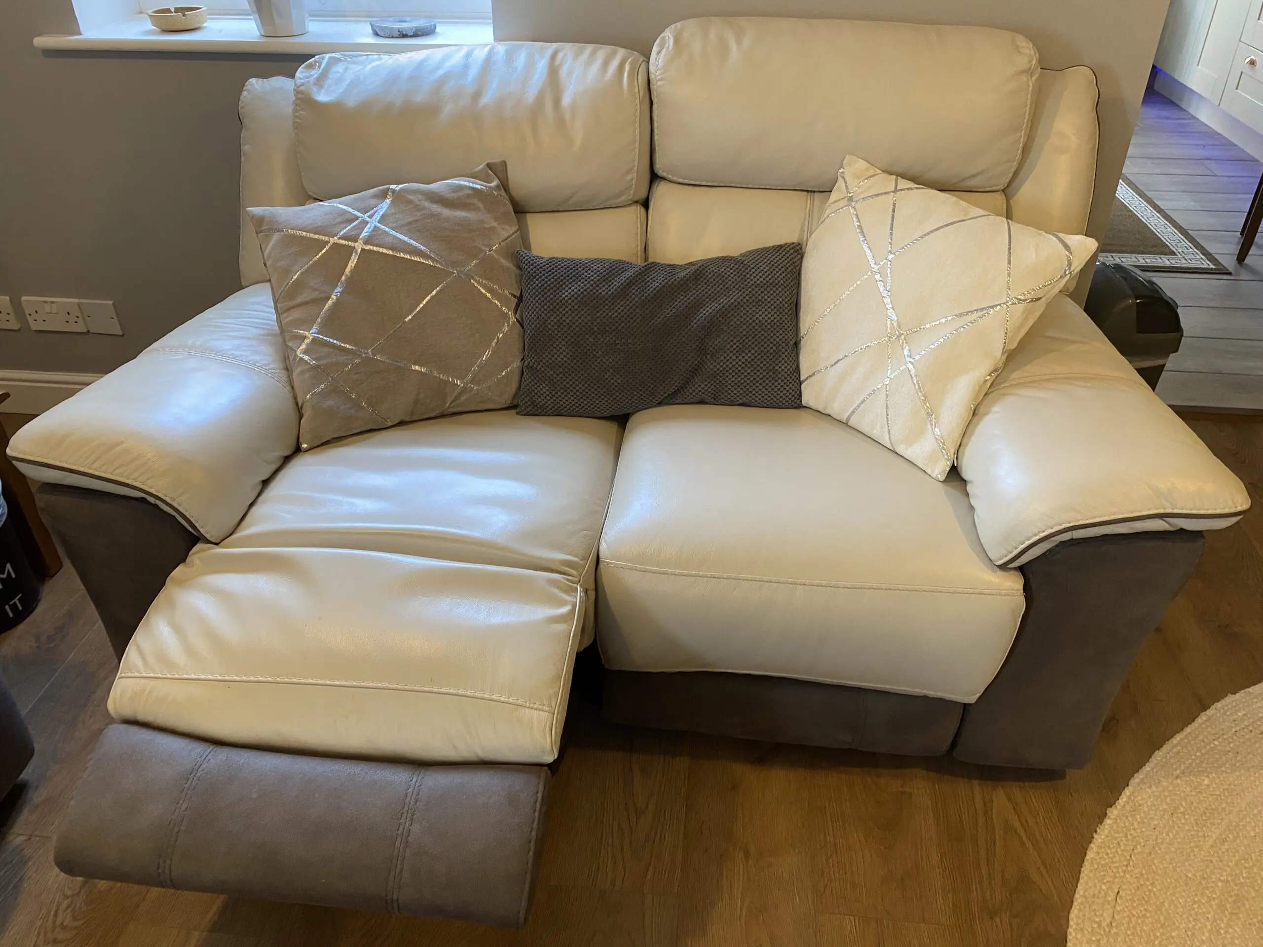 3 Seater leather powered recliner sofa. Cream with grey trim. USB charging points. Used, no tears but has visible wear.