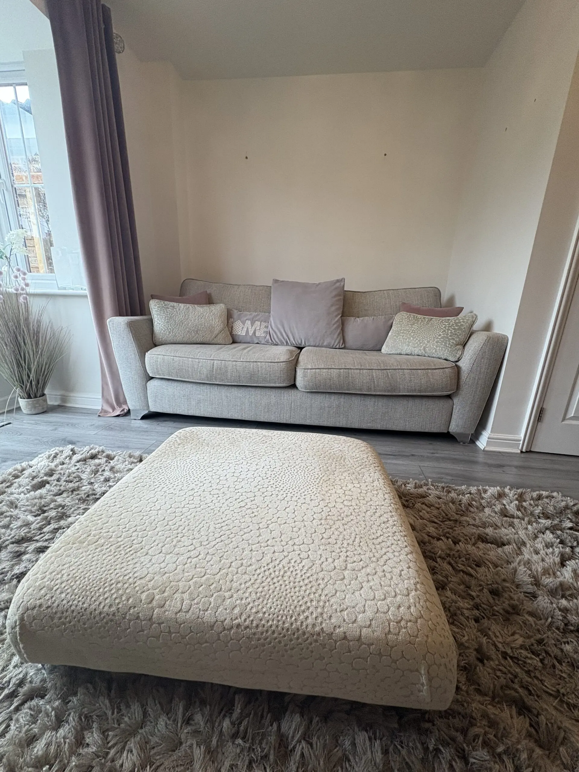 Comfy grey 3 seater settee with matching foot stool and cushions