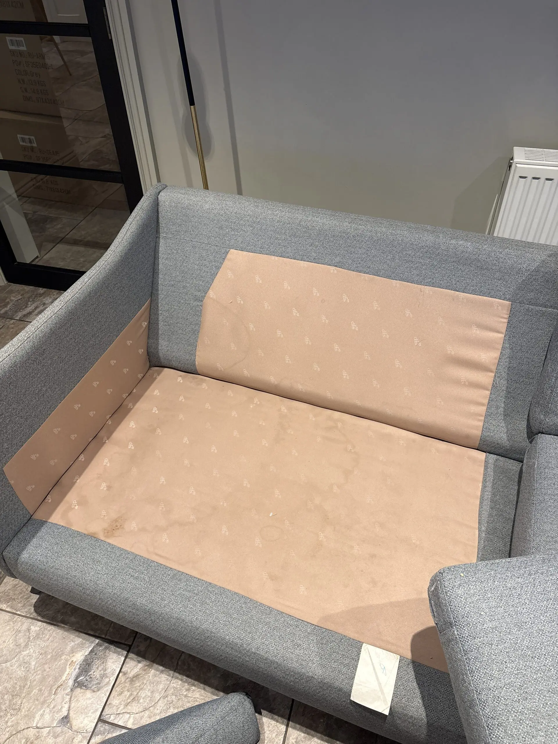 Removeable material that can be washed, good condition. Intermediate floor support missing, some minor stains that will come off after washing