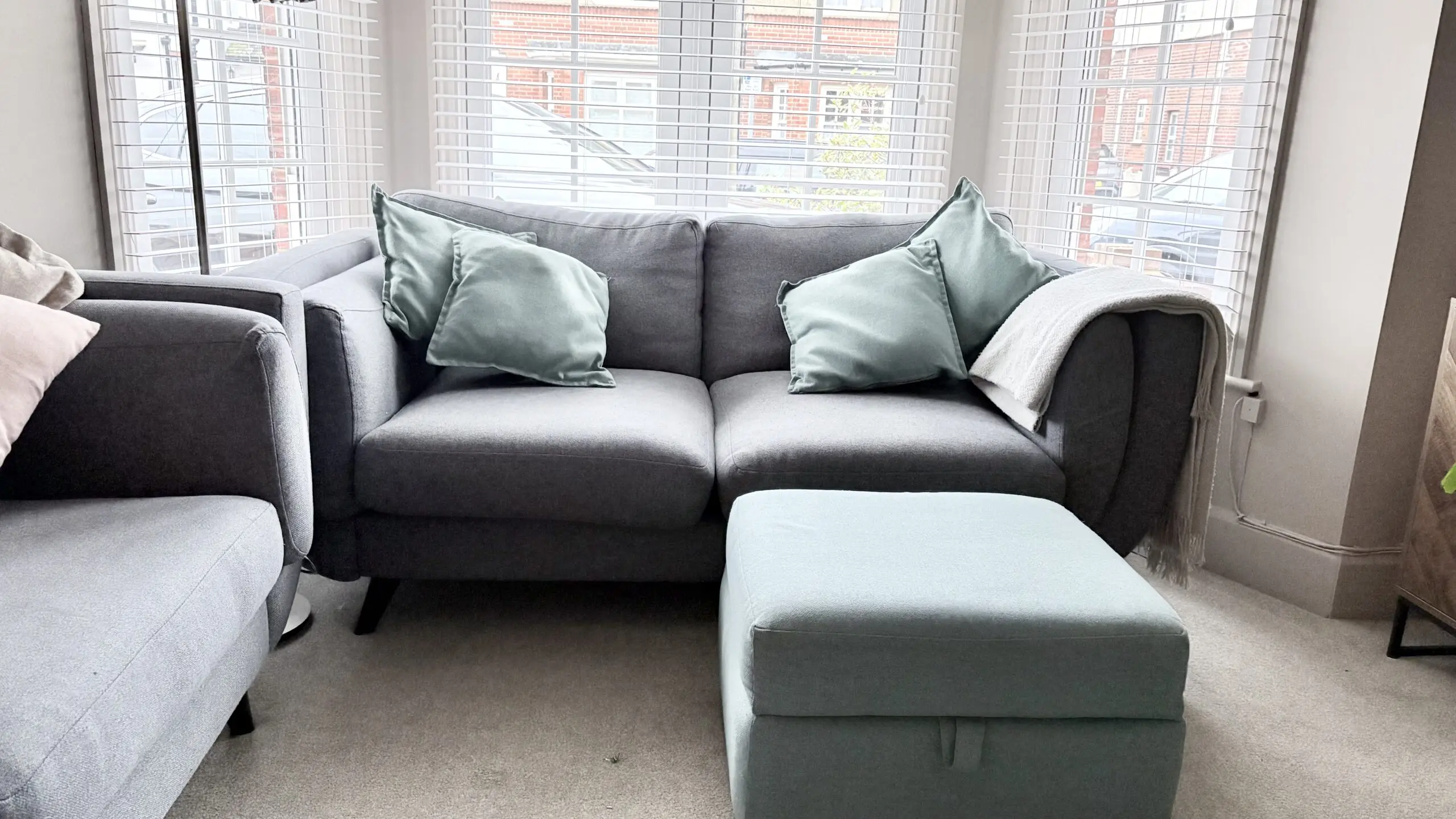 Excellent condition, light use. Matching footstool and cushions in matching teal colour. Treated with Scotchgard.