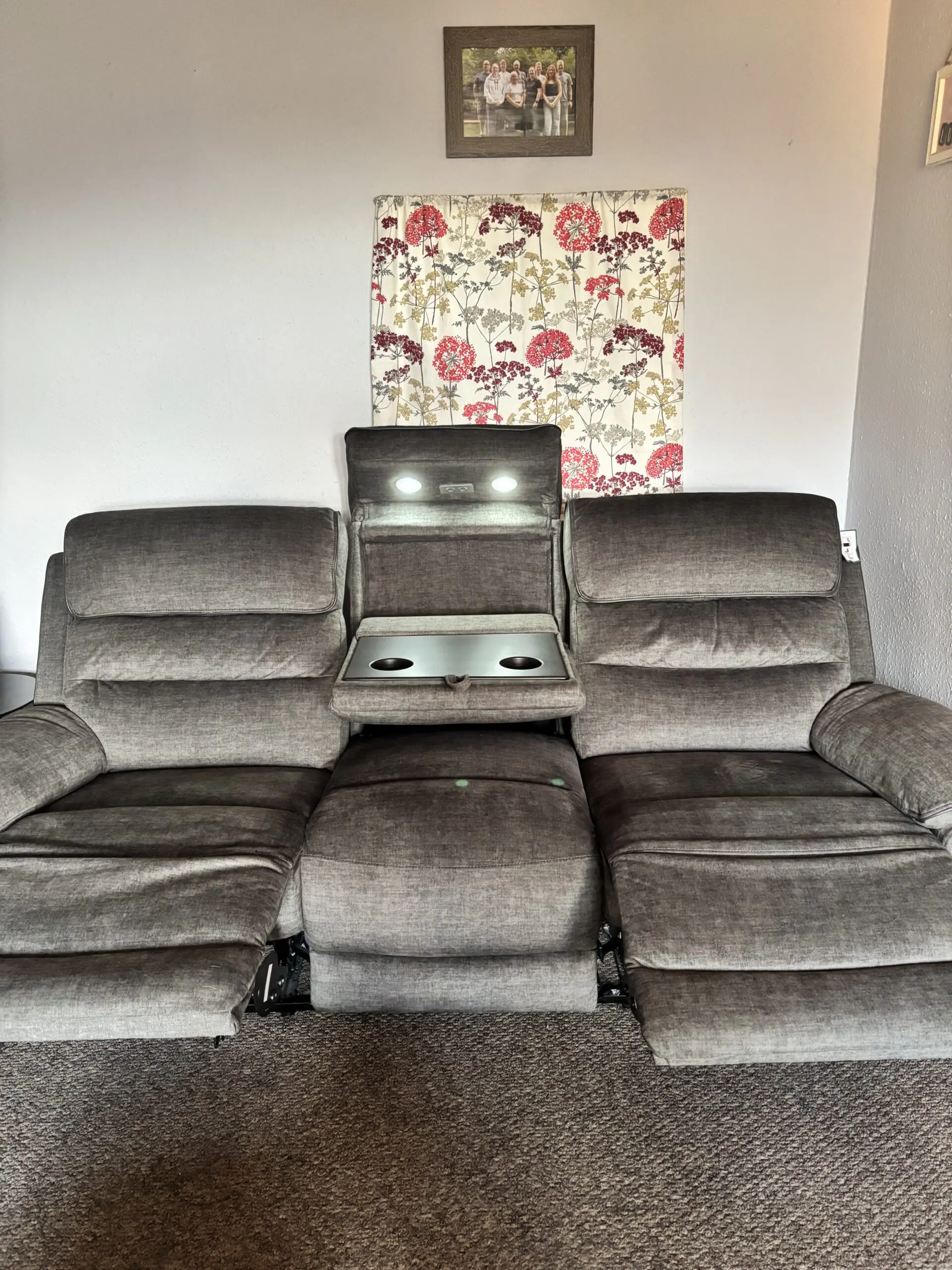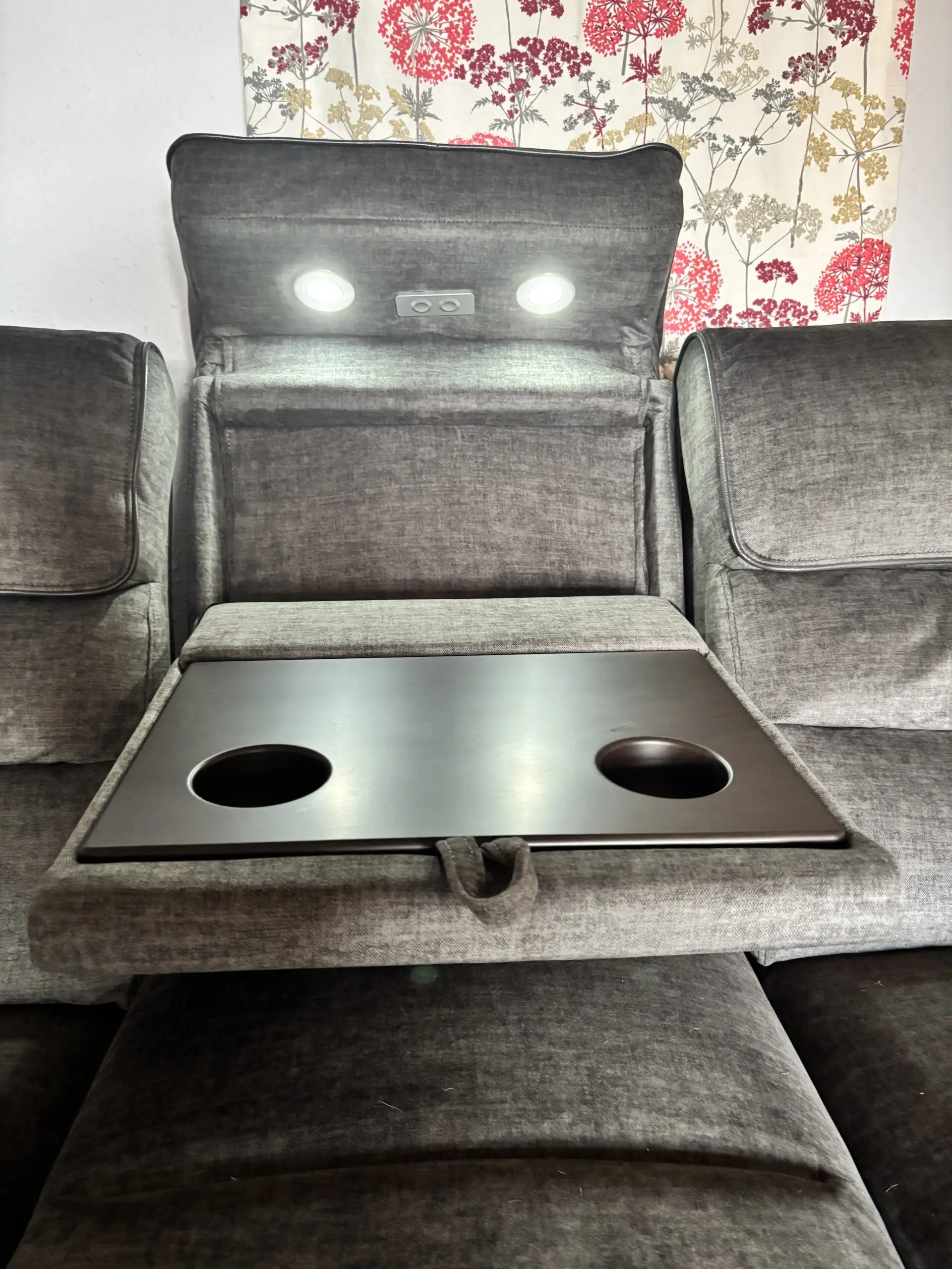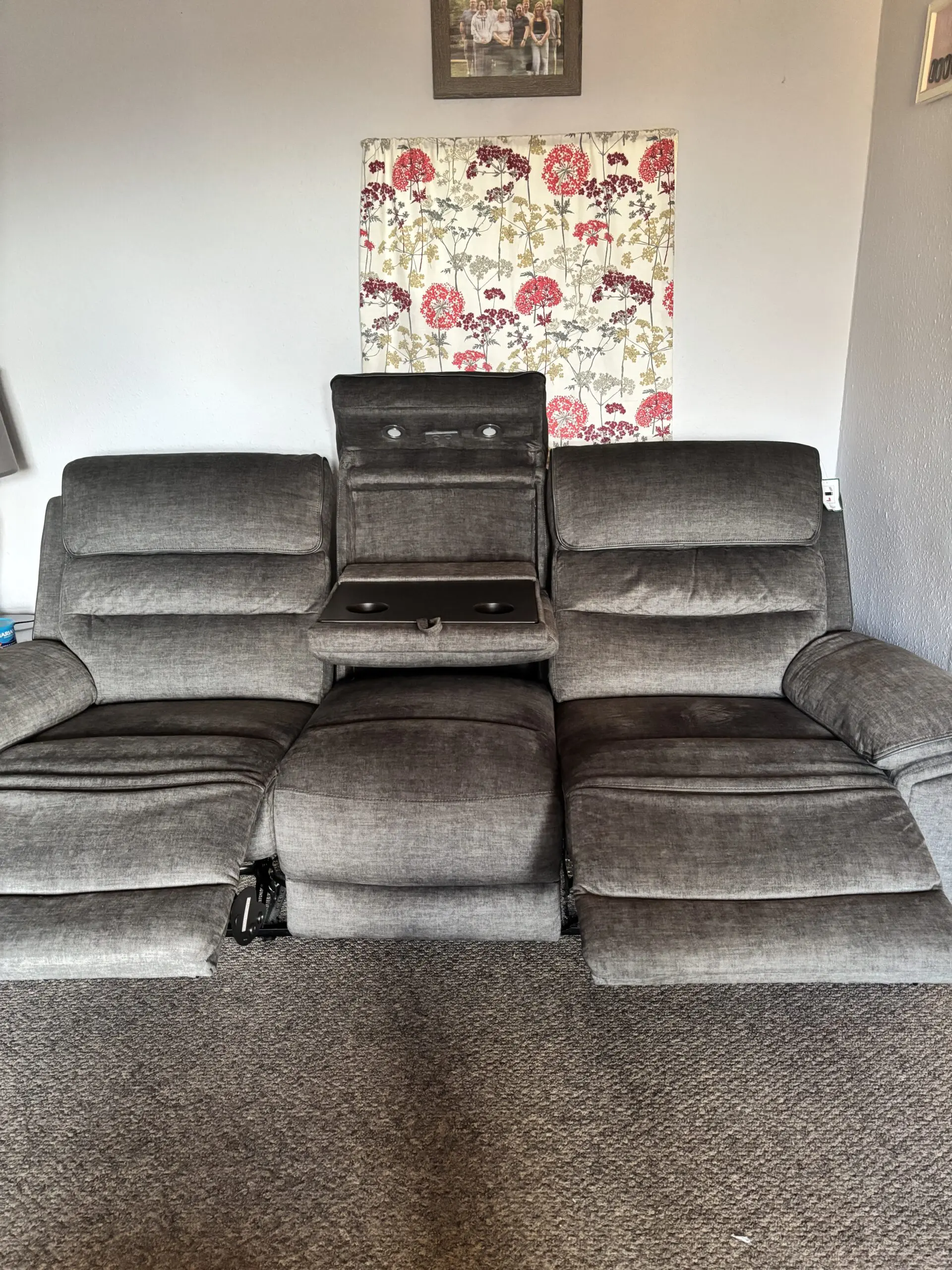 3 seater Power recliner sofa, . Middle chair converts to table with cup holders and reading lights. Both ends have charging usb points however right side not working but does not effect use of the recliner..