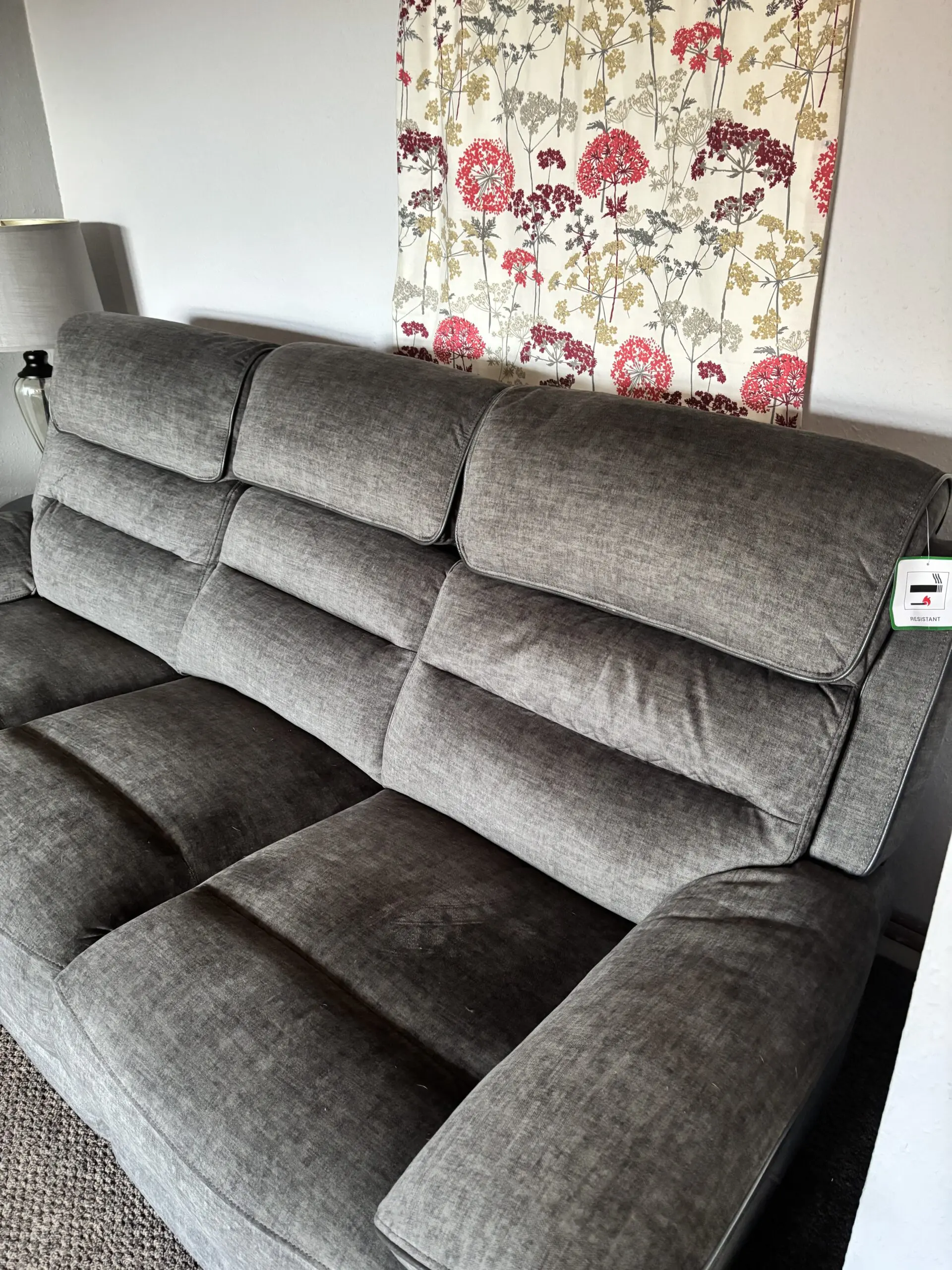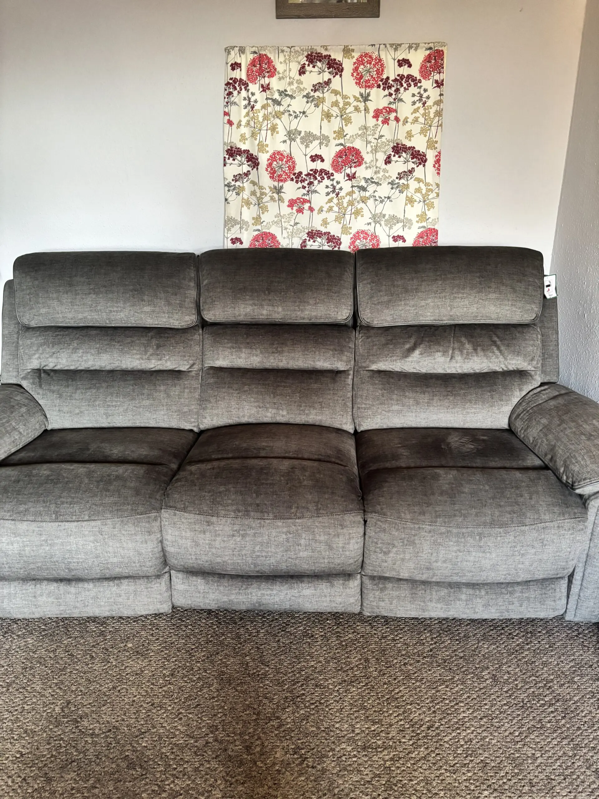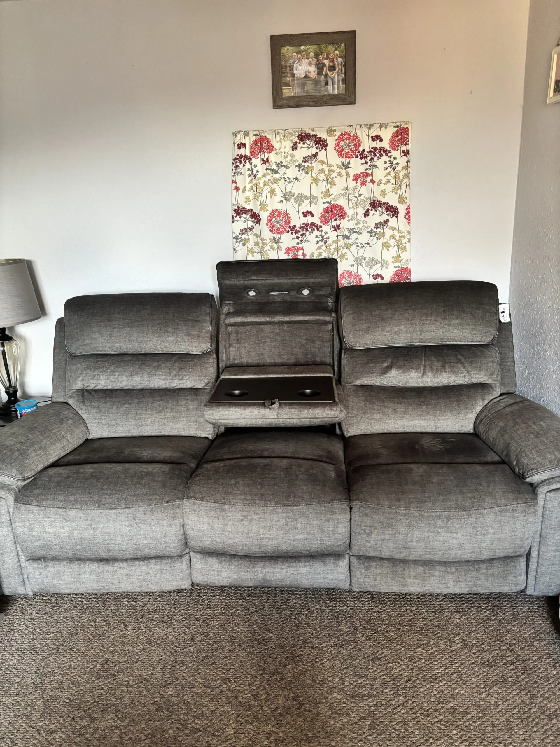 3 seater Power recliner sofa, . Middle chair converts to table with cup holders and reading lights. Both ends have charging usb points however right side not working but does not effect use of the recliner..