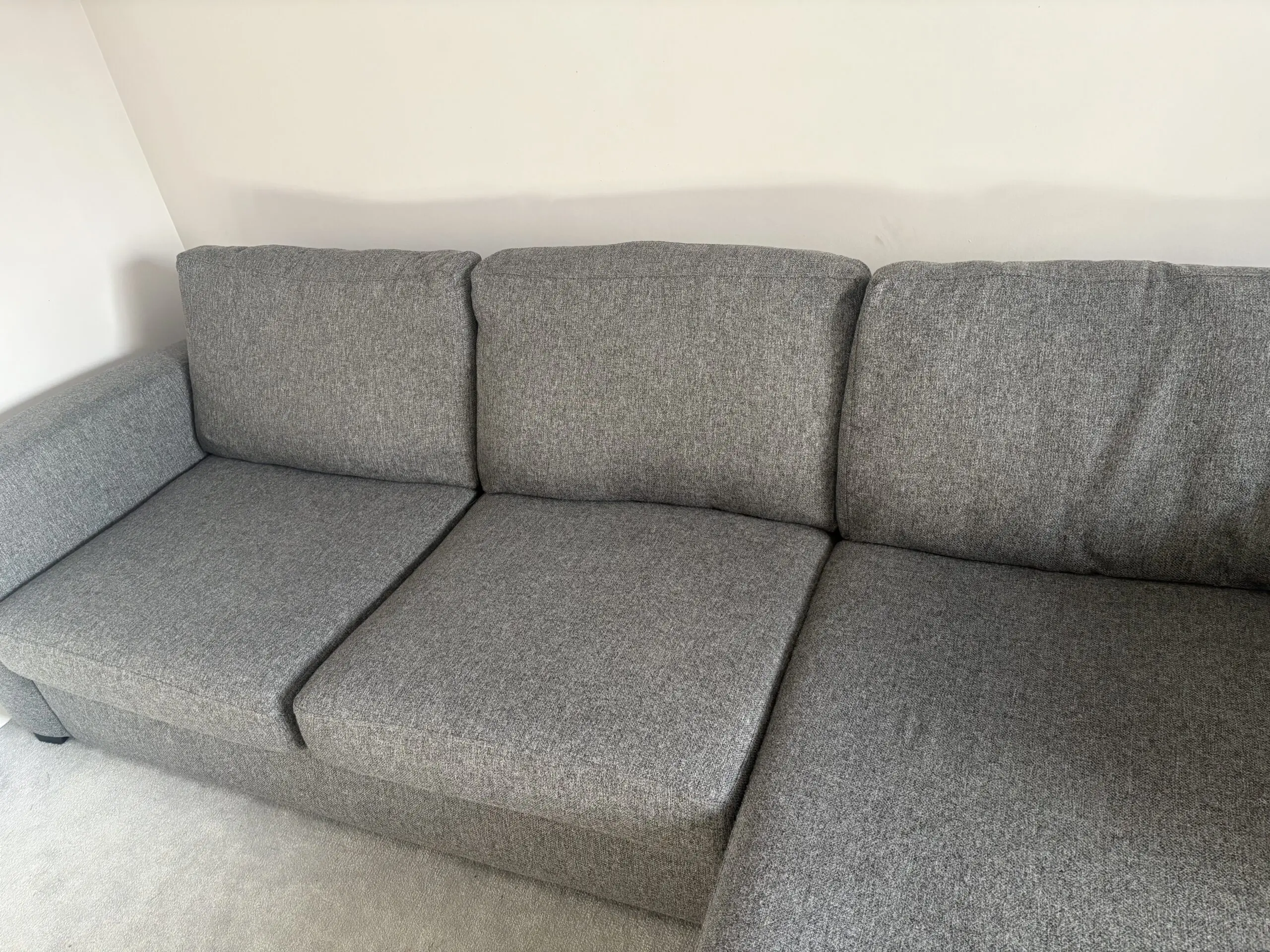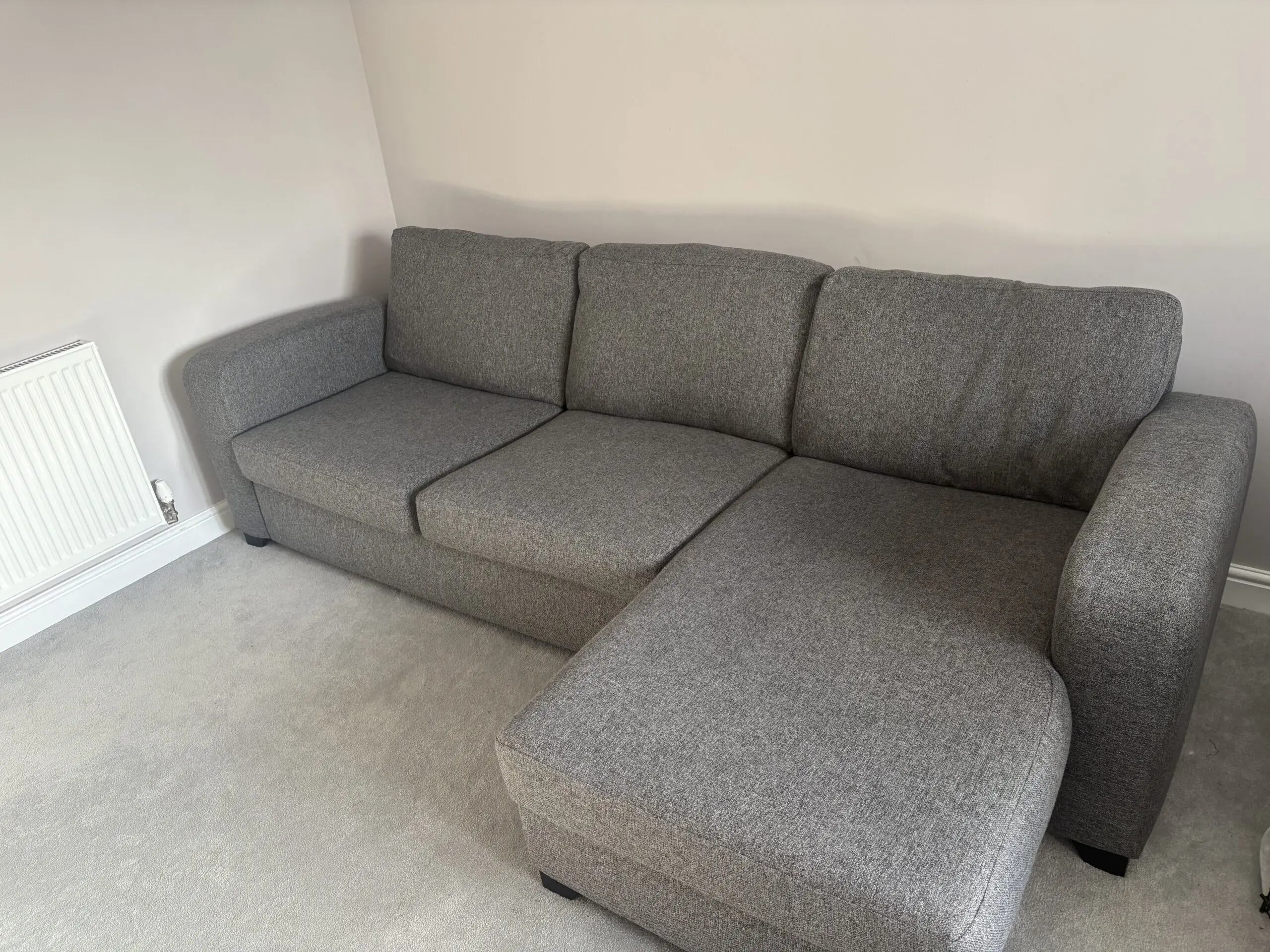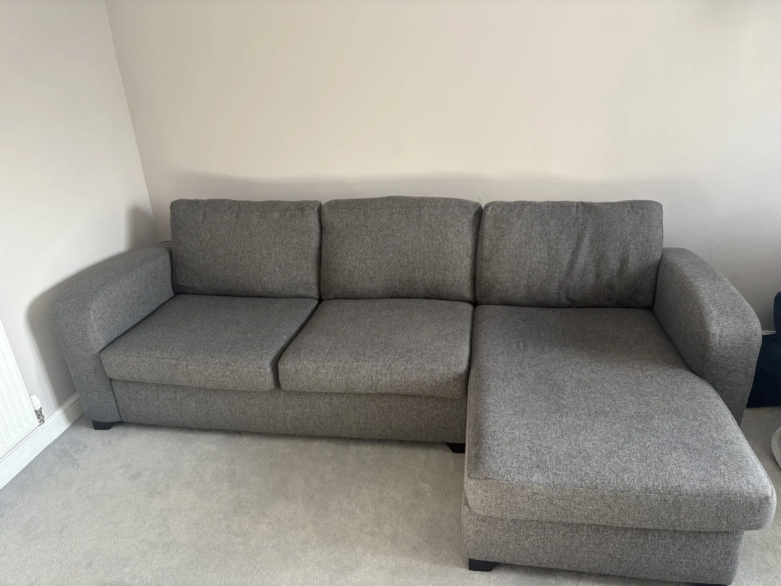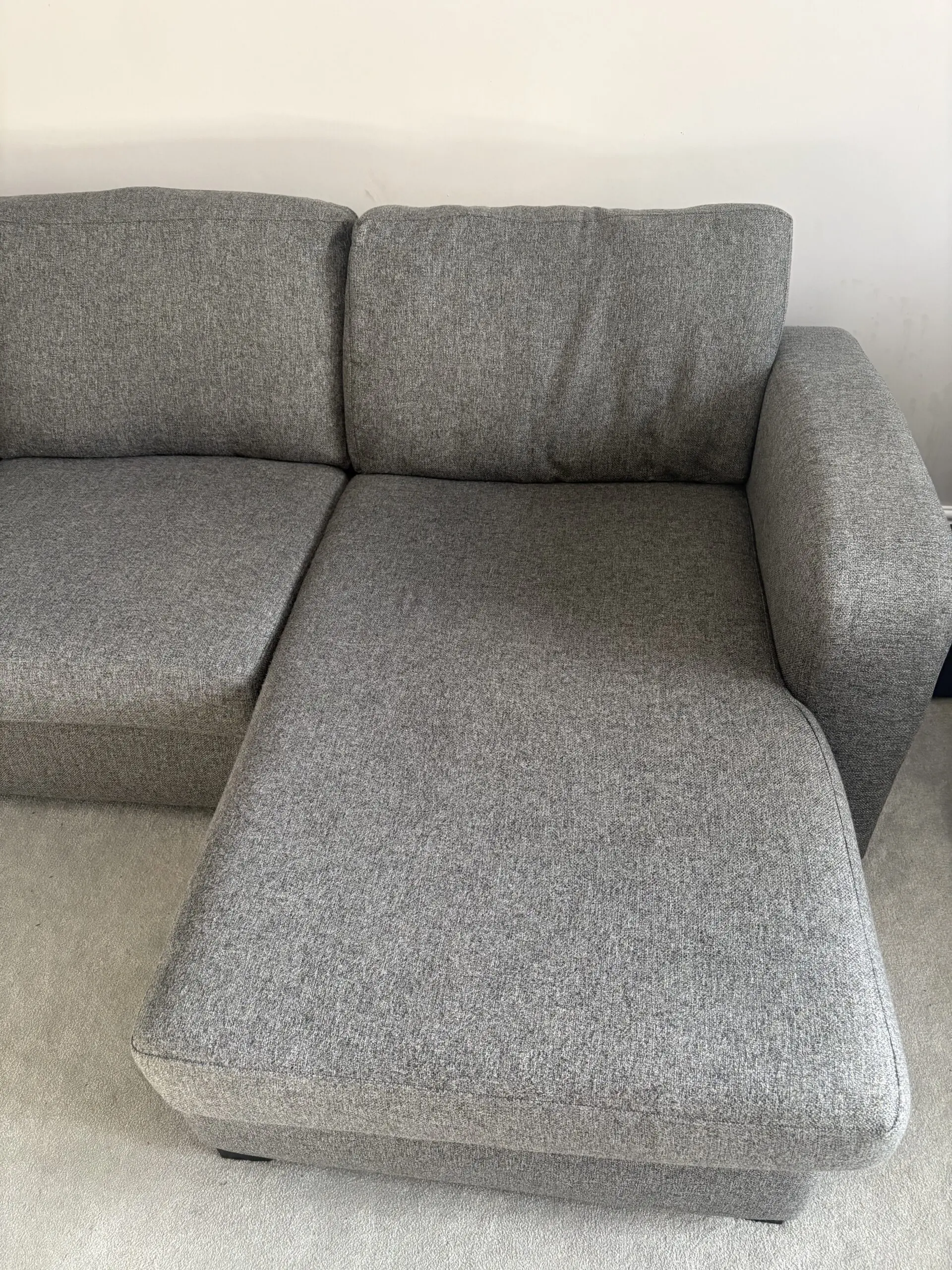 Bought in April 2023, we have ordered a replacement sofa so want to give this a new home. There are elements of wear to the cushions in places such as compressed foam and slight pulls to the fabric but nothing major at all. Great first time buyers sofa. It was also treated with their protection add on so has held up really well to every day life.