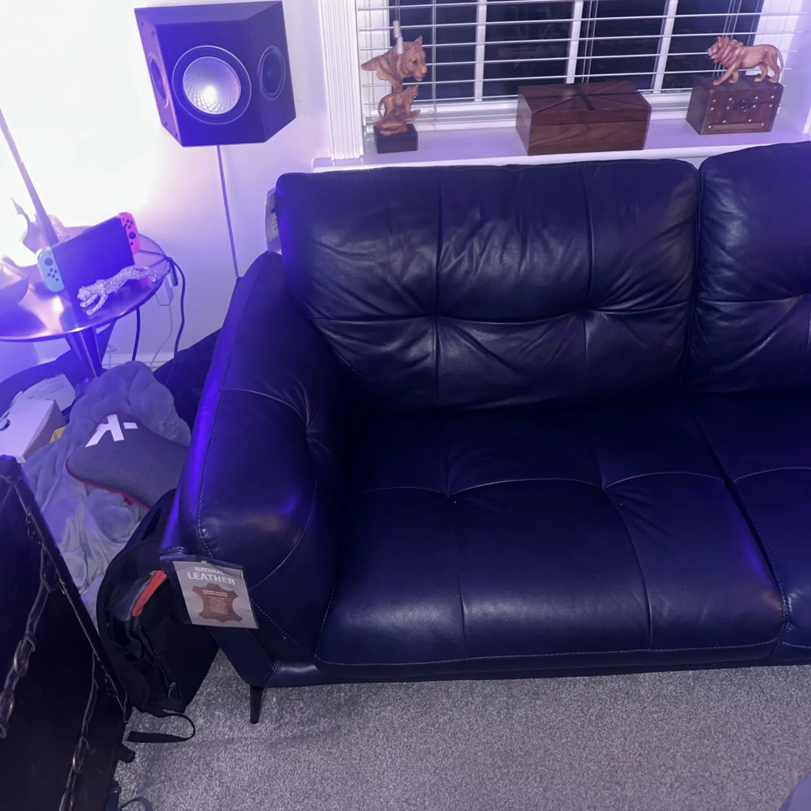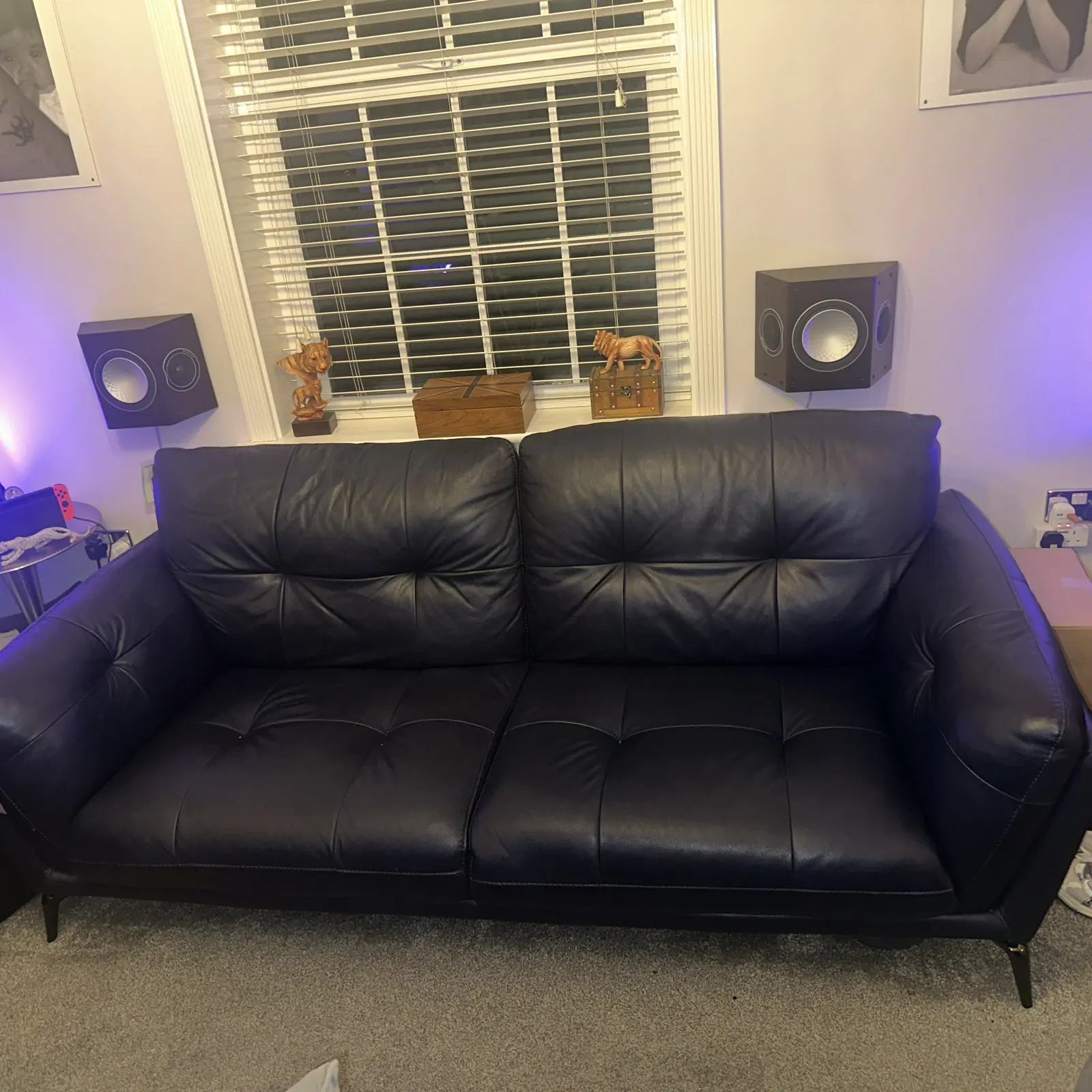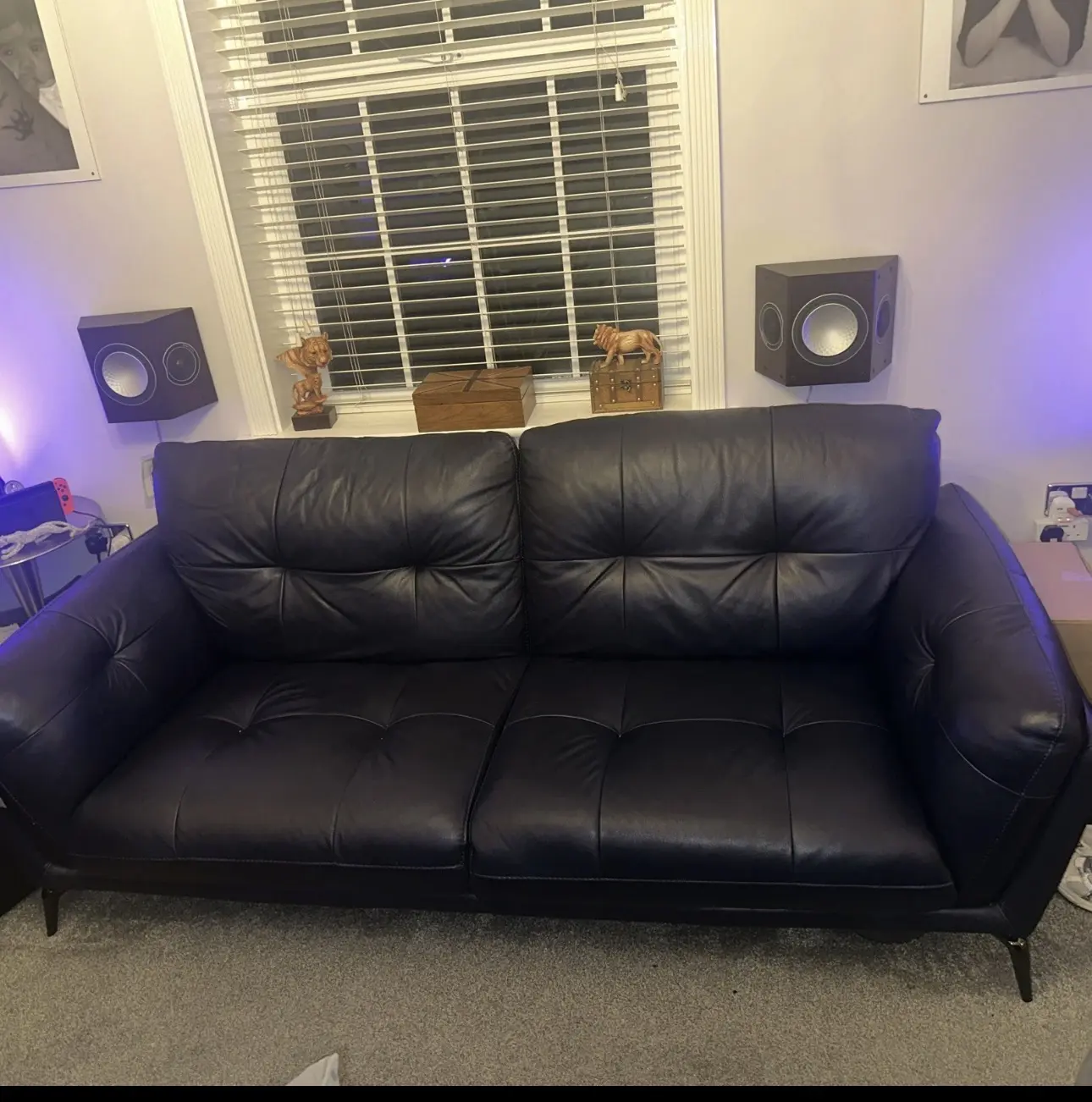 The Harlan Leather Sofa by DFS, is a luxurious sofa With a dark blue colour and wood frame, 3 seater sofa that has hardly been used, selling due to change in circumstances.