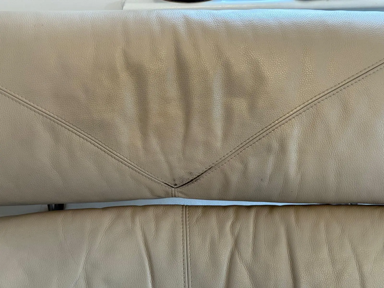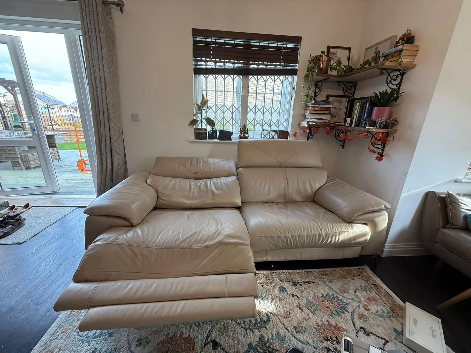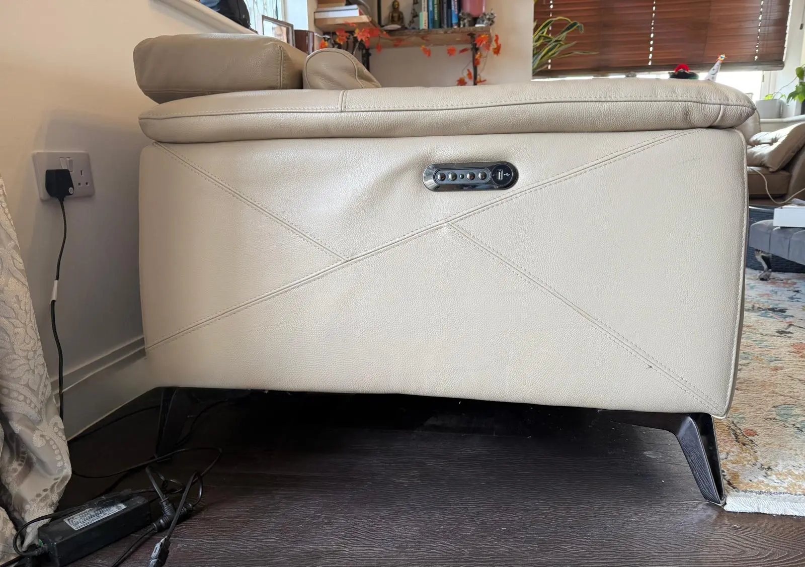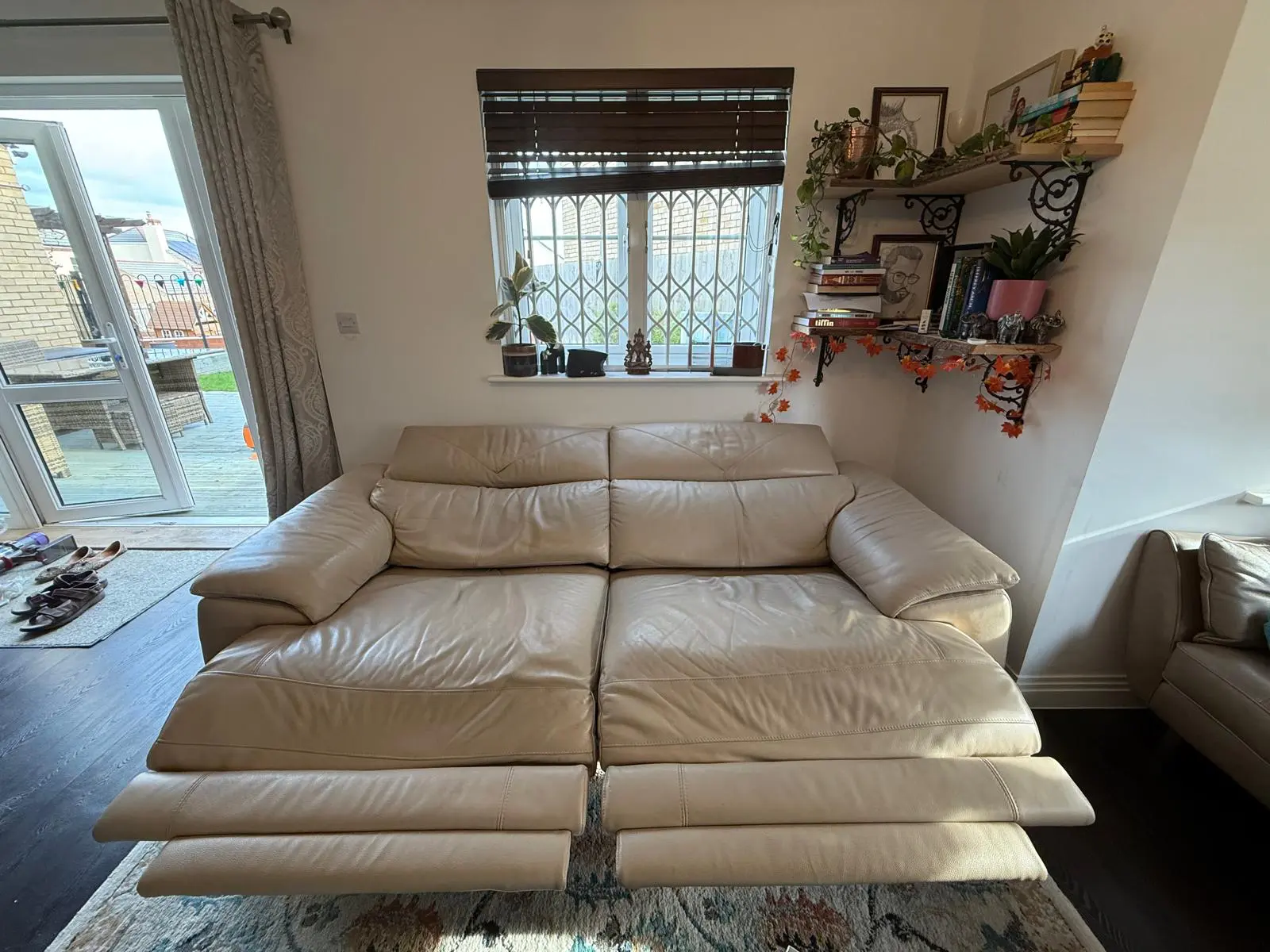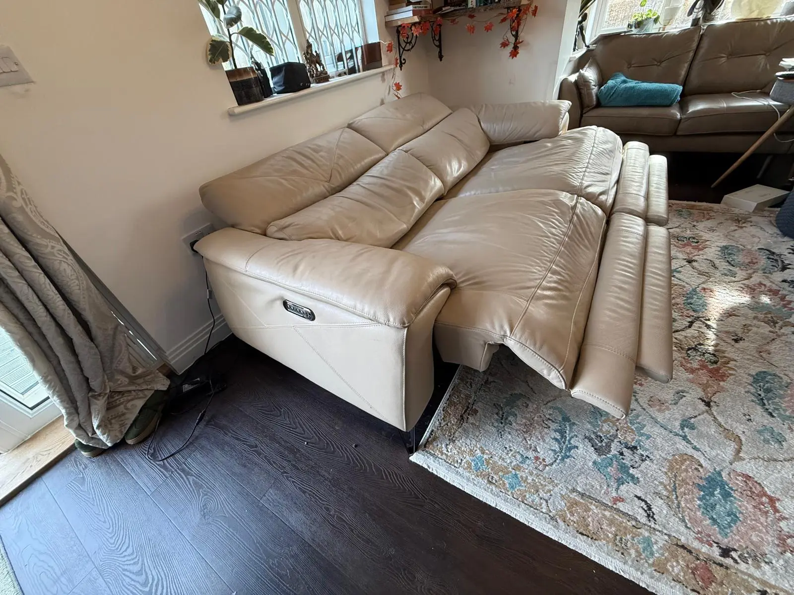 Well looked after leather reclining sofa in stone colour . USB charging posts on both sides . Fully reclined depth 171cm. Available with leather care kit. Small area of wear on one headrest , easily restorable. Price negoitiable.