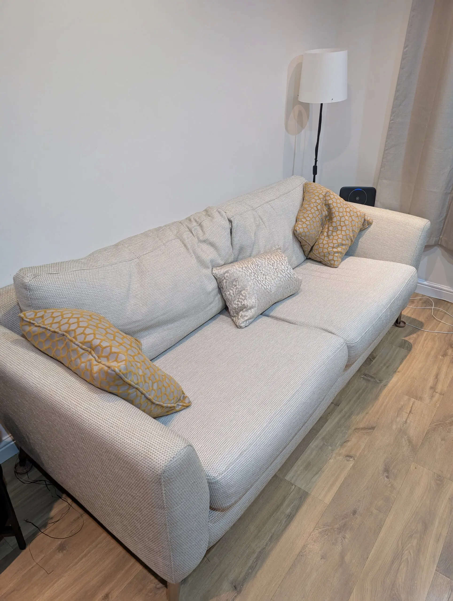 DFS Libby 3 Seater sofa, used with a stain on one of the cushions which means you have to flip one of the cushions. Pillows included, sofa is incredibly comfortable, just decided to go for a corner sofa instead.