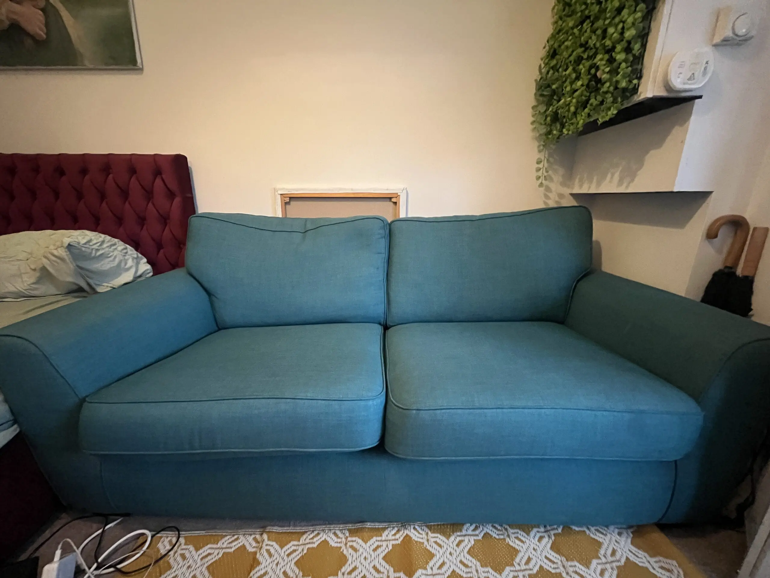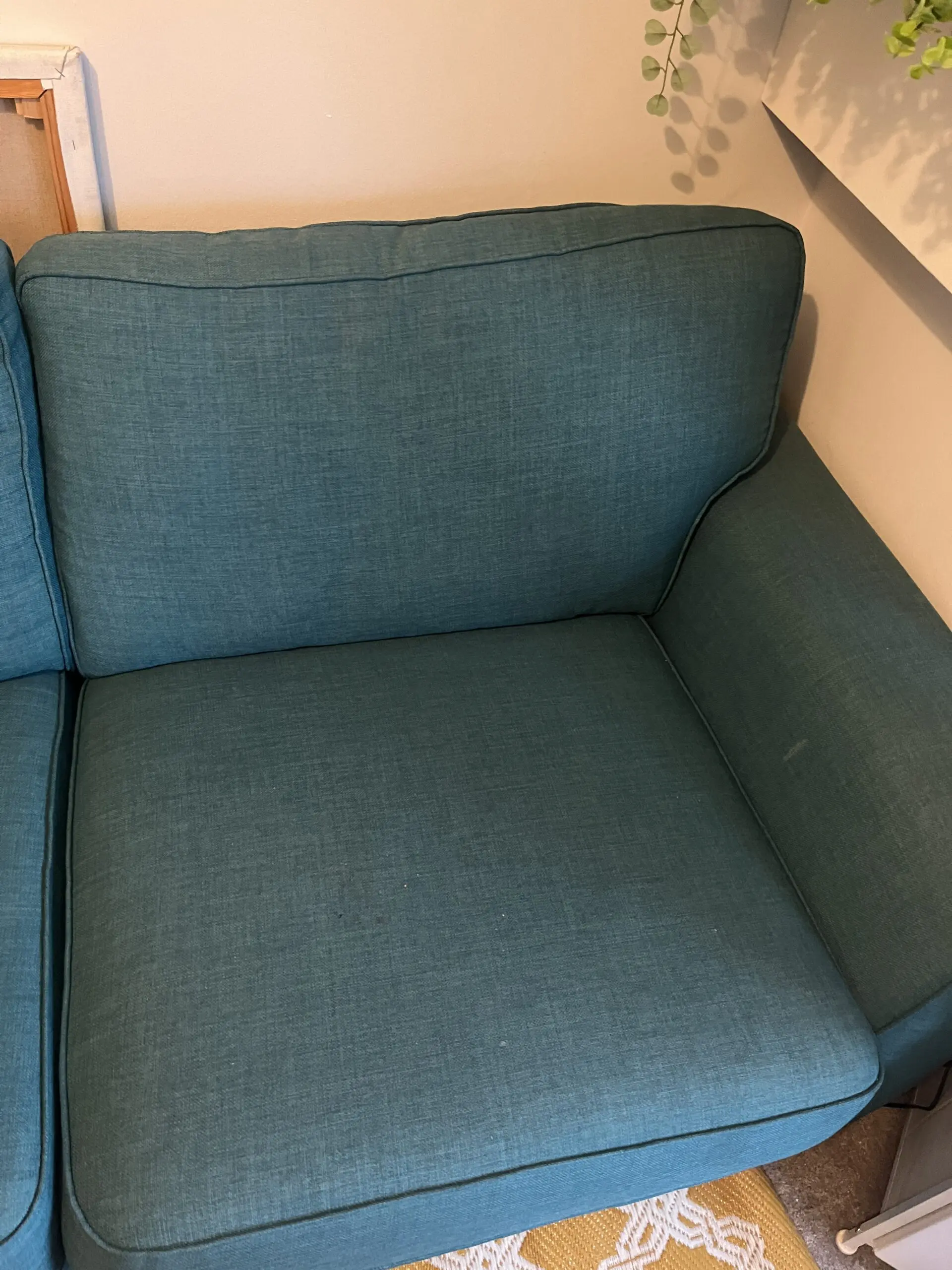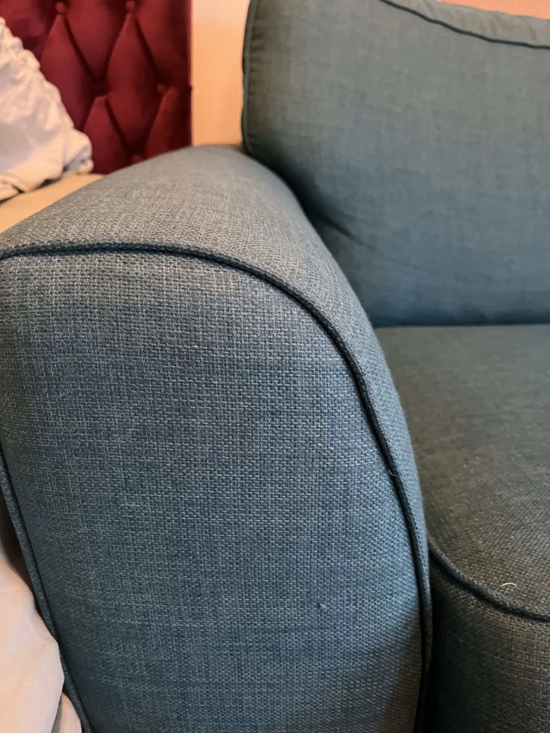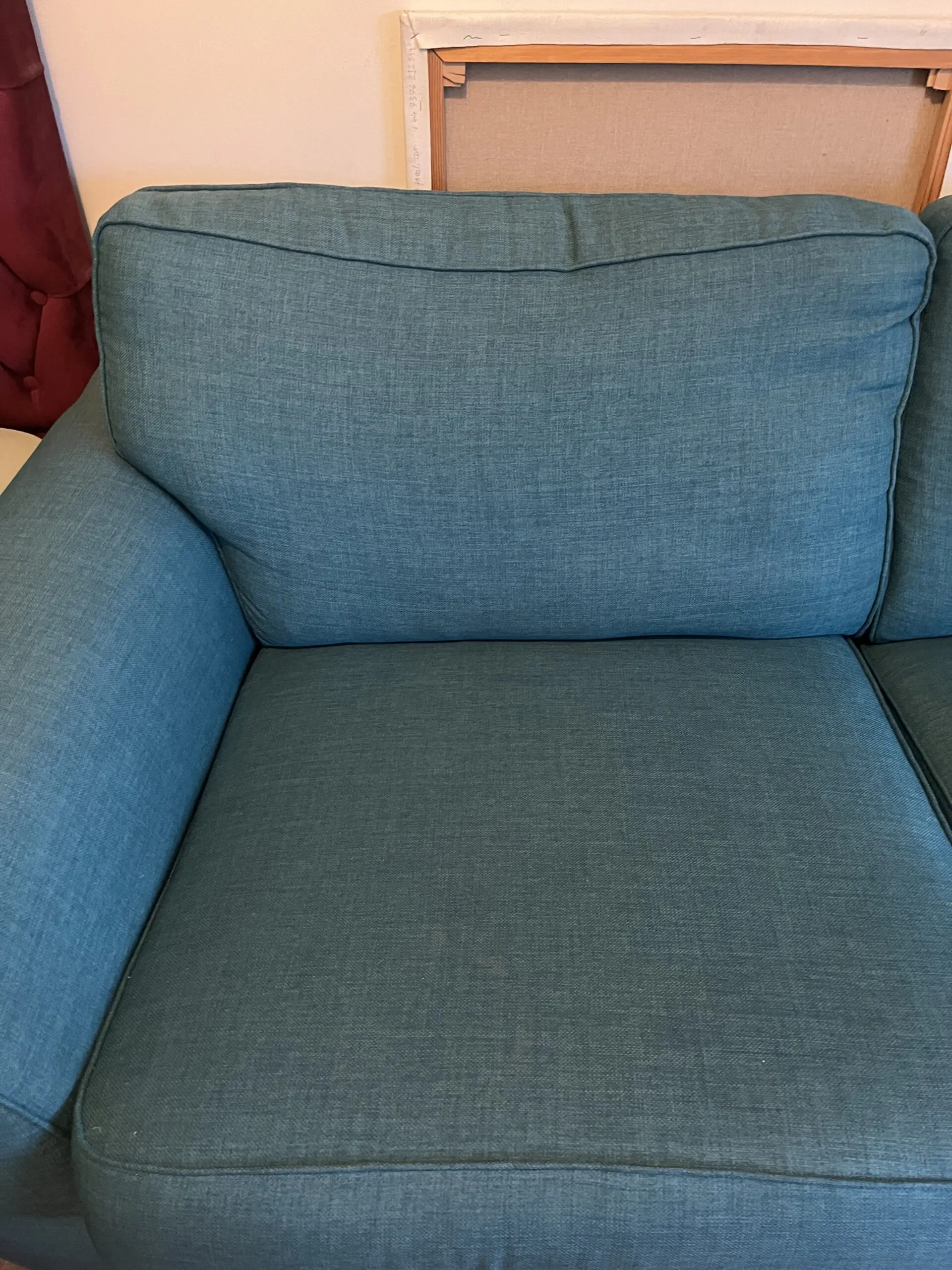 A soft and comfy, special blue sofa that is large, clean and very good quality. The pillows have become a bit soft and so the springs, but it is very nice to sink into and comfortable.