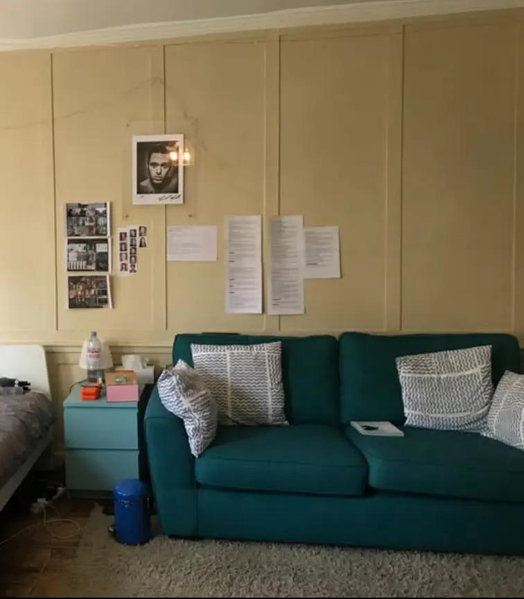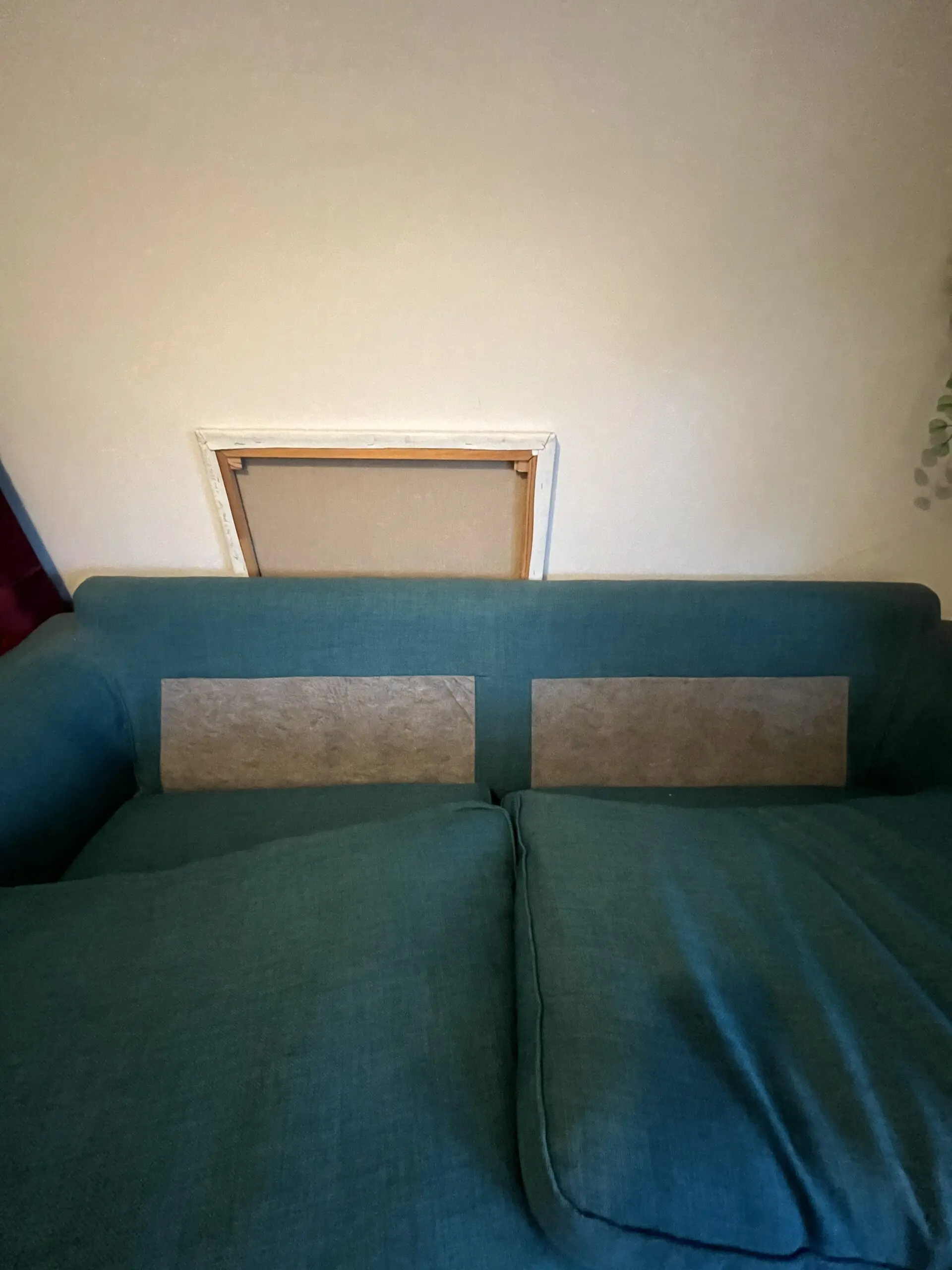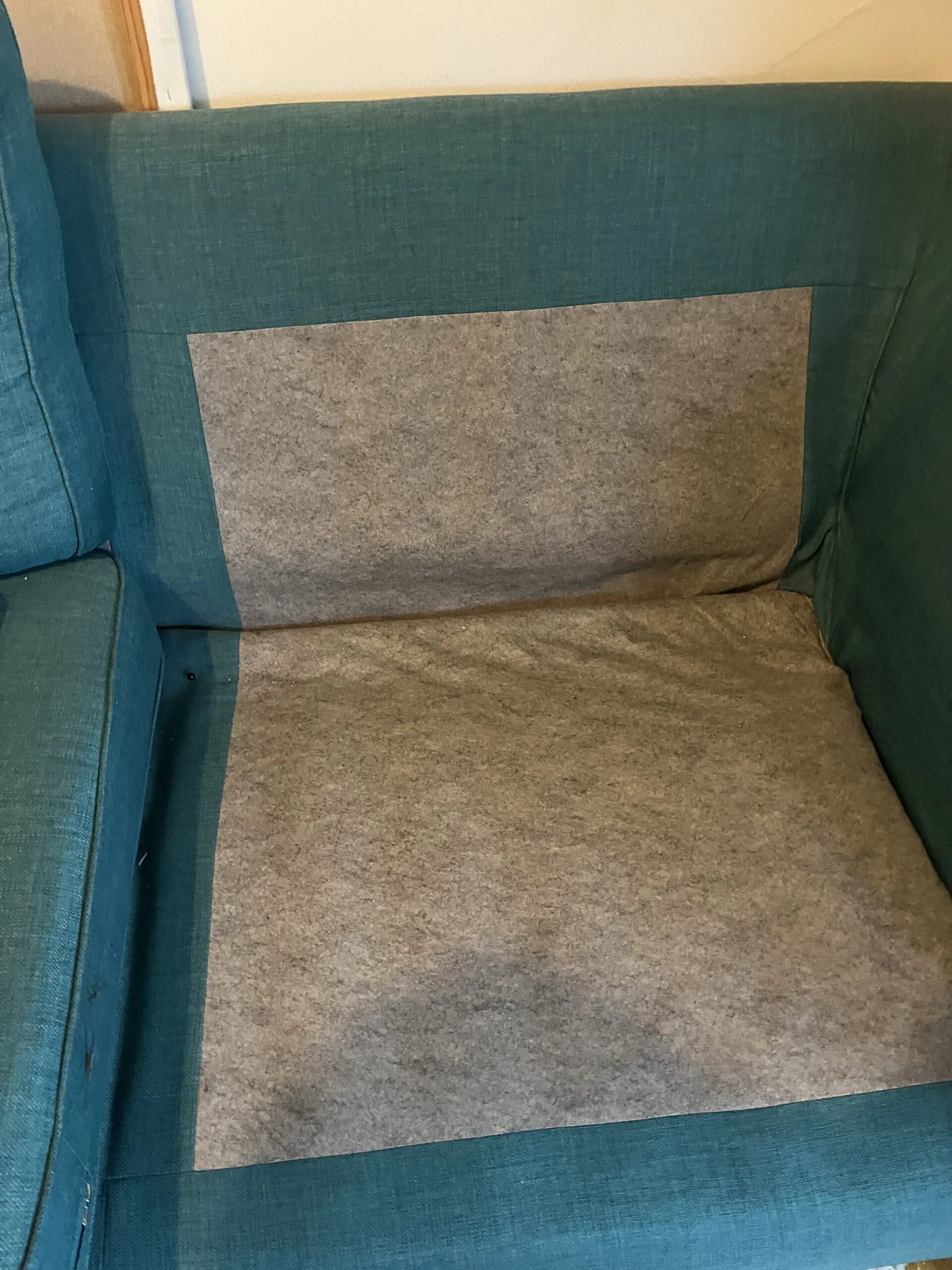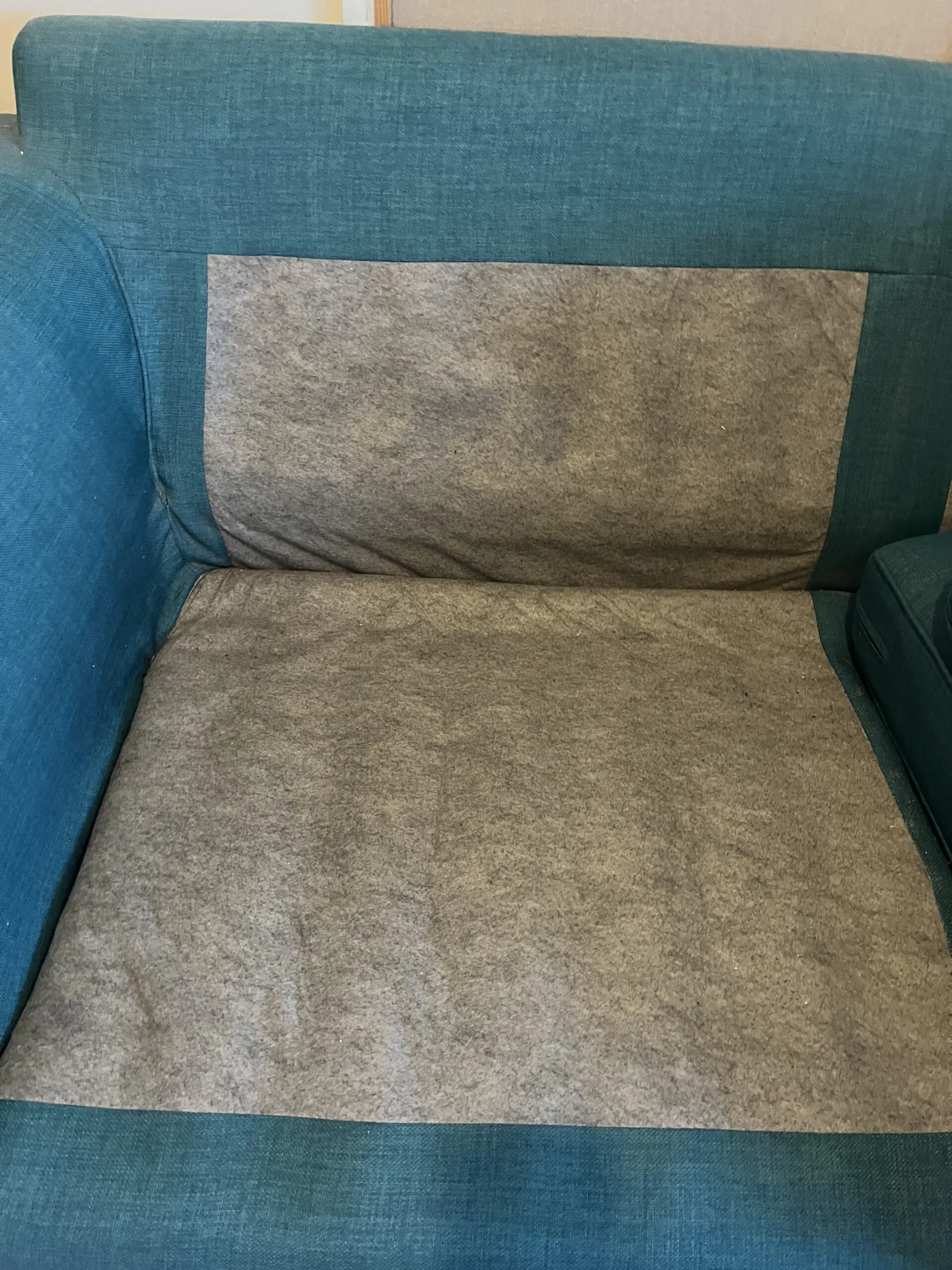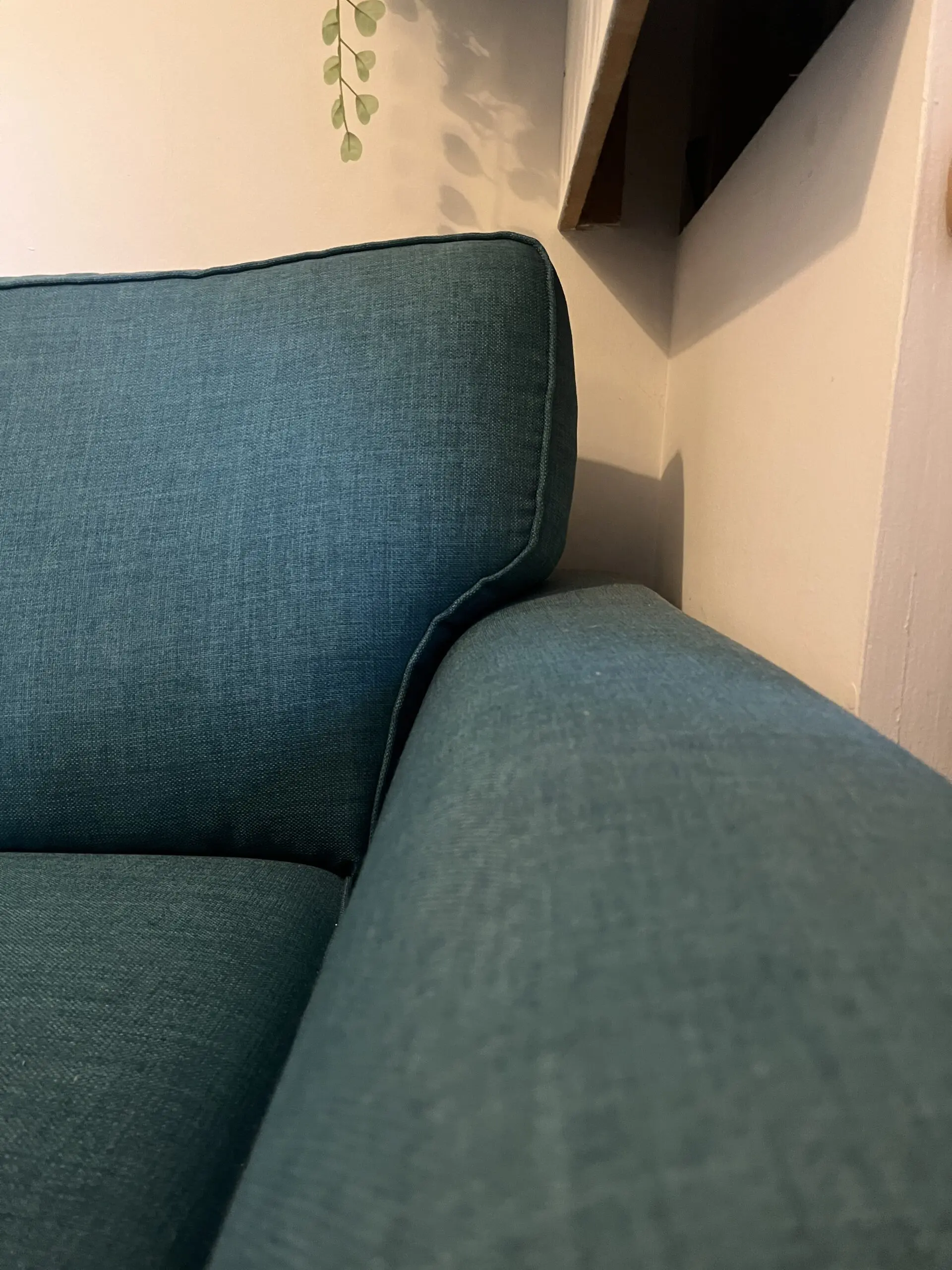 A soft and comfy, special blue sofa that is large, clean and very good quality. The pillows have become a bit soft and so the springs, but it is very nice to sink into and comfortable.