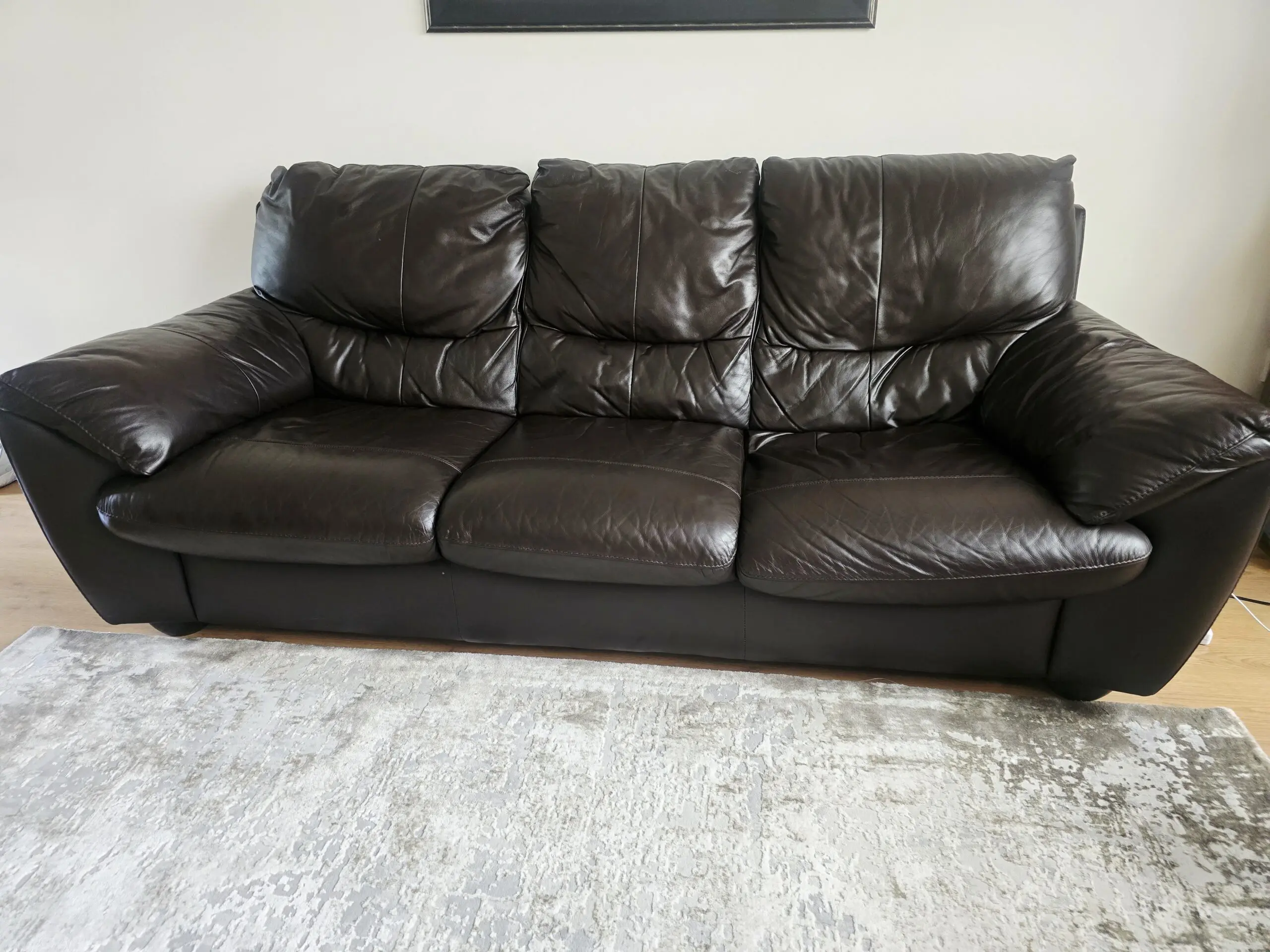 Pretty loved dark brown leather 3 seater and recliner for sale