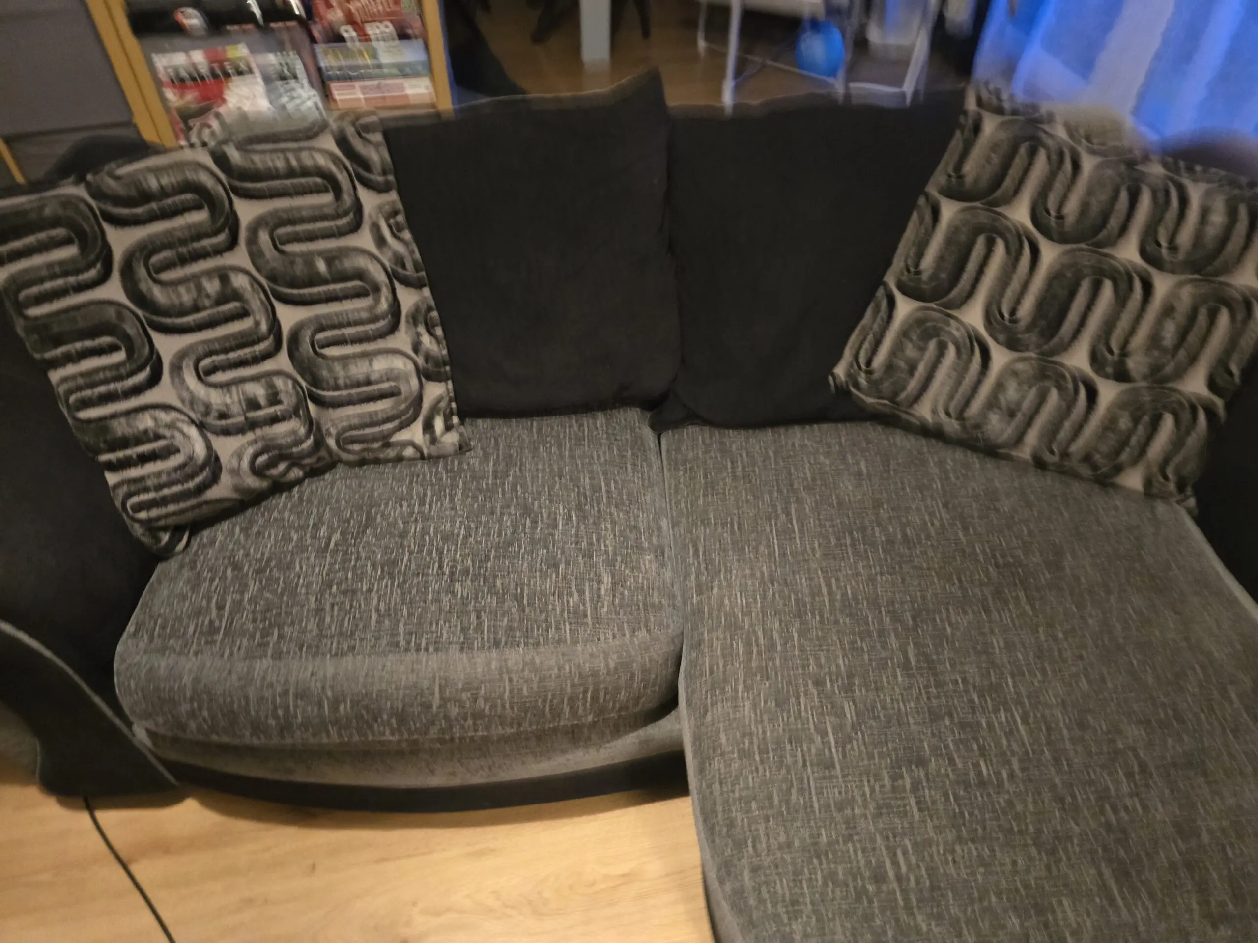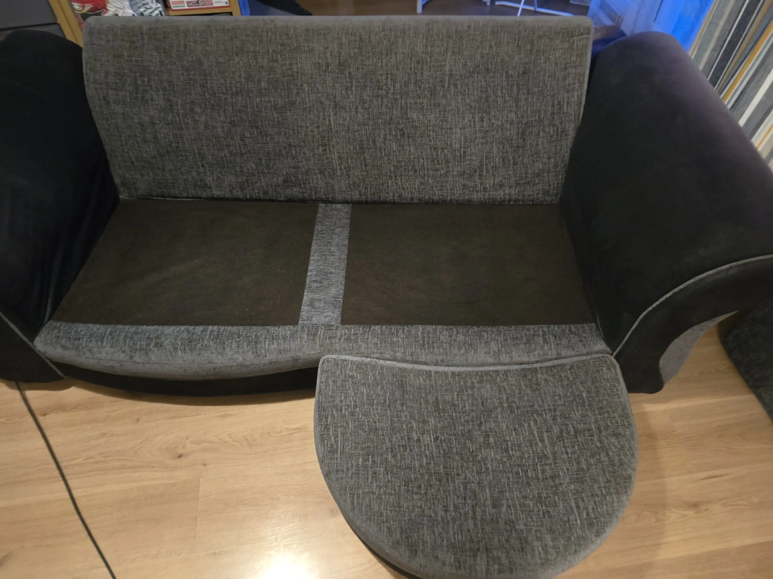 Sofa comfortable seats 3 people with a longer cushion so you can put your feet up. The cushion can be used in either sides and had a footstool underneath. The left arm has somewhat faded due to sun damage.