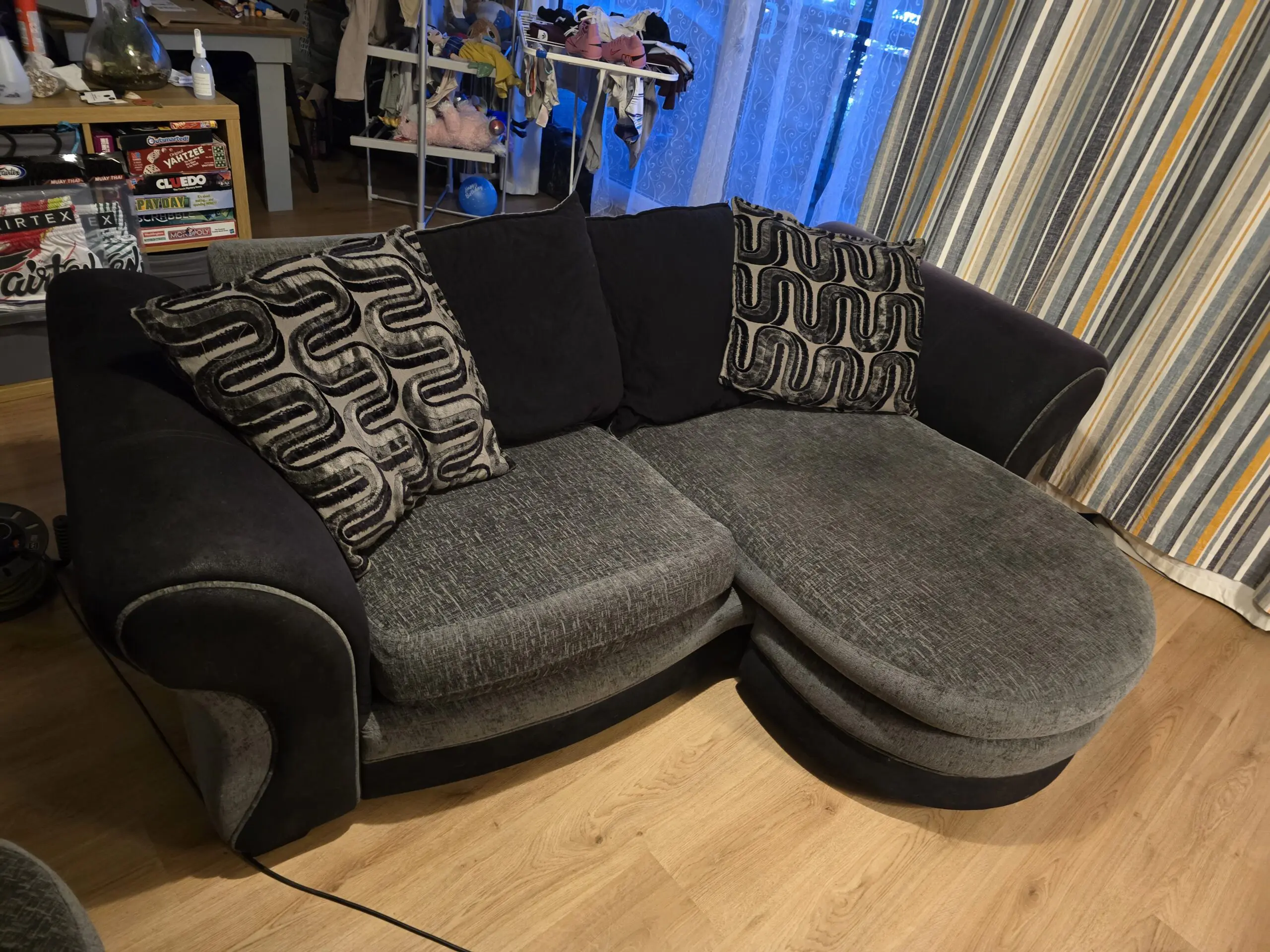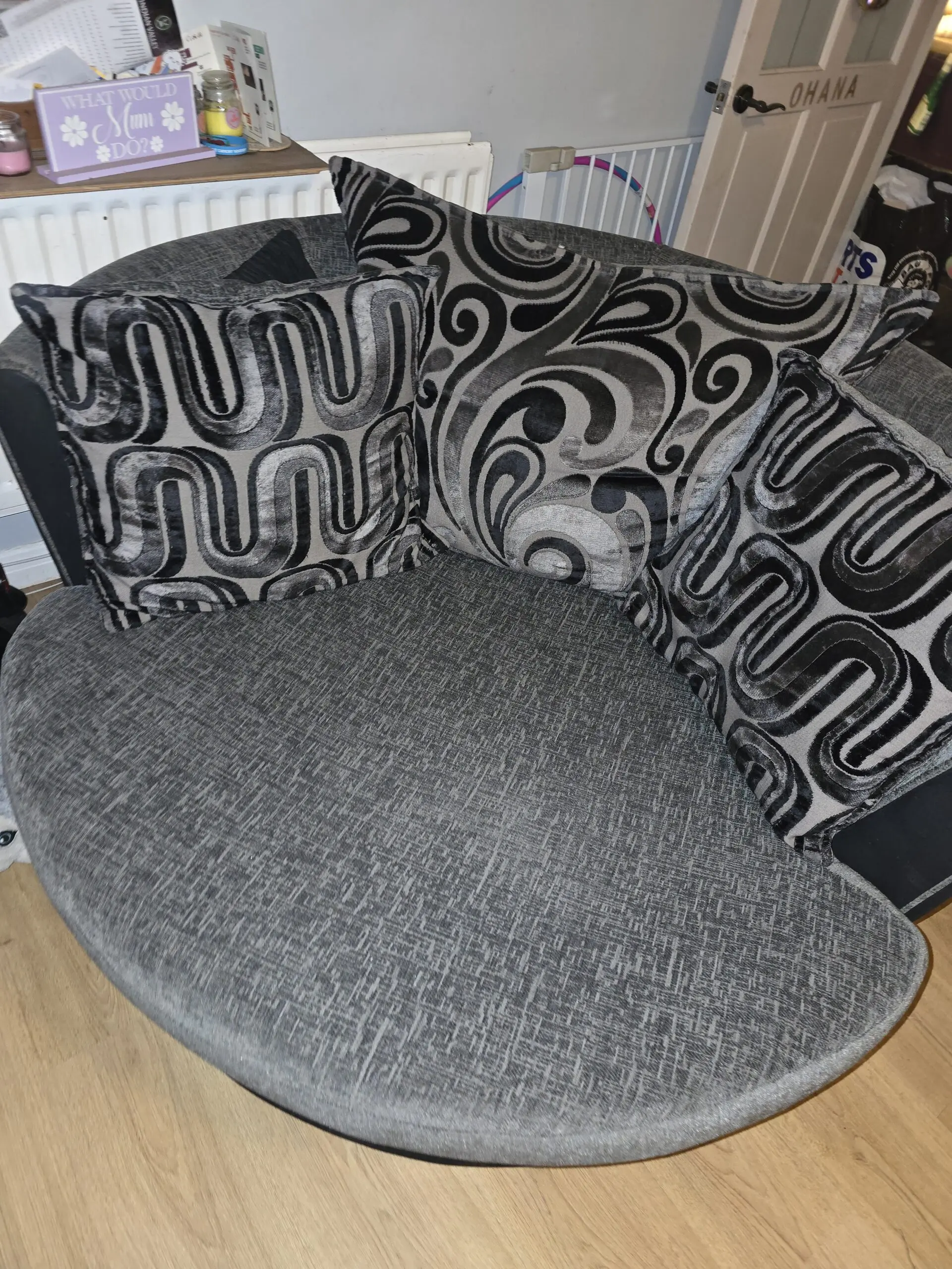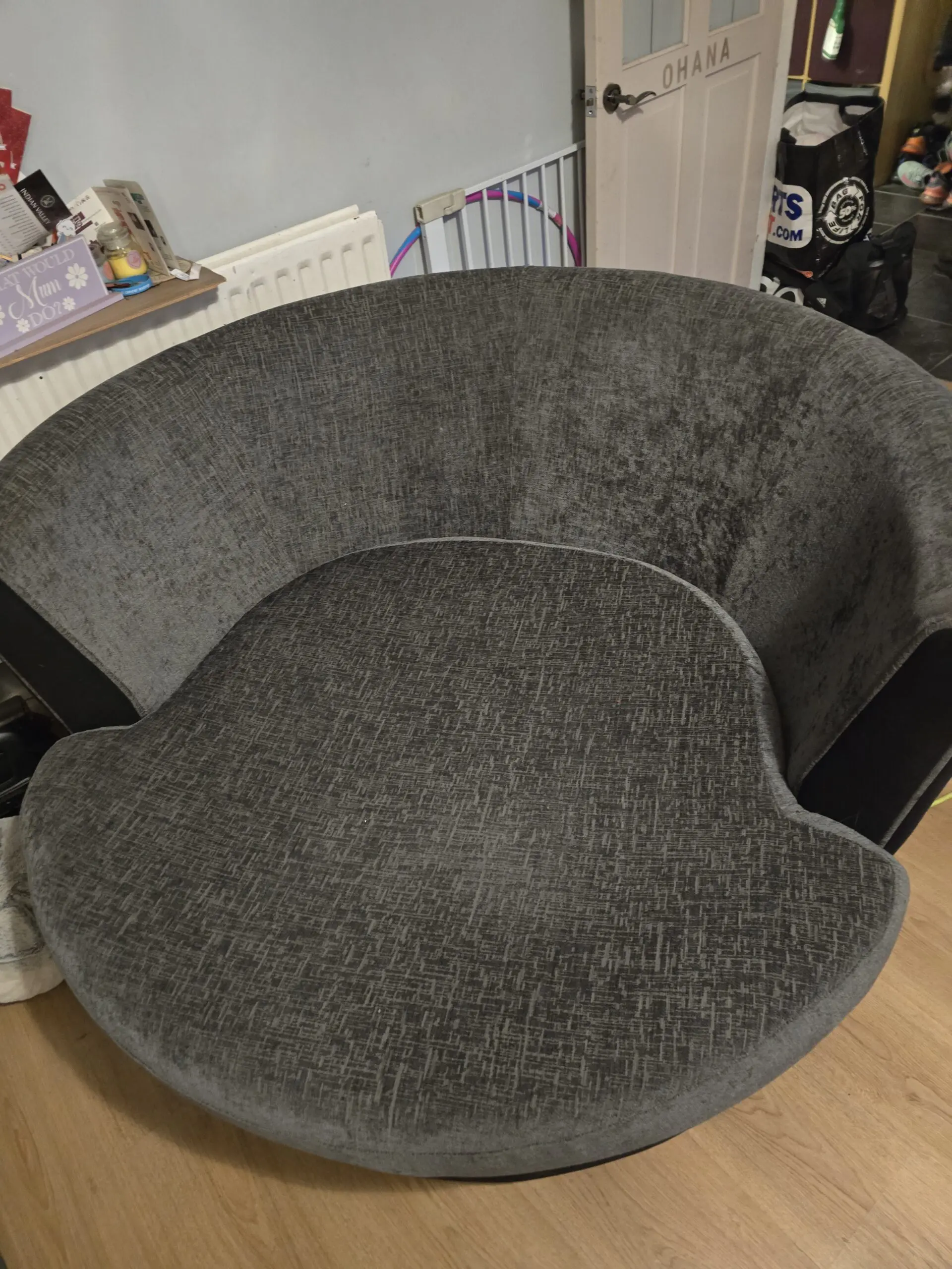 The large swivel chair seats one cosily like a hug chair but will easily fit 2. Still swivels perfectly well. Swivel chair has a slight imperfection where the stitching is coming apart but easily fixed.