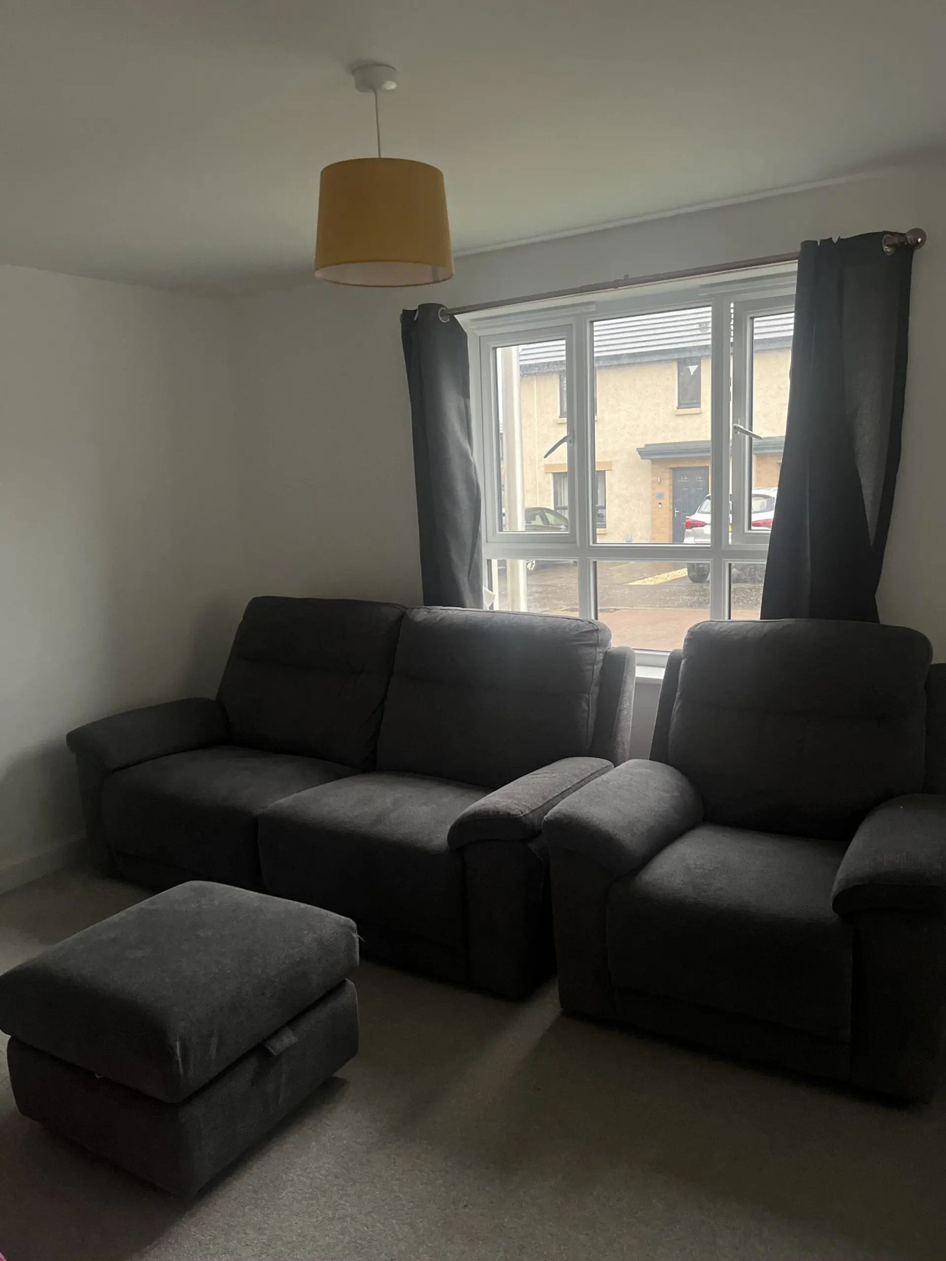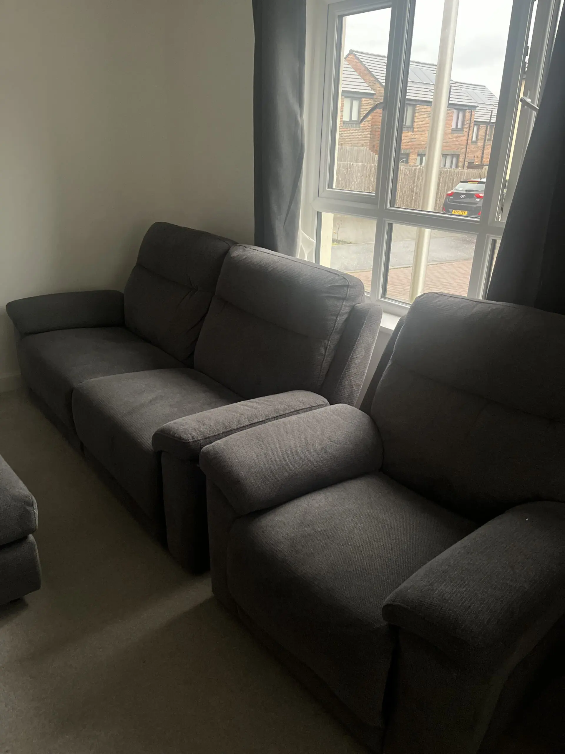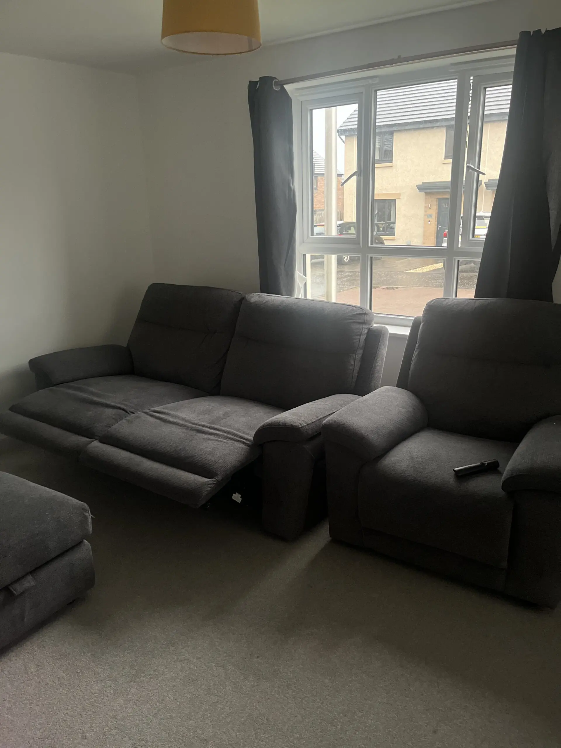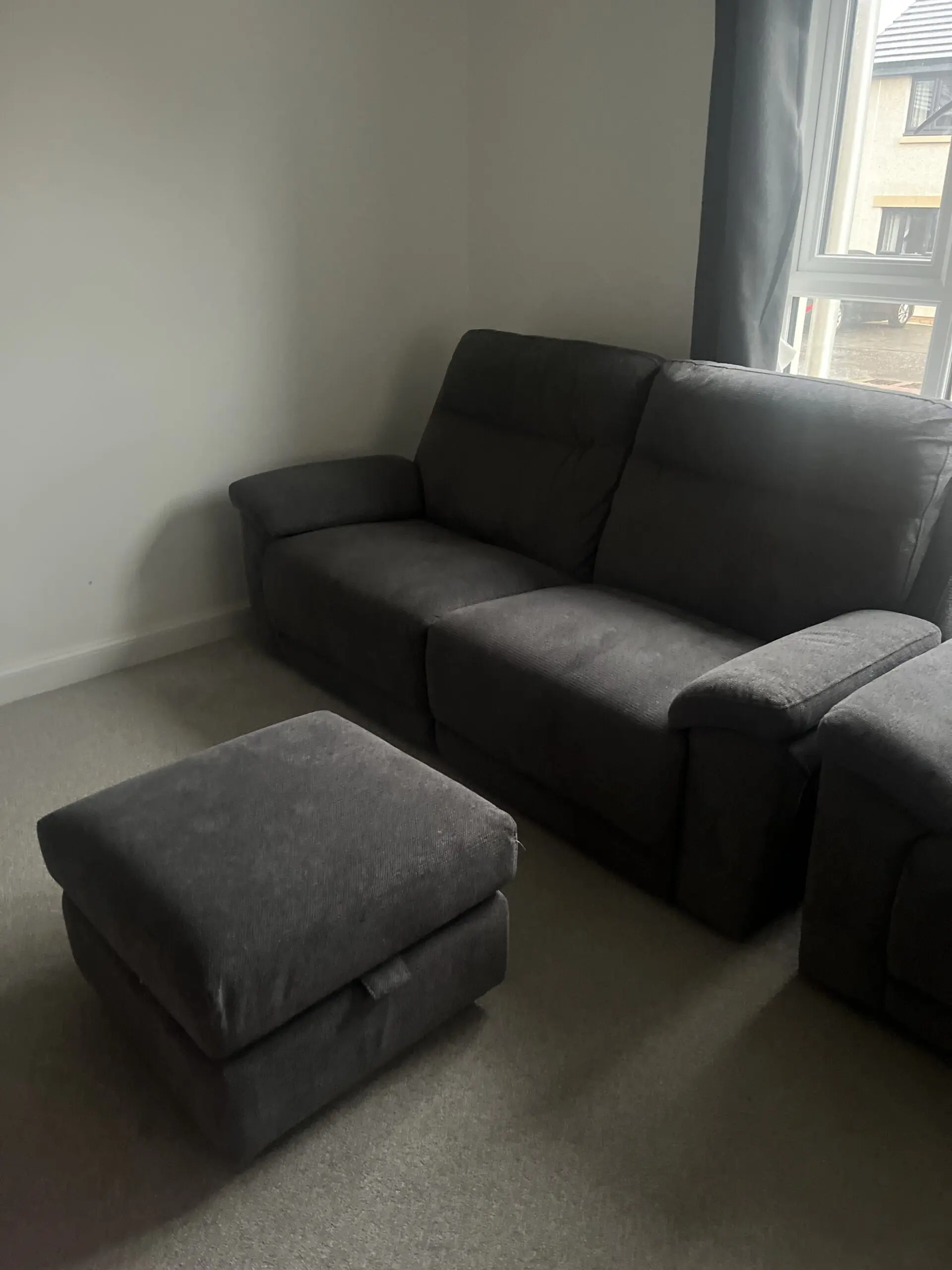 2 seat recliner sofa along with a single seater and foot stool with storage