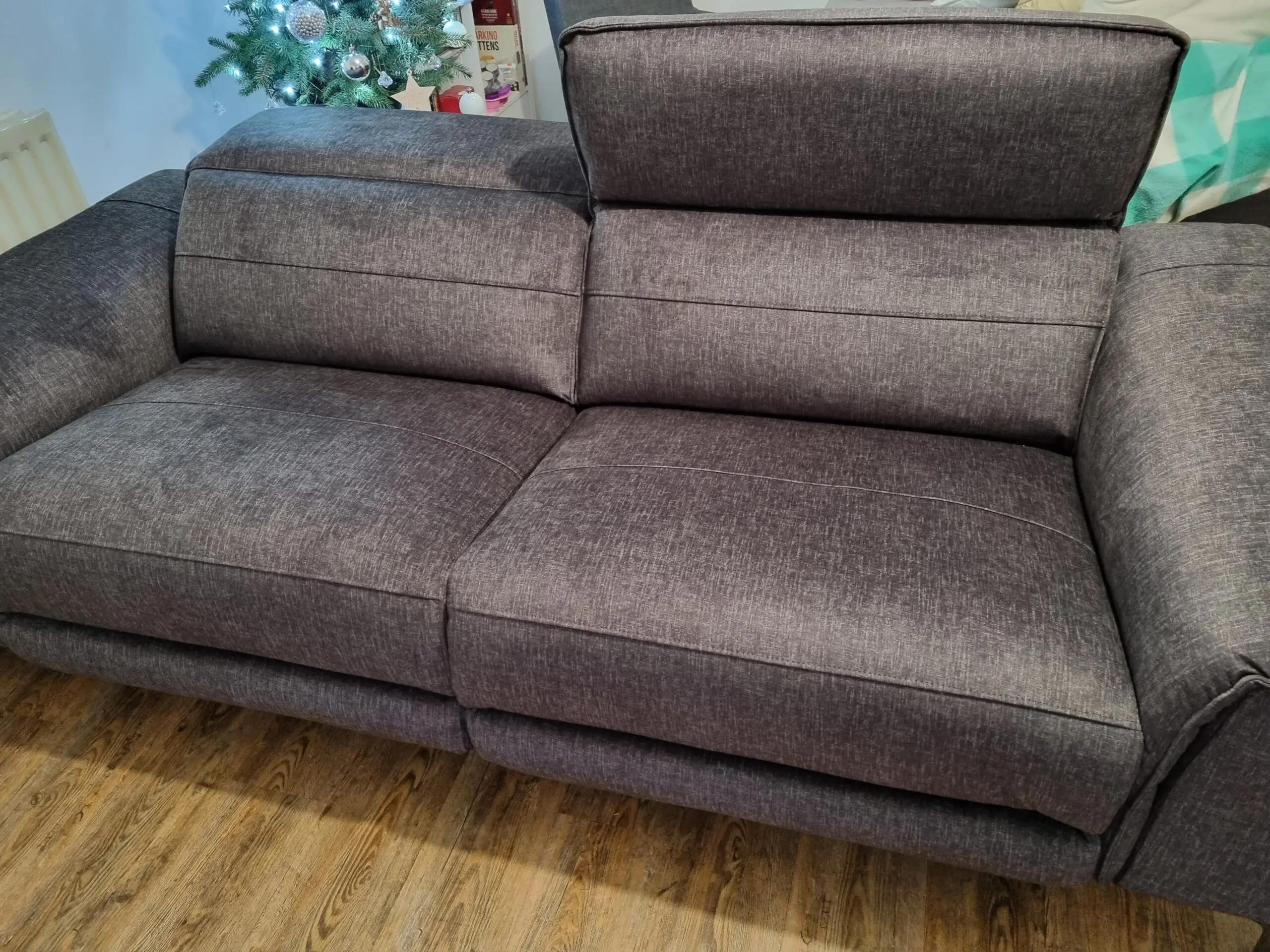 The sofa headrest and legs recline and move. Plug powered so will need to be positioned near a socket to work. There are switches at the back to turn the reclining option on and off. The sofa is split into two for ease of transportation so can be easily slotted together. This is only a few years old and from a loving home so is in excellent condition. I am moving out of the country and cannot take this with me. The item is currently in storage.