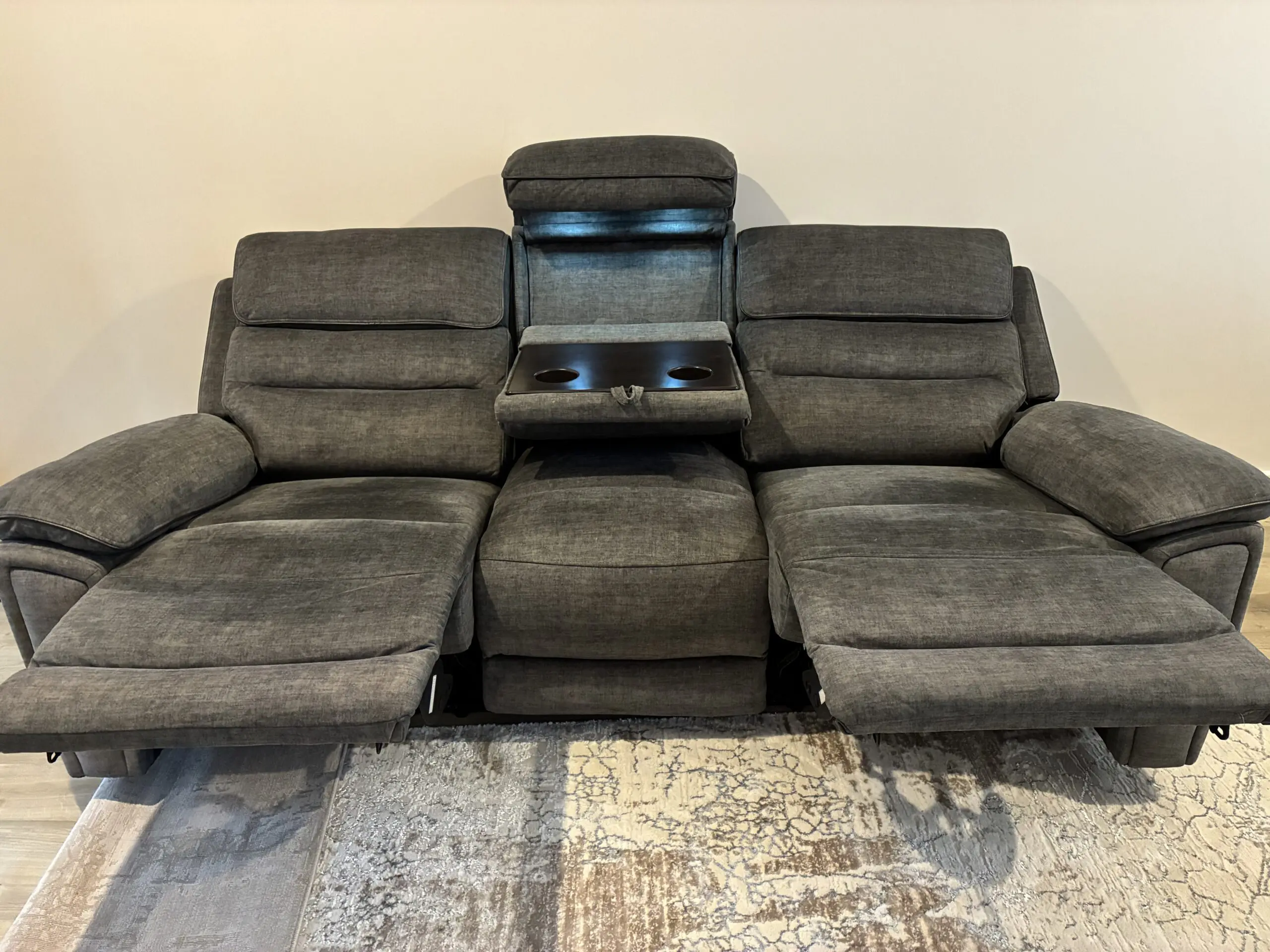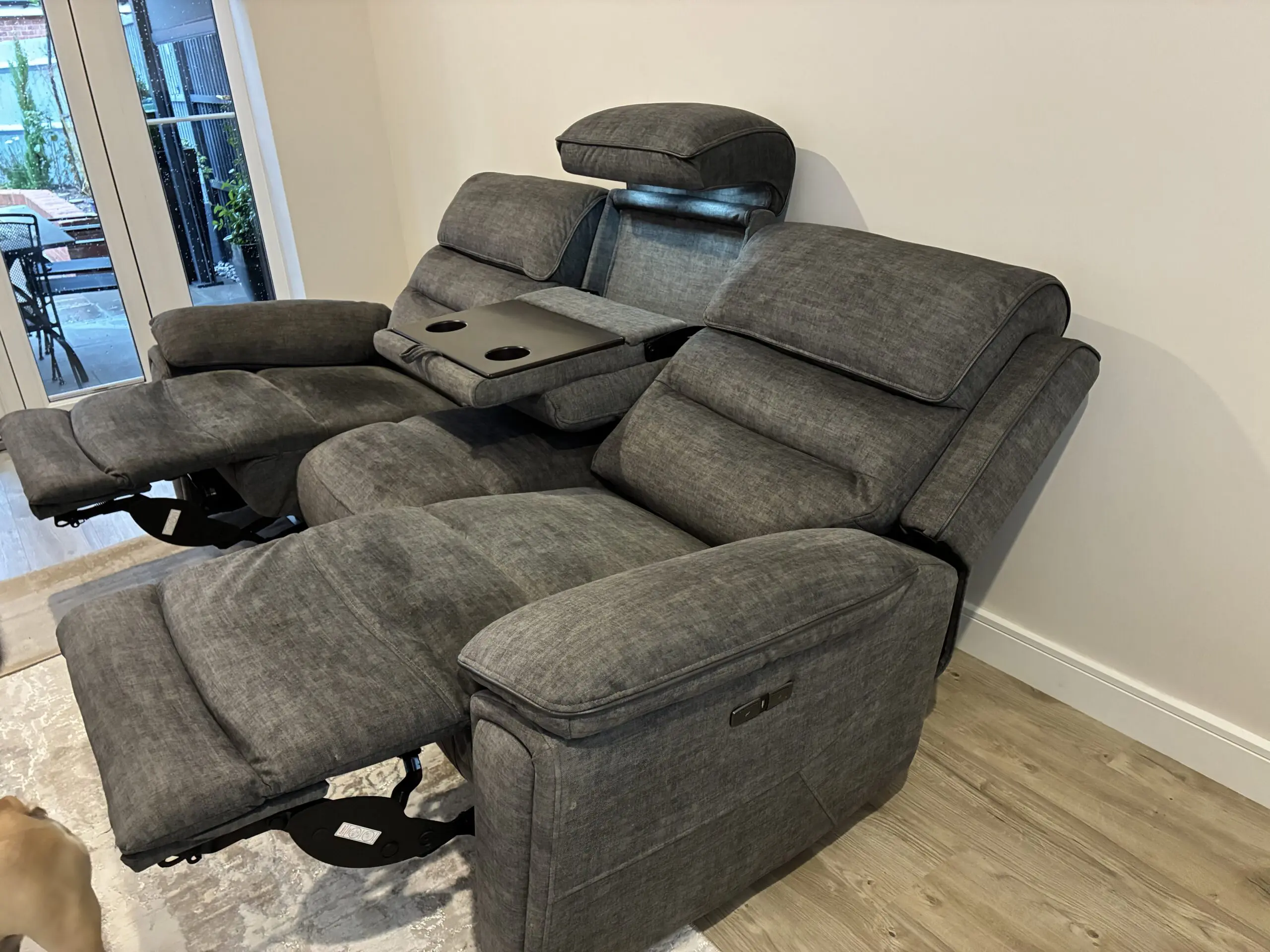 3 seater powered recliner in grey with leather edging with table and light