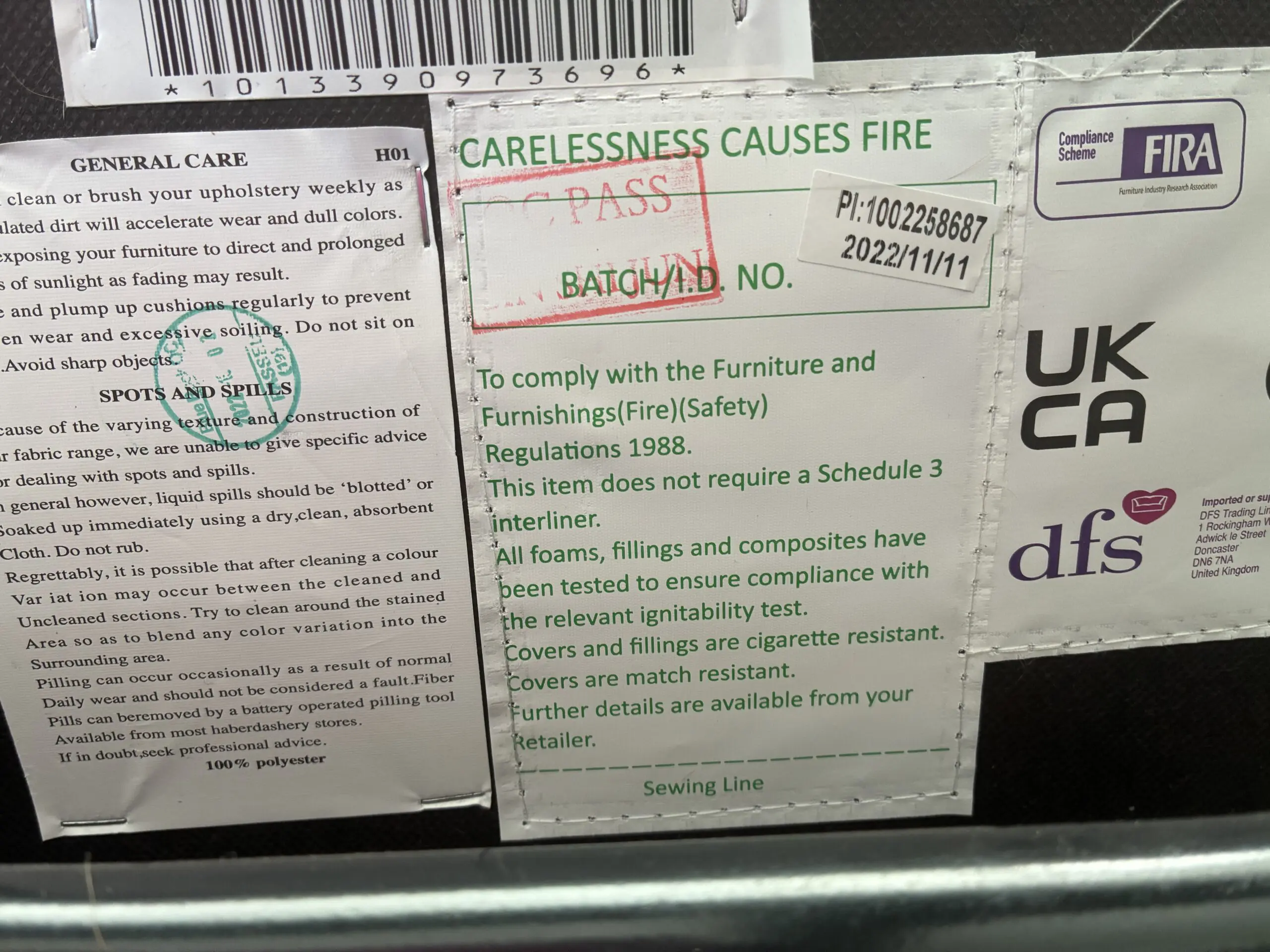 The sofa and chair I bought was as described by the seller - excellent condition. Delivery was quickly arranged and without any incidents. I was kept well informed of the delivery time on the day. Highly recommended.