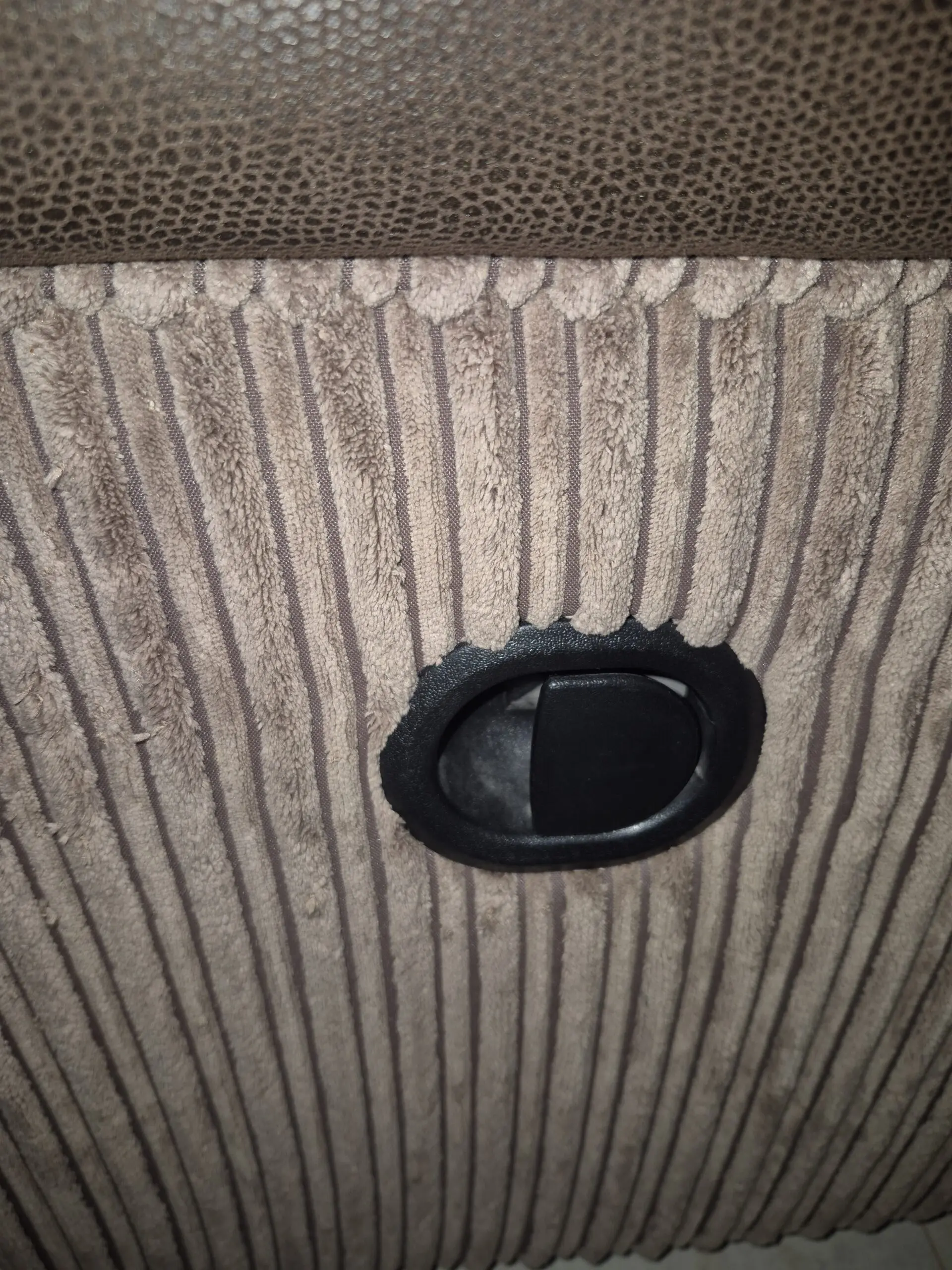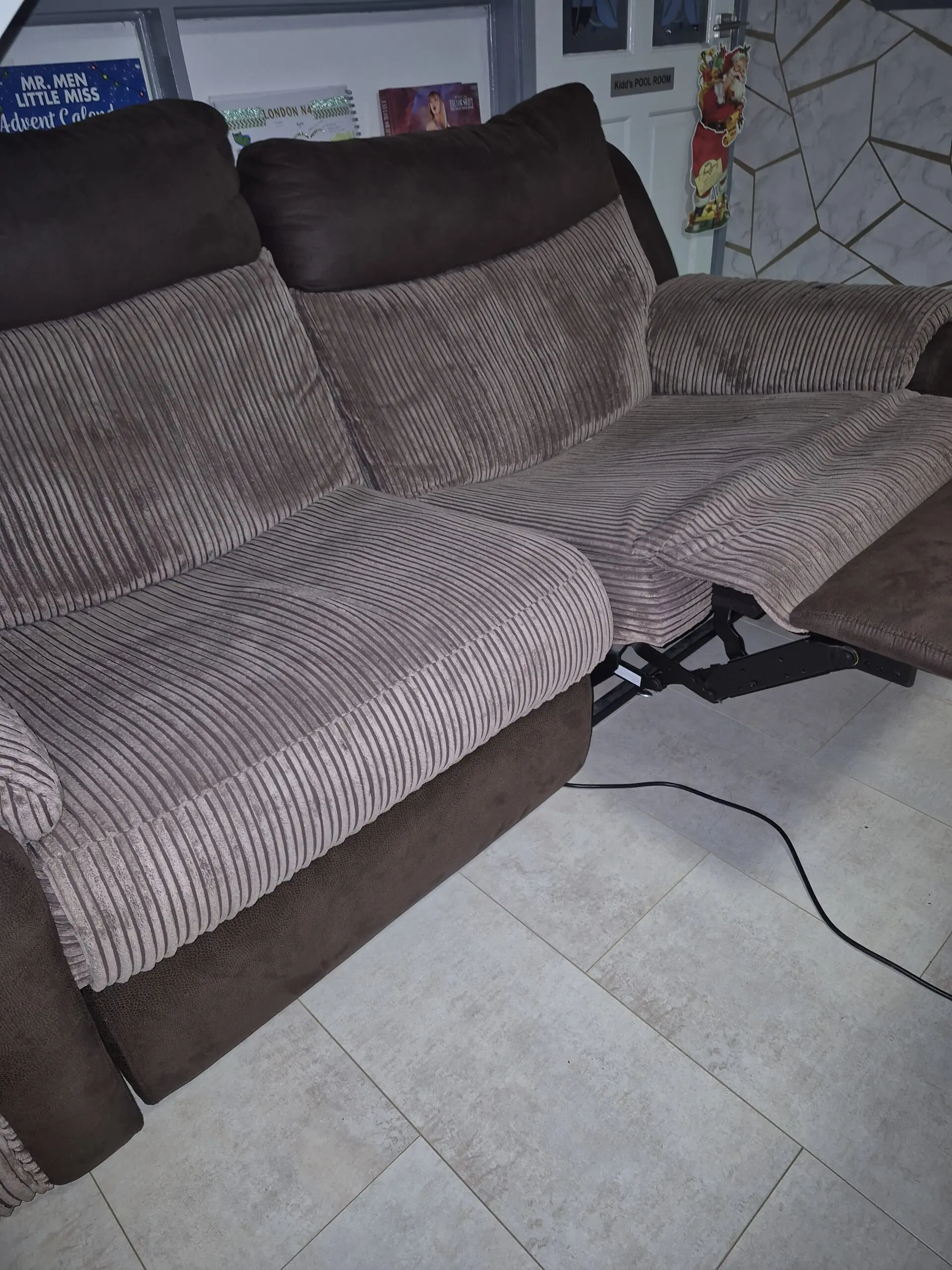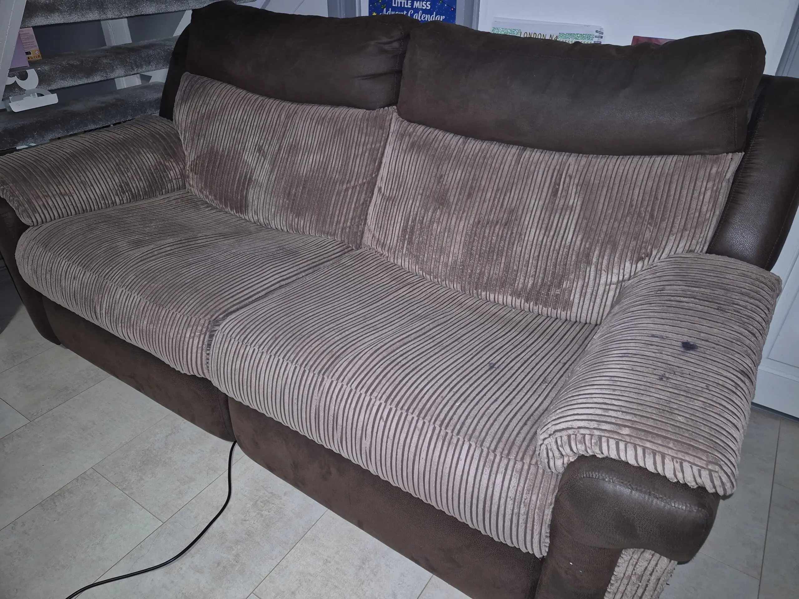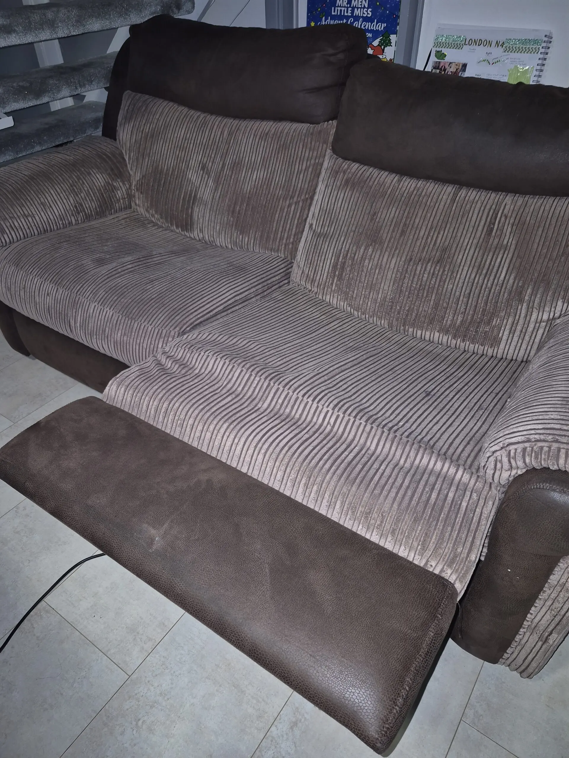 Three Seater aTwo-tone Sofa by DFS. Full manual recline via side switch panels. Heavy Duty padding. Finished in an Earth brown striped fabric and deep brown faux. Although this Three Seater shows some sign of ware it is fully functional and fit for purpose.