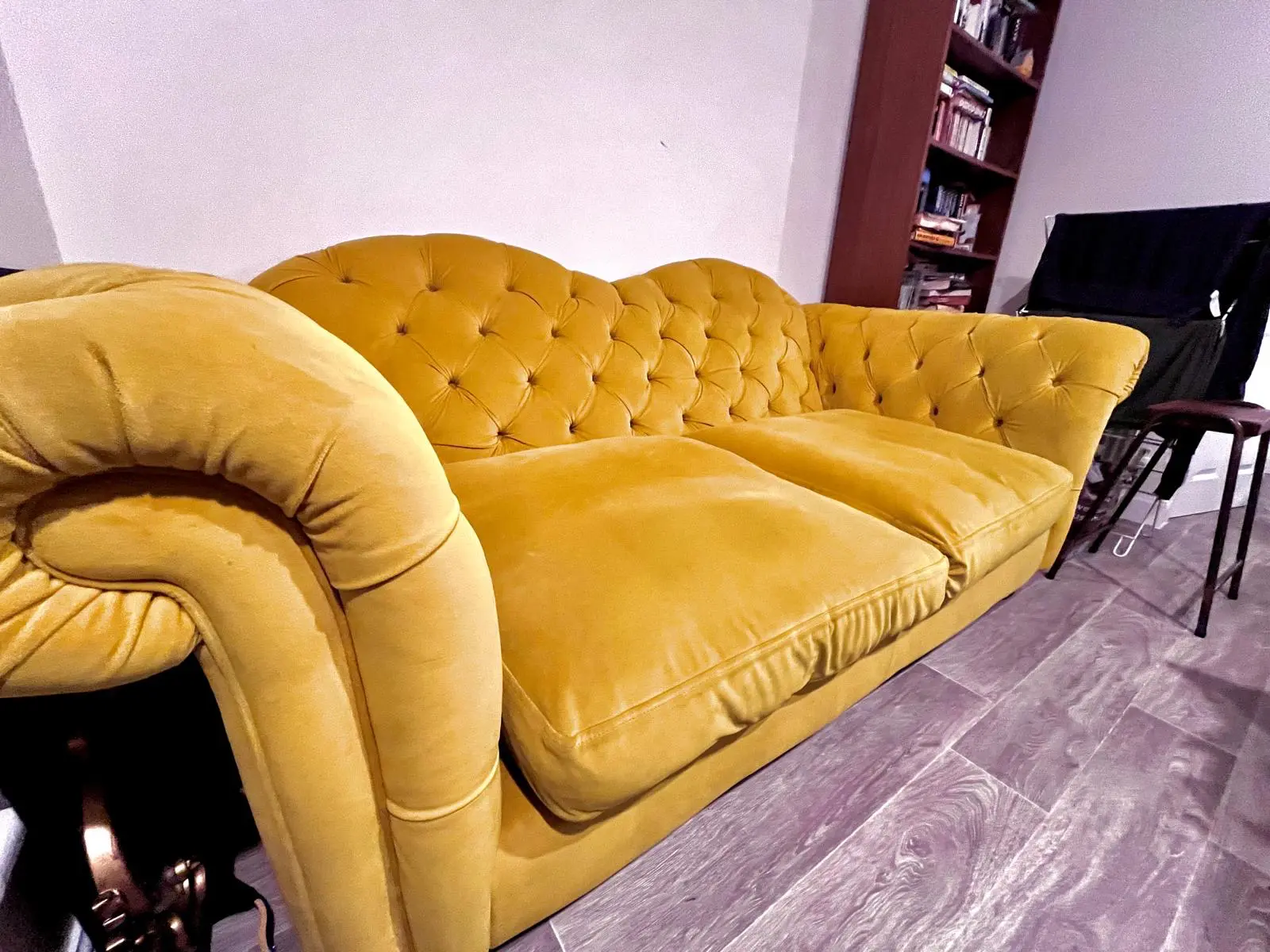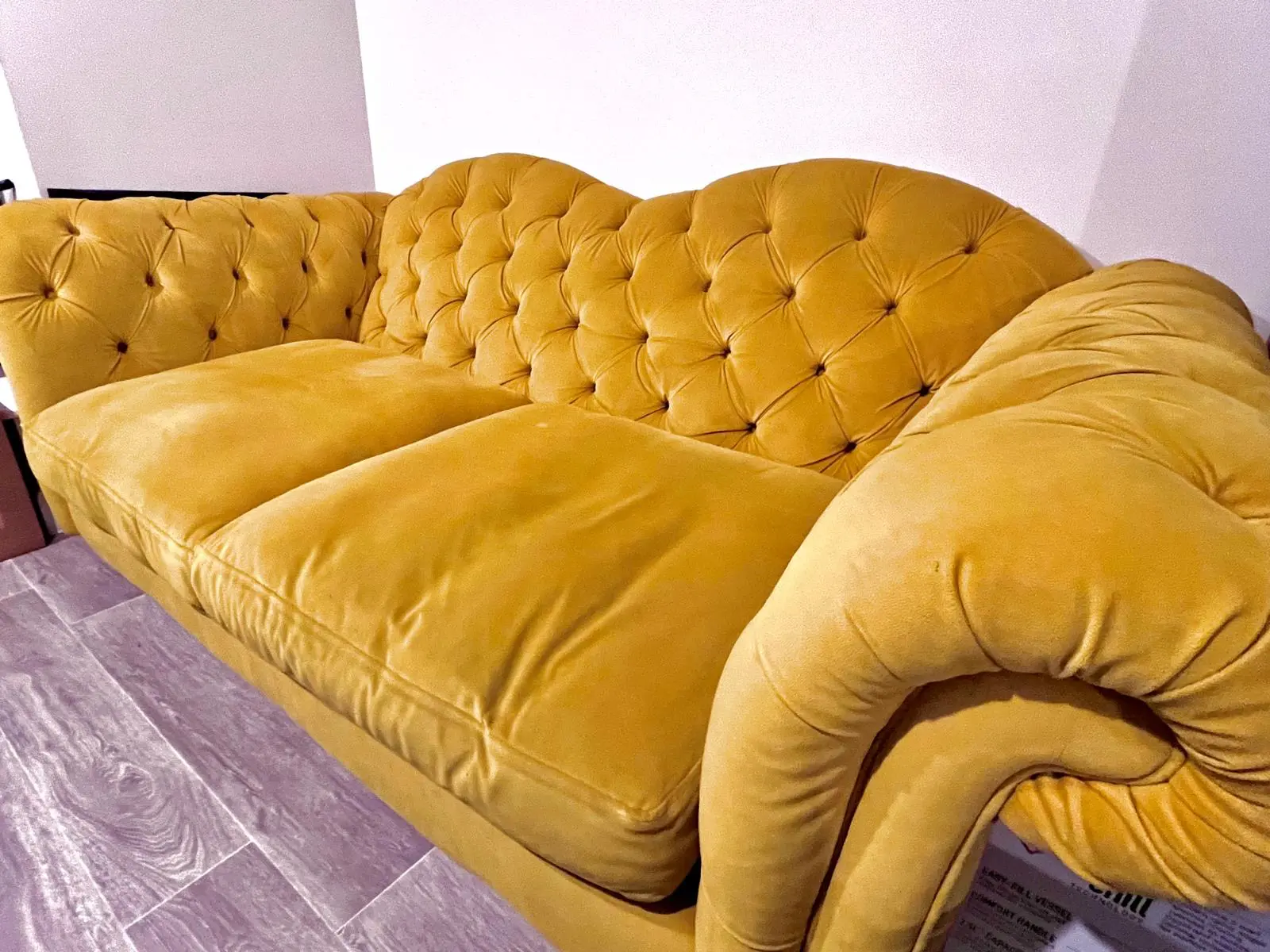 Fun and super comfy sofa in a sunshine yellow. Generous size for a 3-seater. Lovely deluxe velvet fabric, which feels luxurious but is also practical. Fun details with the Joules pink back foot, and printed buttons