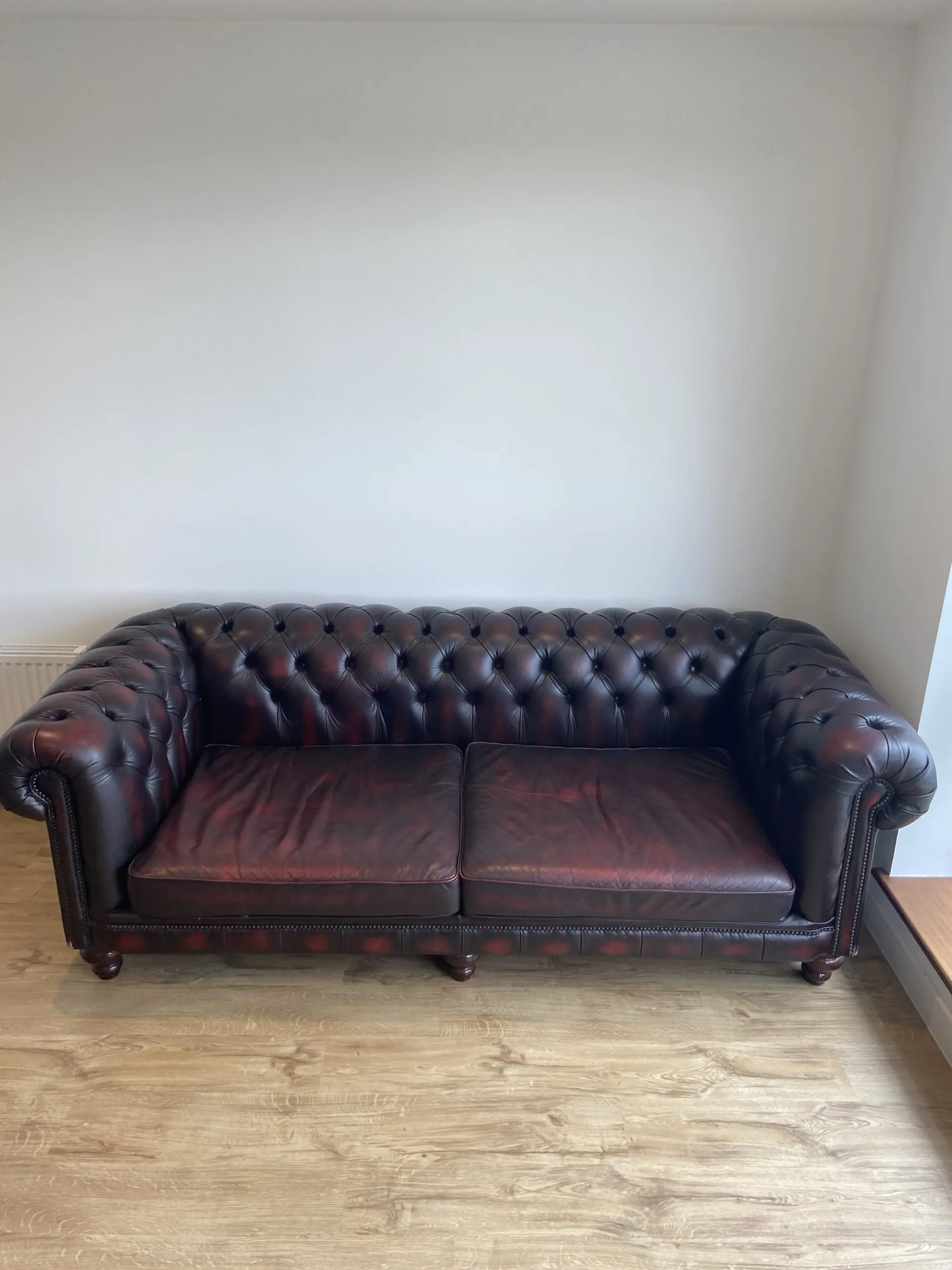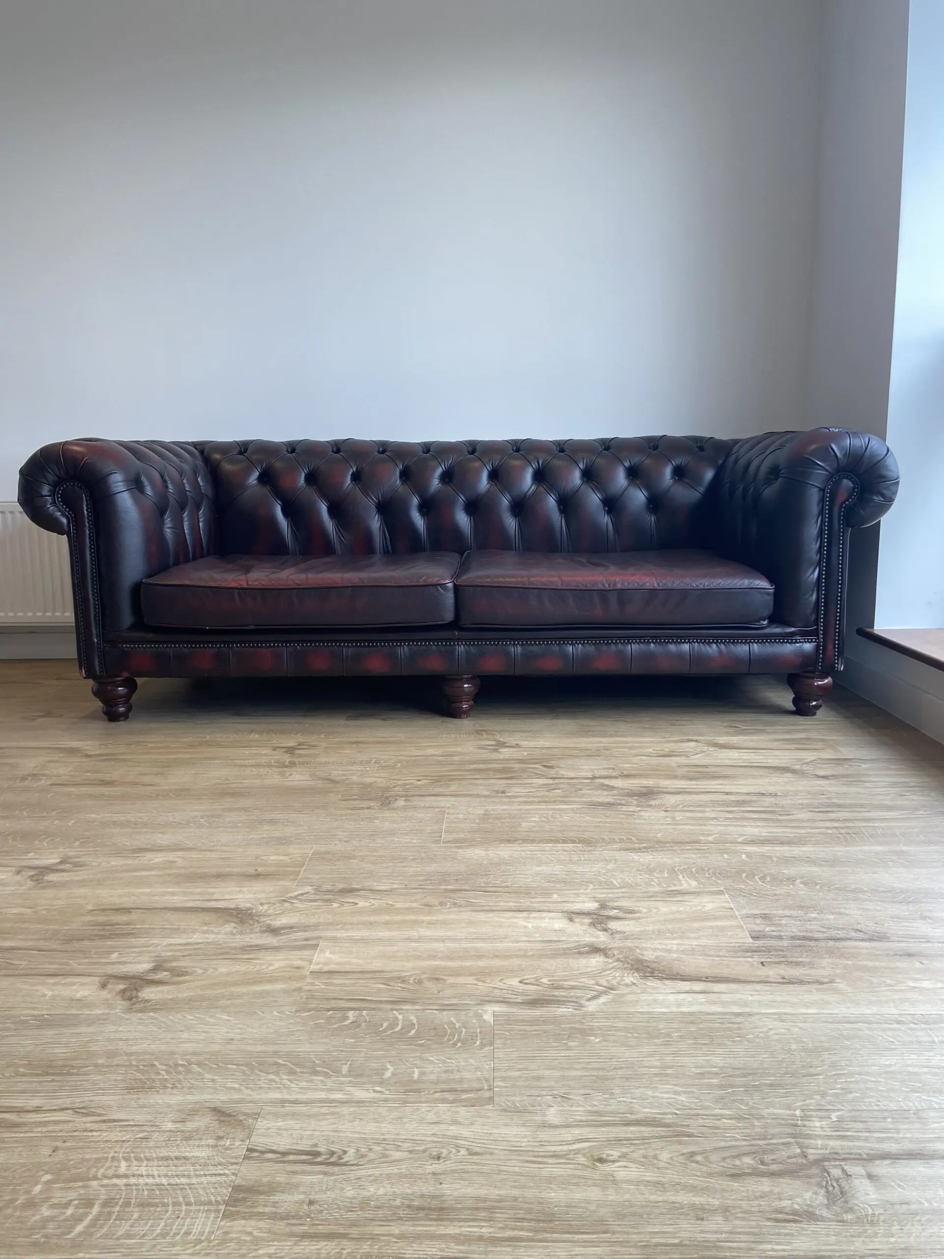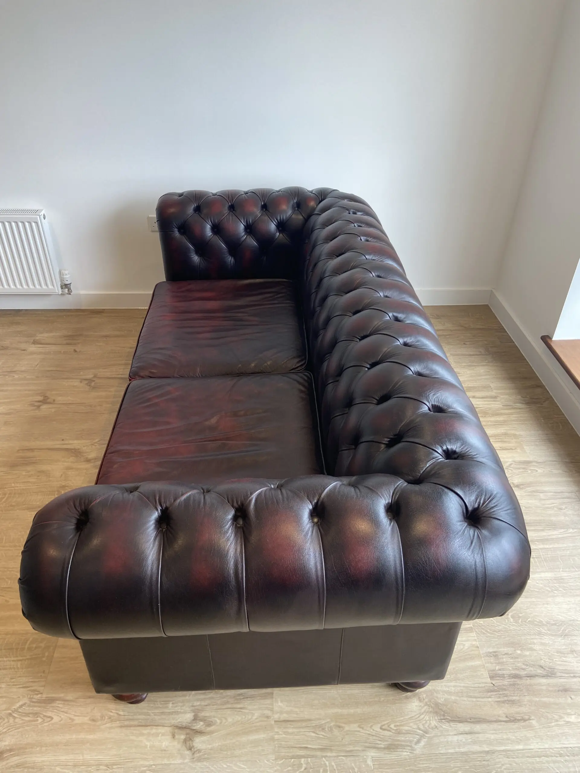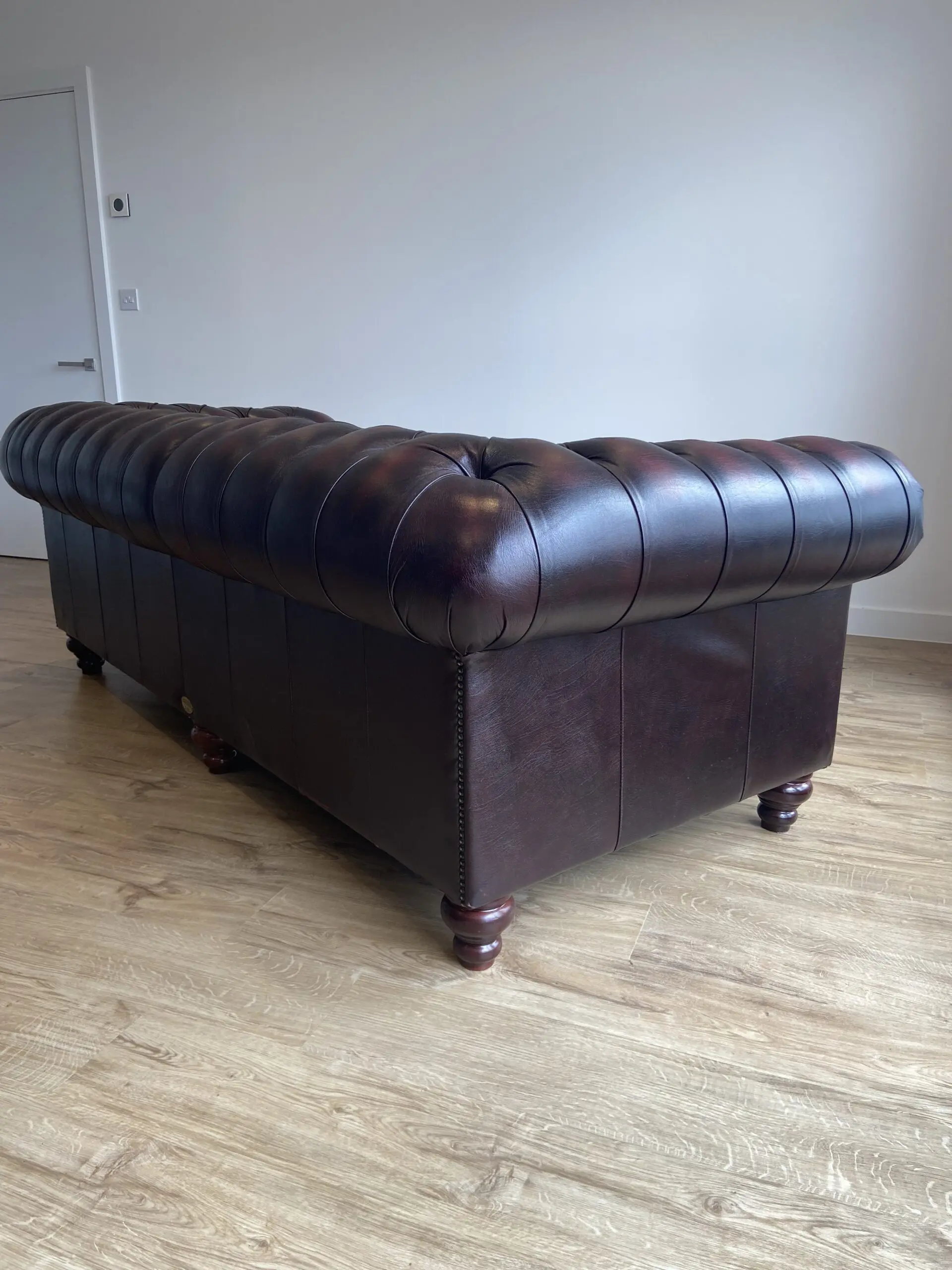 This Hampton handmade Chesterfield was bought from Distinctive Chesterfield. It’s a three seater, vintage leather ox blood in colour.