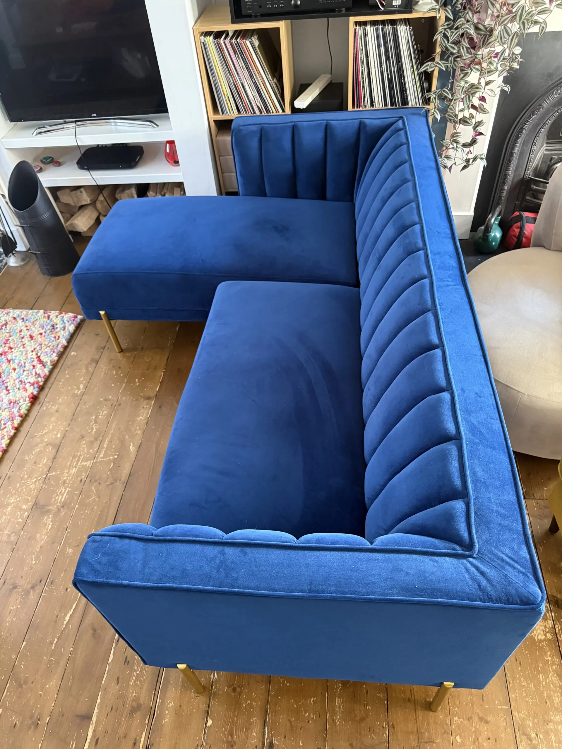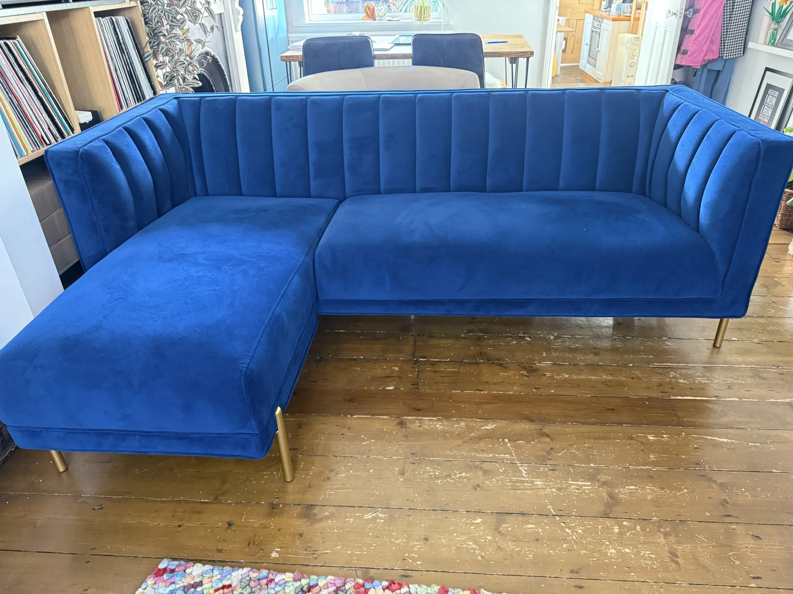 New in November 2024, as new condition, corner sofa with a right hand return, velvet type material. (viewing from sitting position) £850 new.