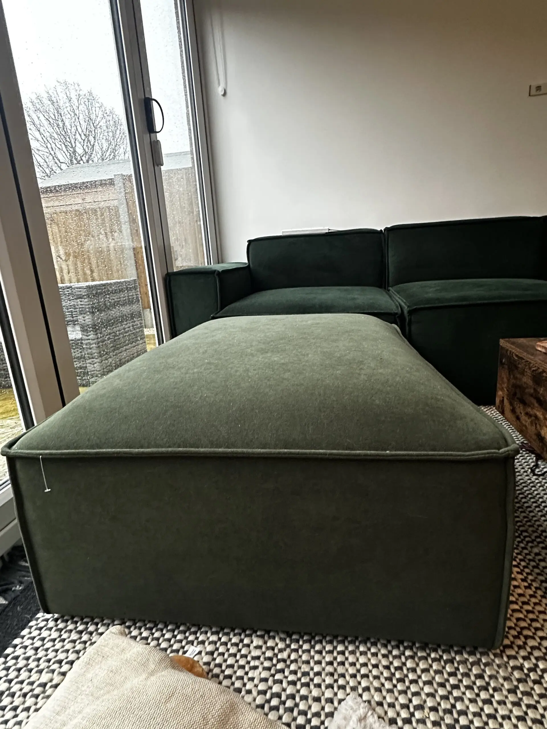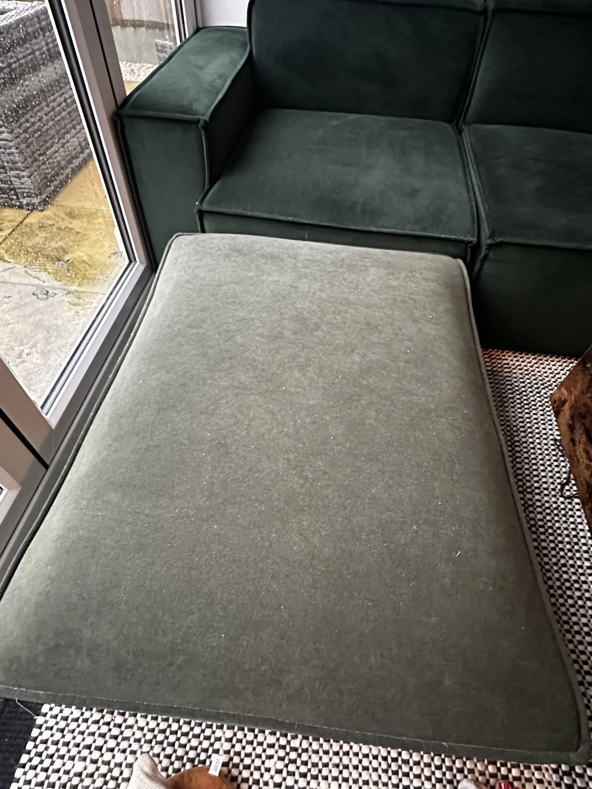 Foot stool is only 6 months old, it is a different shade of green, more olive green than emerald due to buying after the sofa but it is in perfect condition