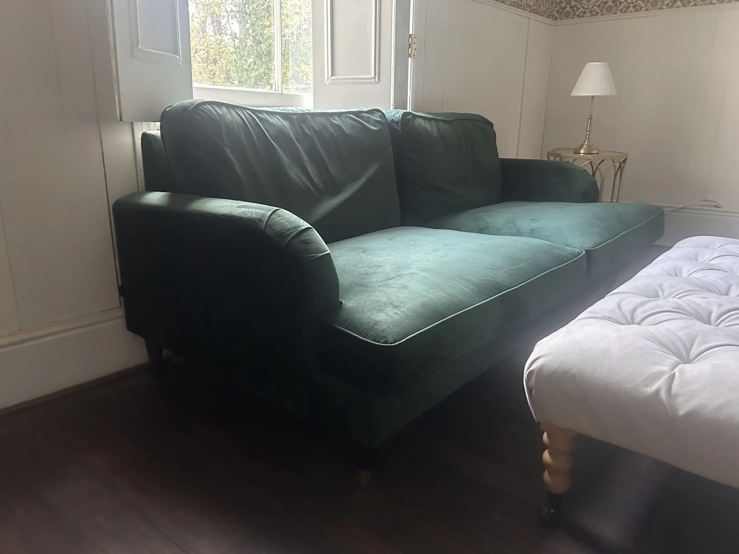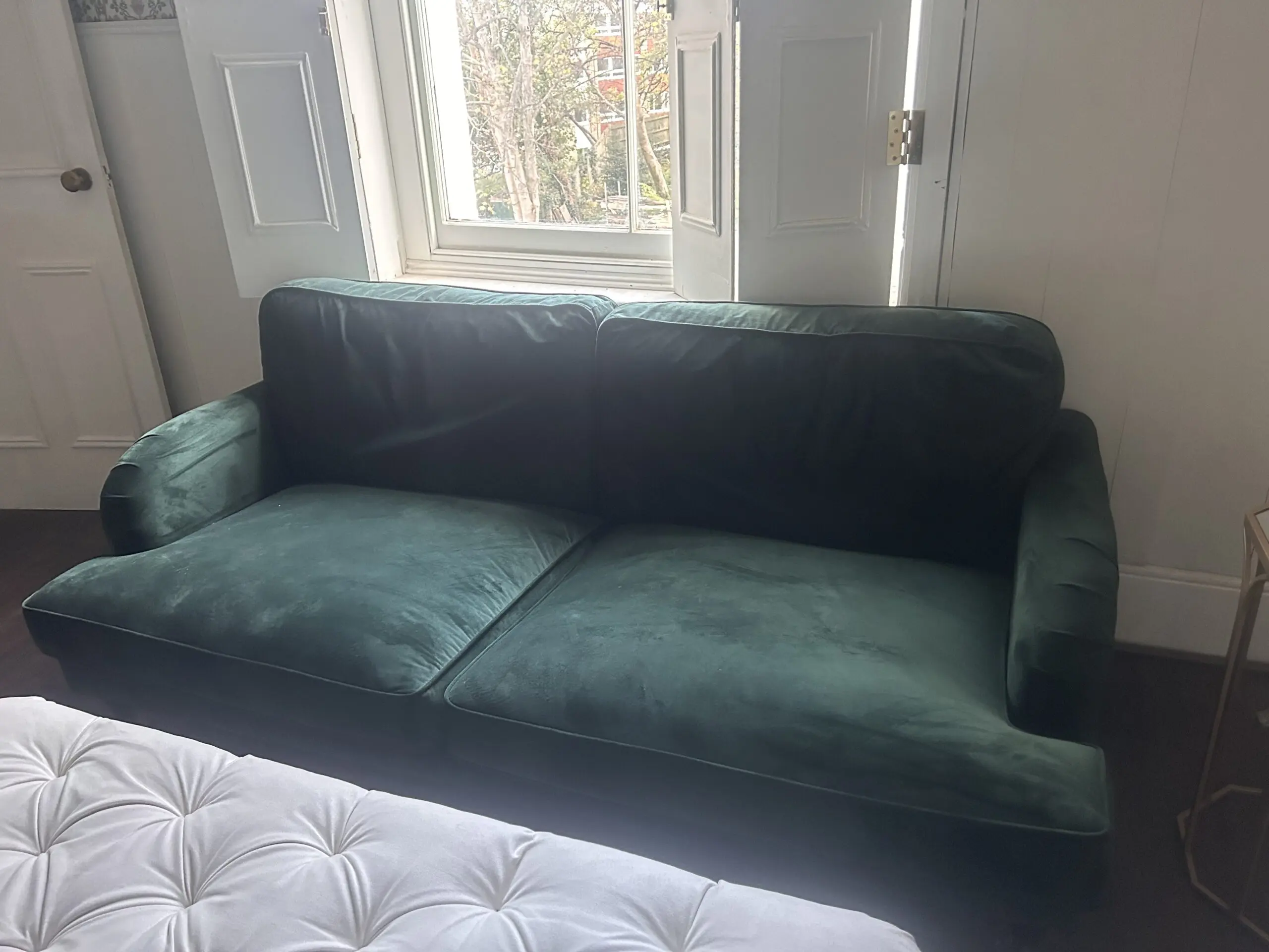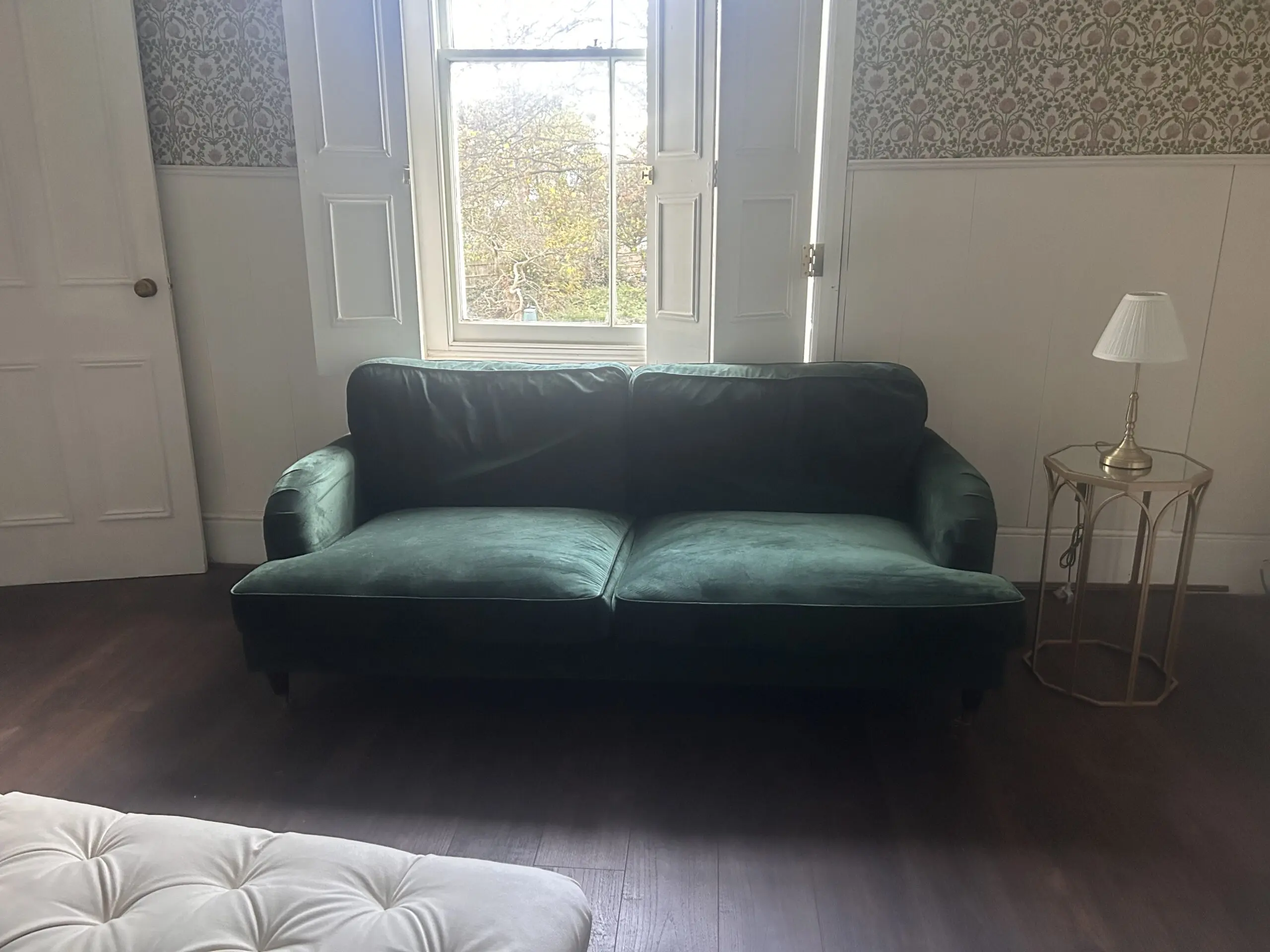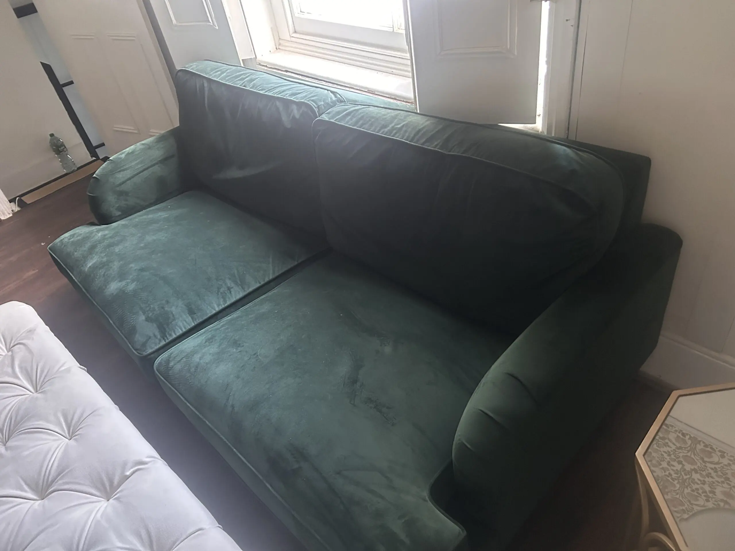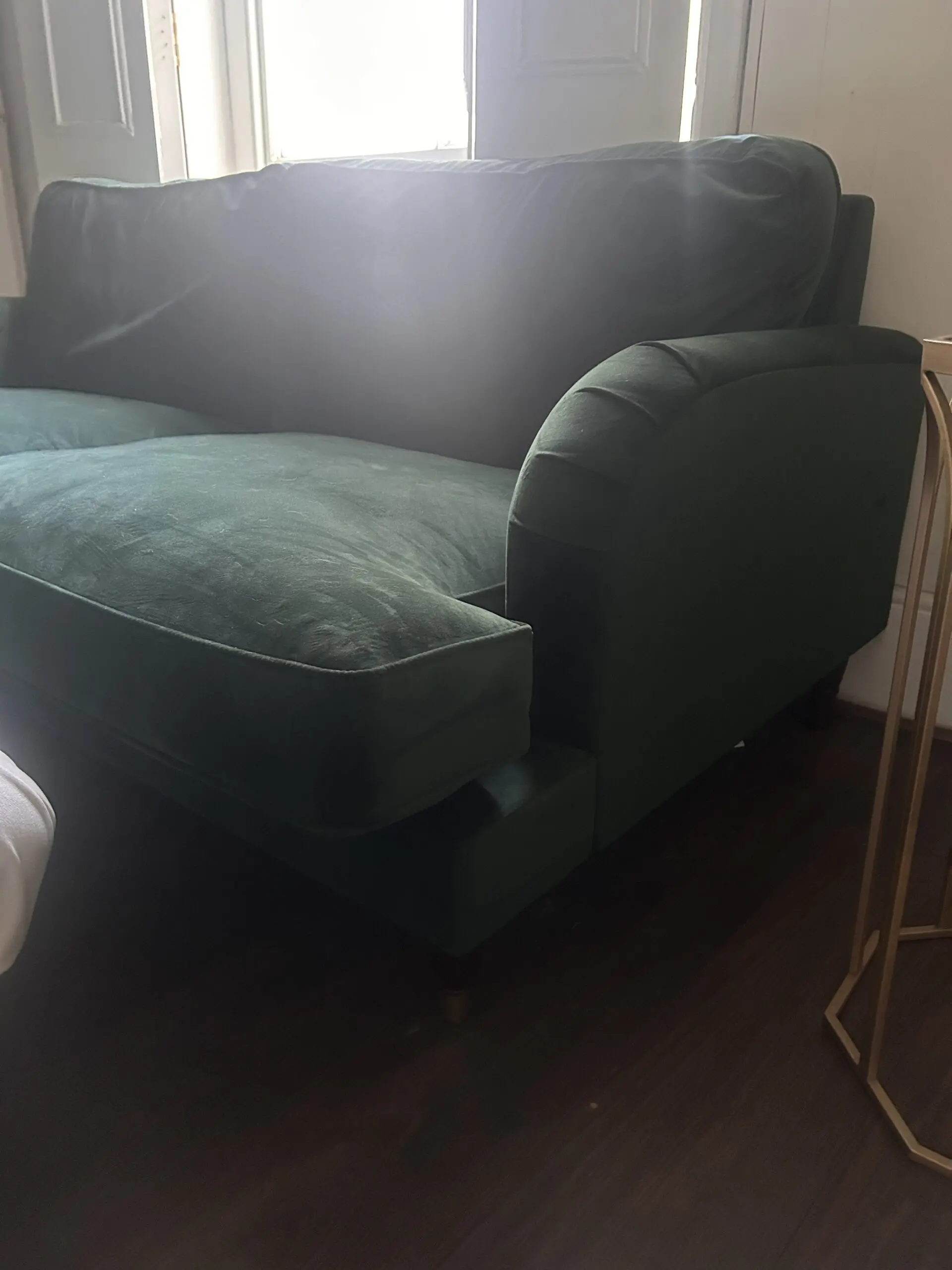 Fairly brand new sofa – not even sat on. I think roughly 8 months old. Colour doesn’t match after decorating. (As I thought it would) Dark Walnut feet with gold ring and wheels.