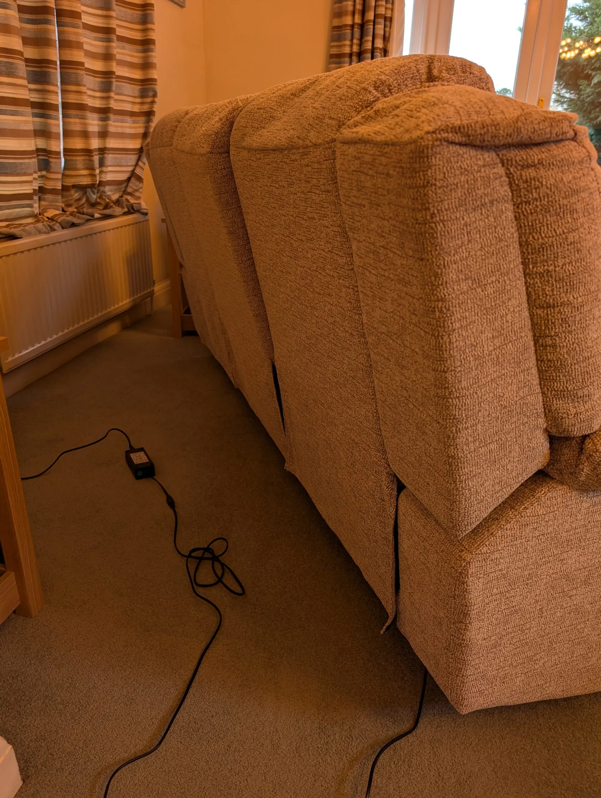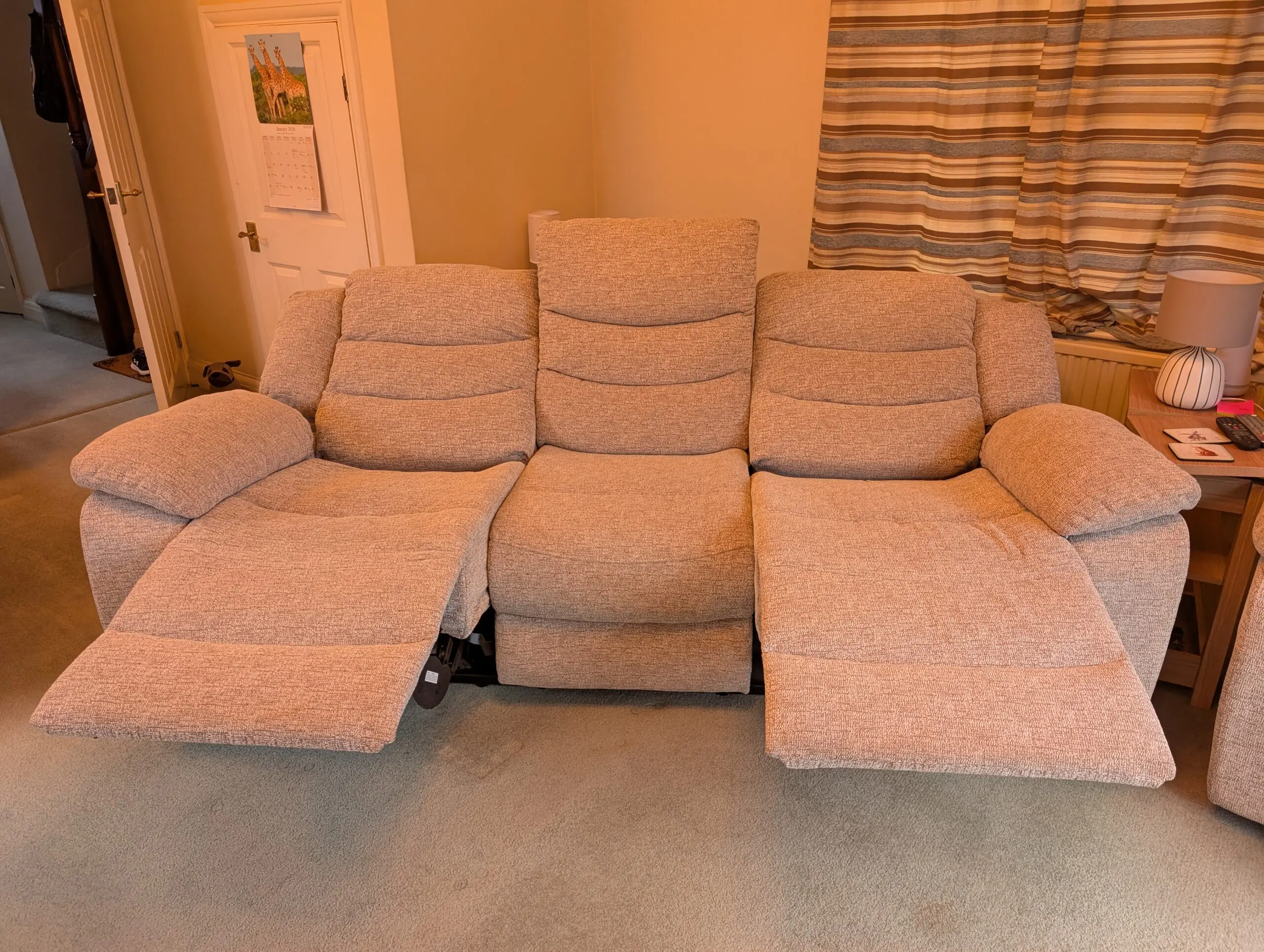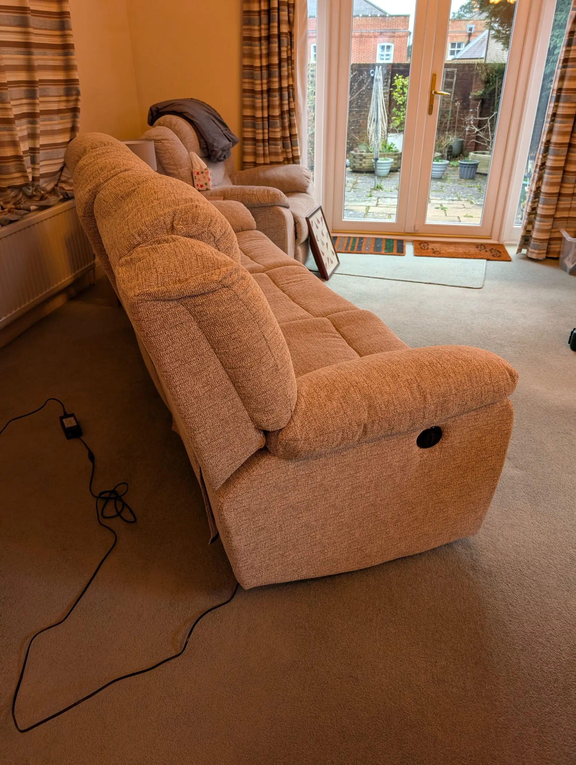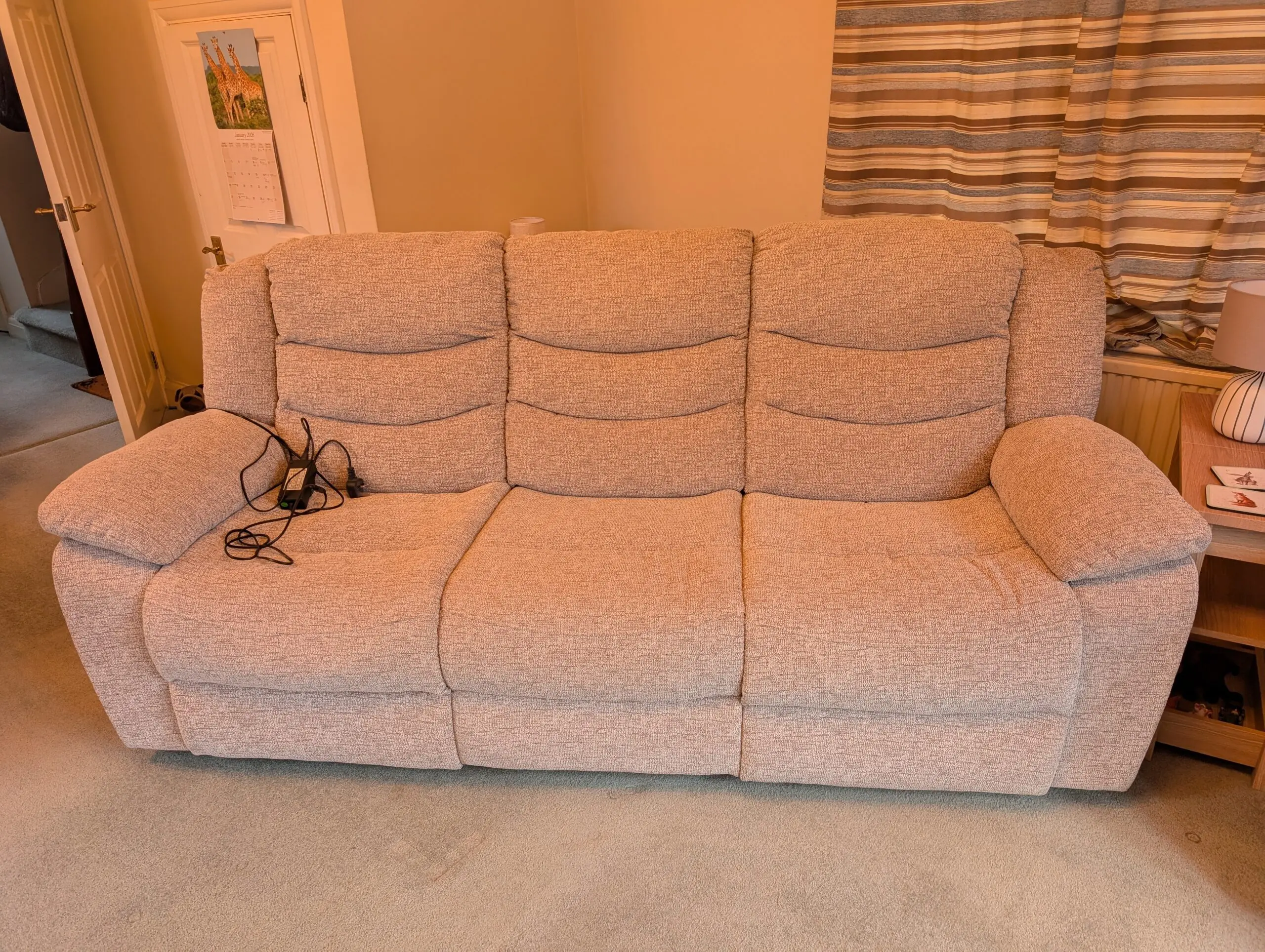 A grey, 3 seater electric la-z-boy 3 seater recliner sofa in grey. In excellent condition, barely used. The two end seats both recline (extends the depth to 160cm when fully reclined).