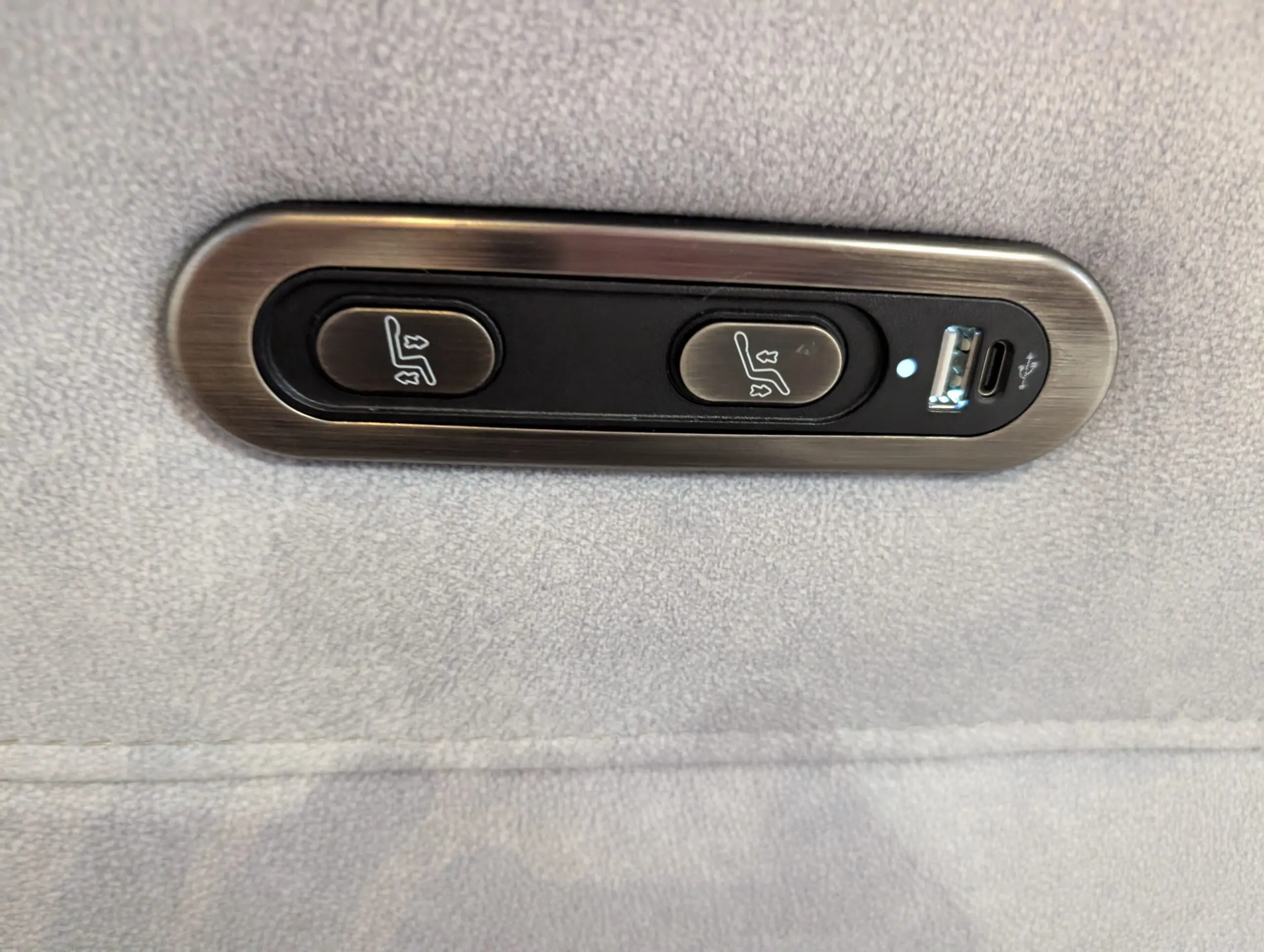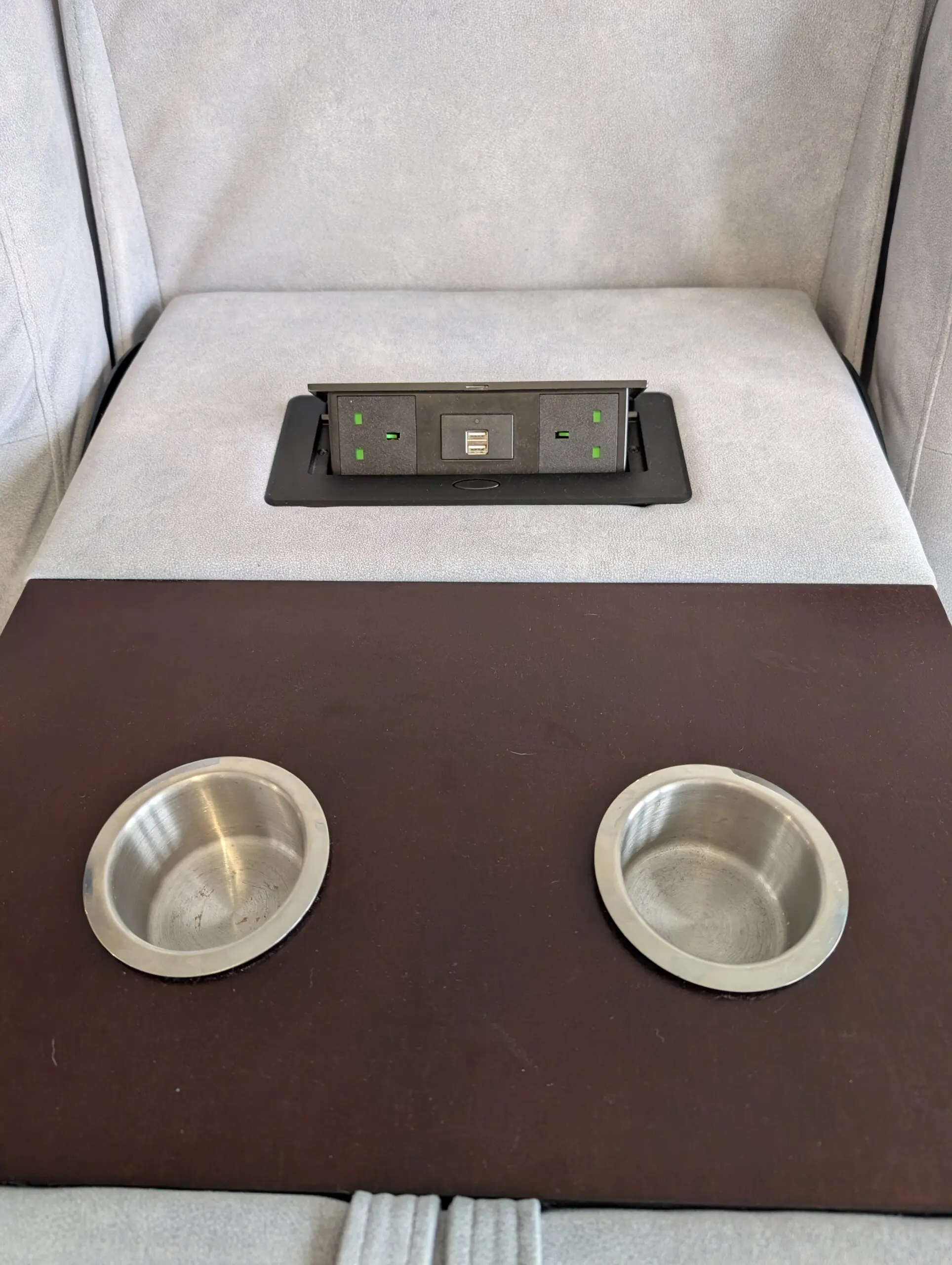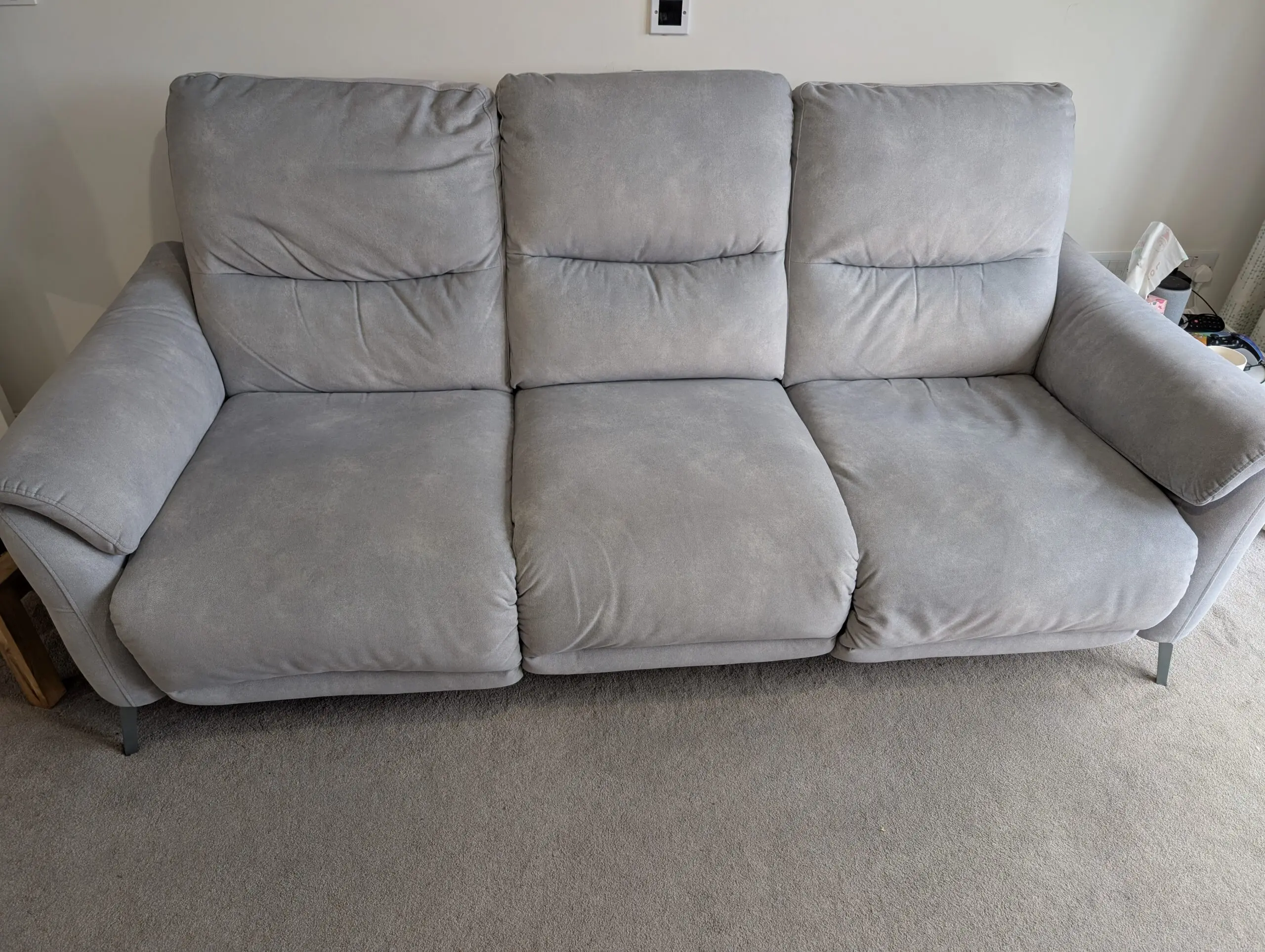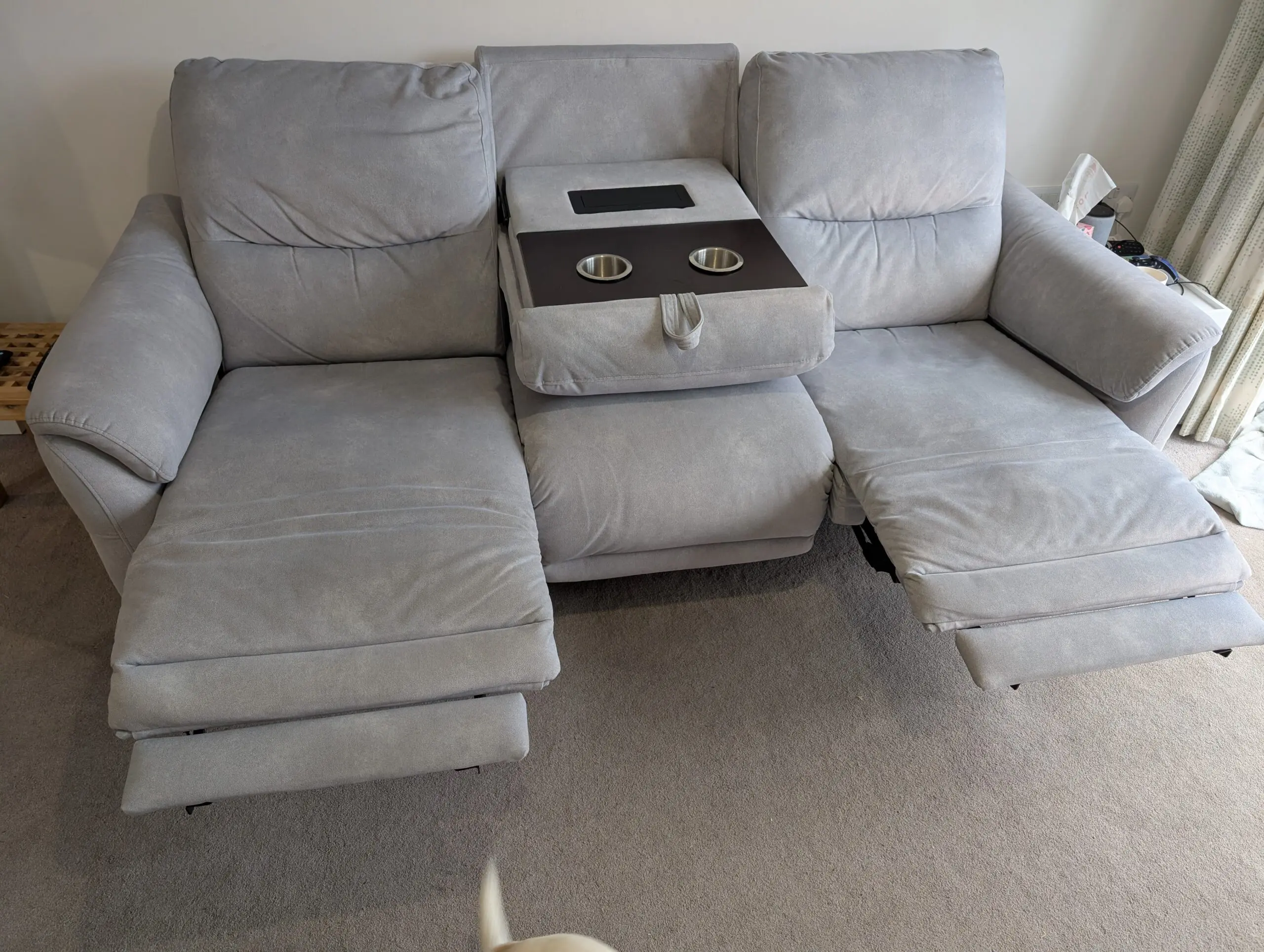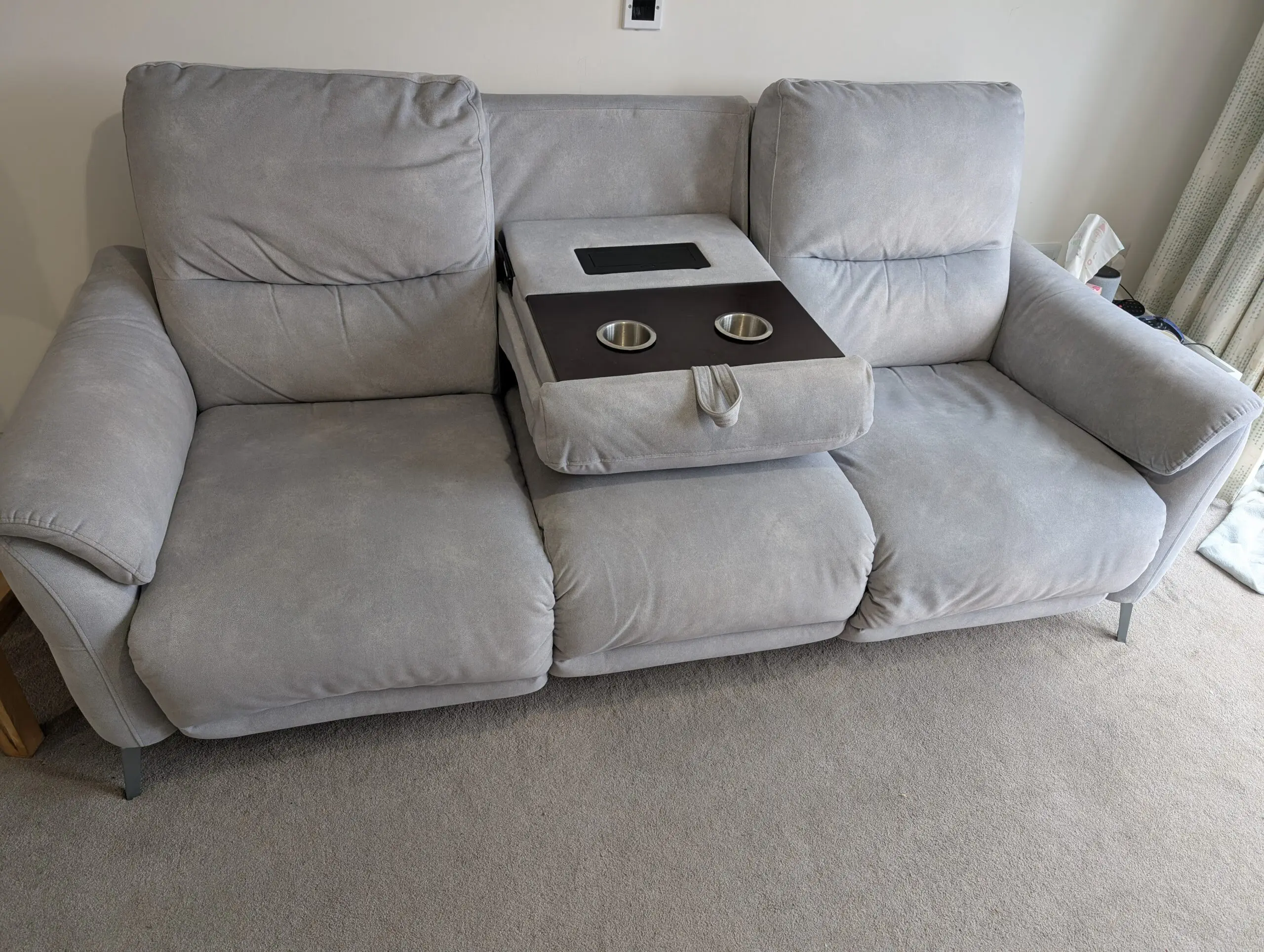 3 seater electric recliner sofa with a centre console with 2 cup holders and 2 sockets. Inbuilt Bluetooth speaker and charging points on both ends of the sofa.