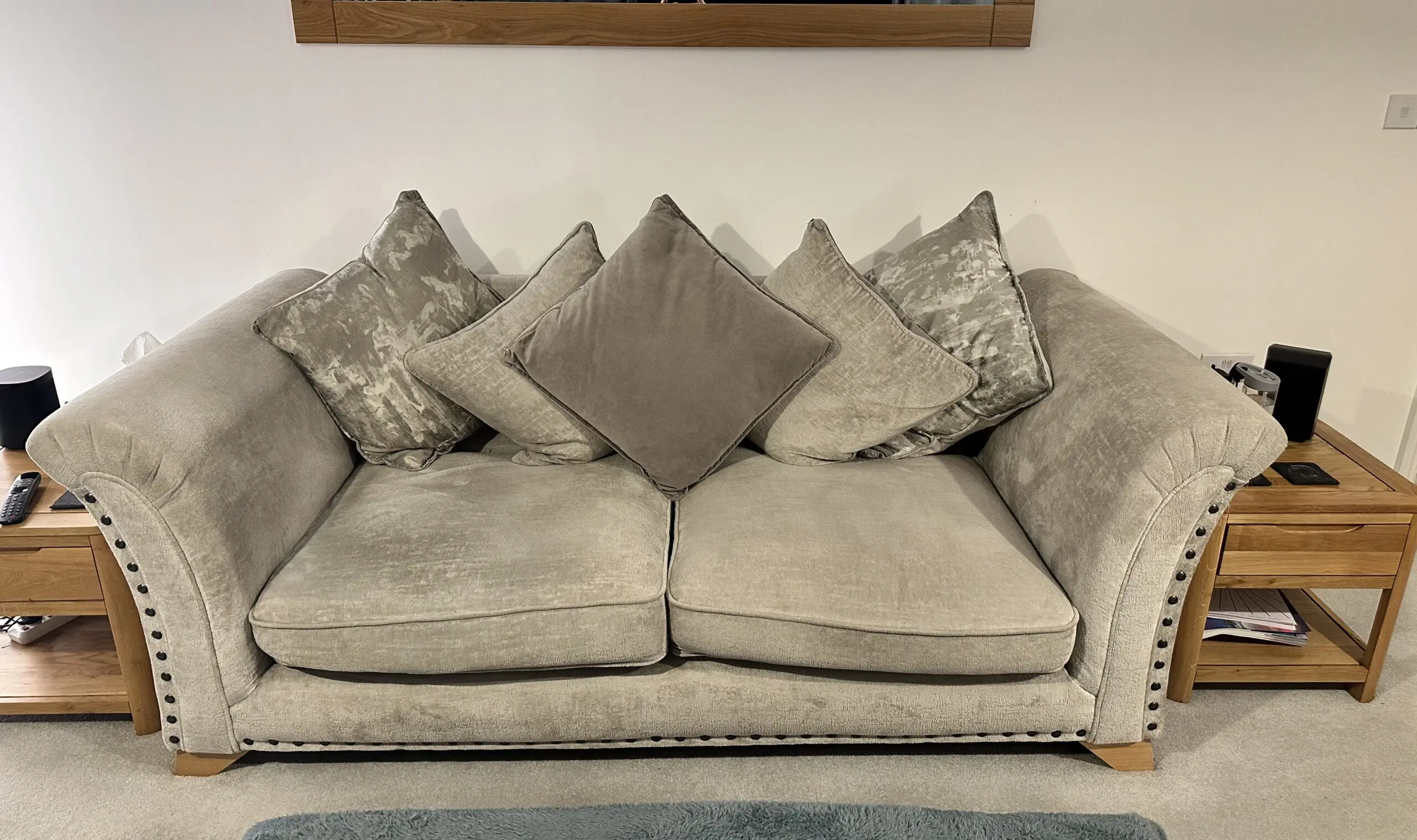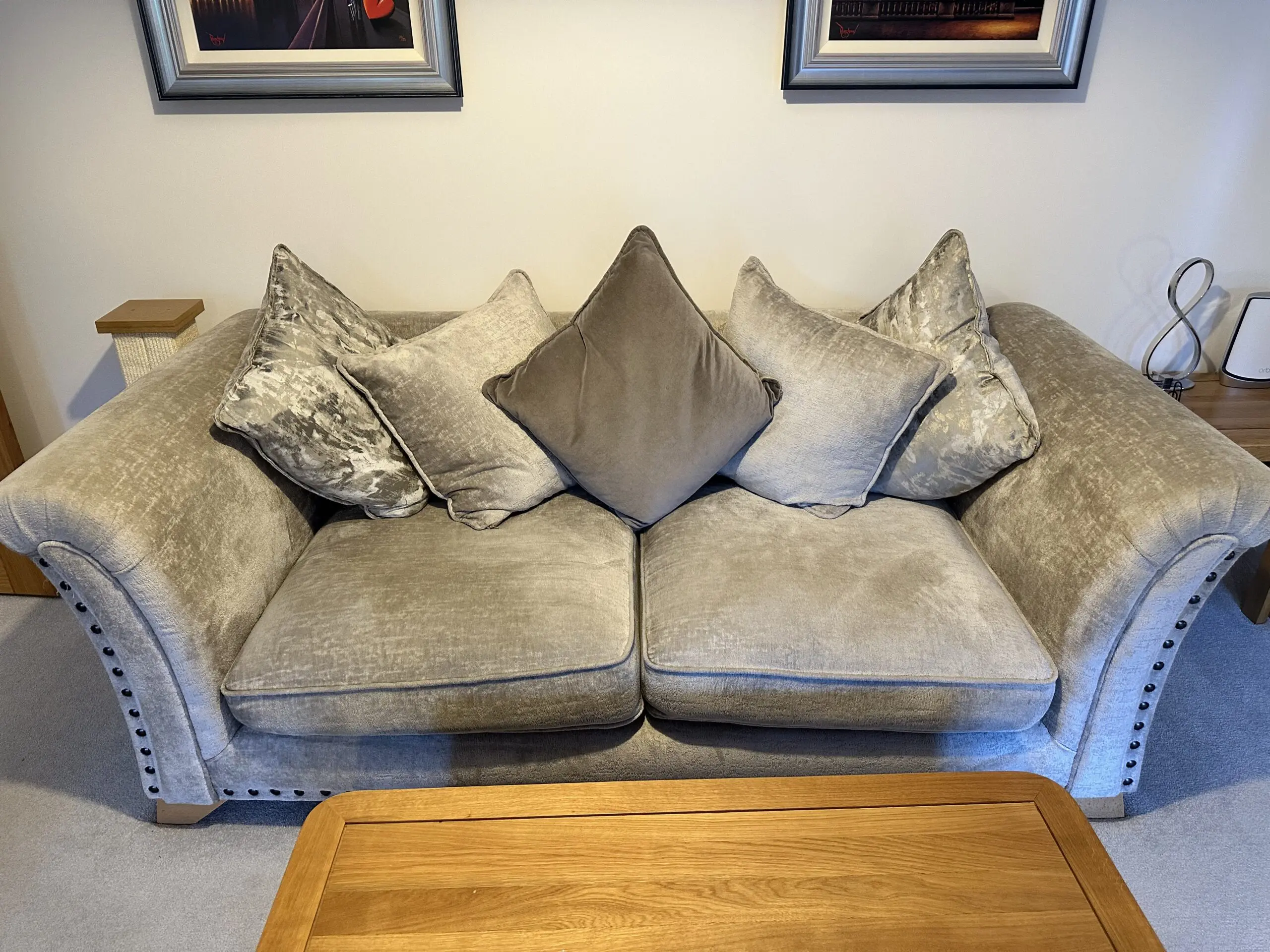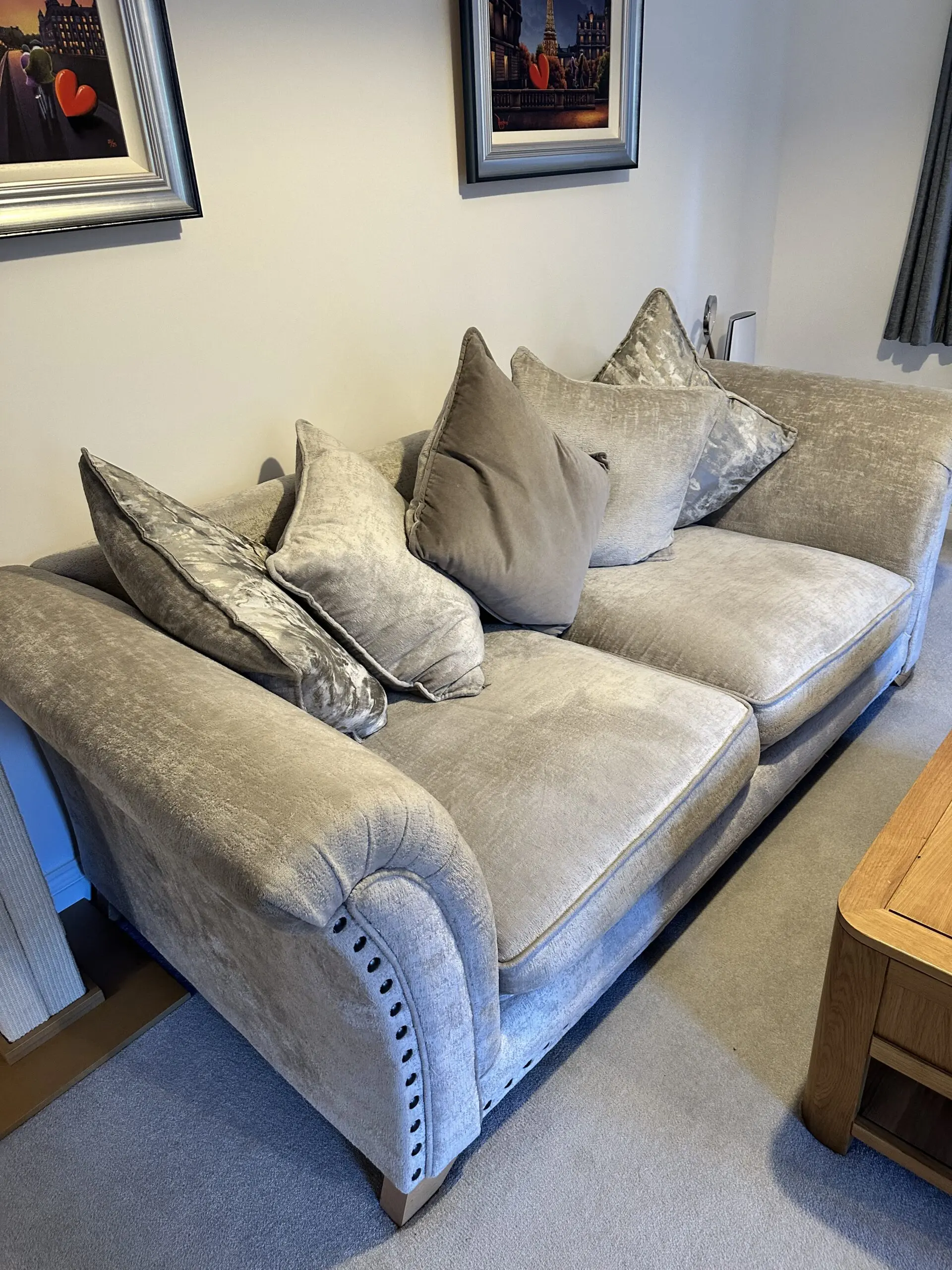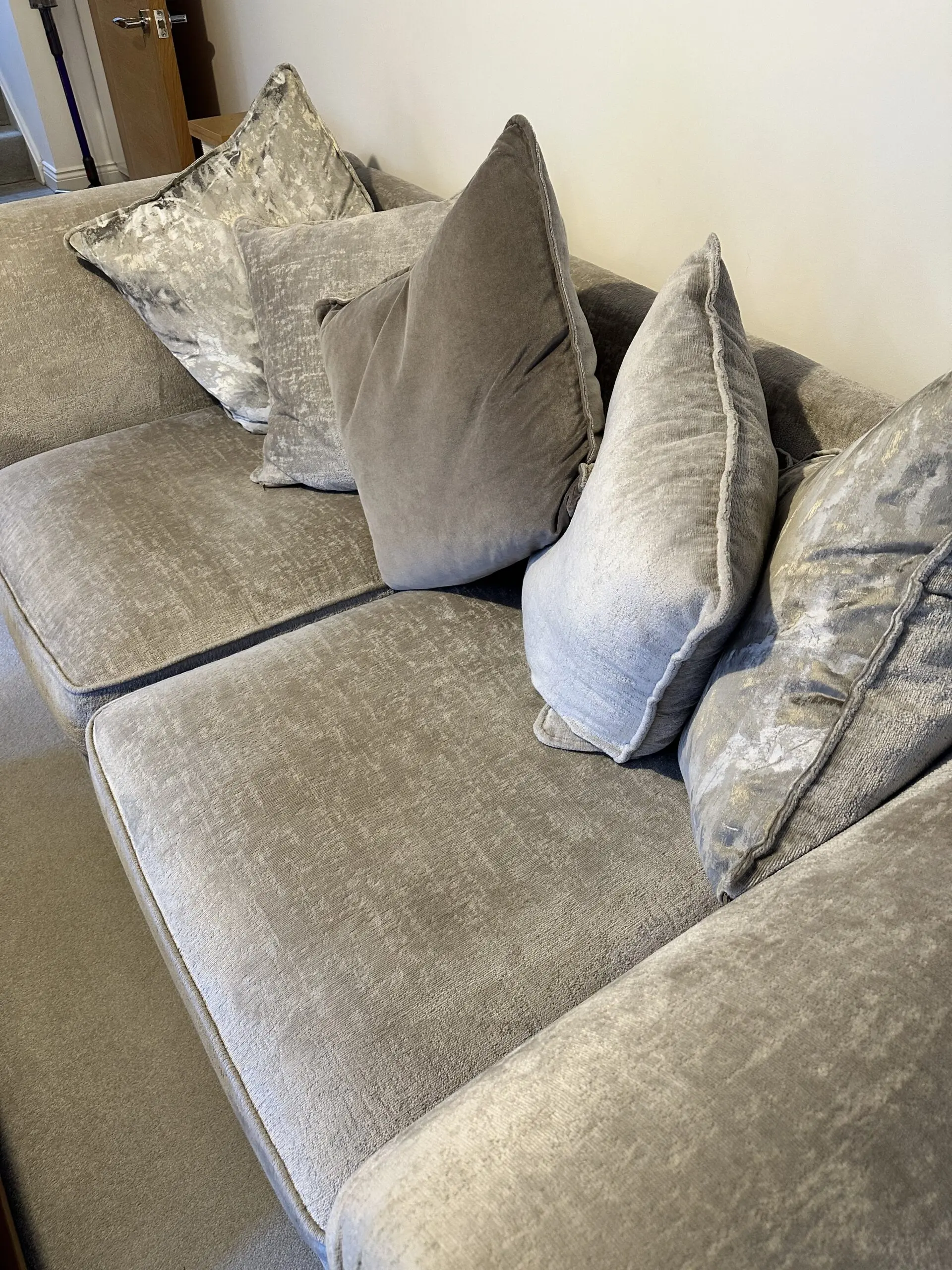 Both sofas come with 5 large mixed silver/grey cushions.