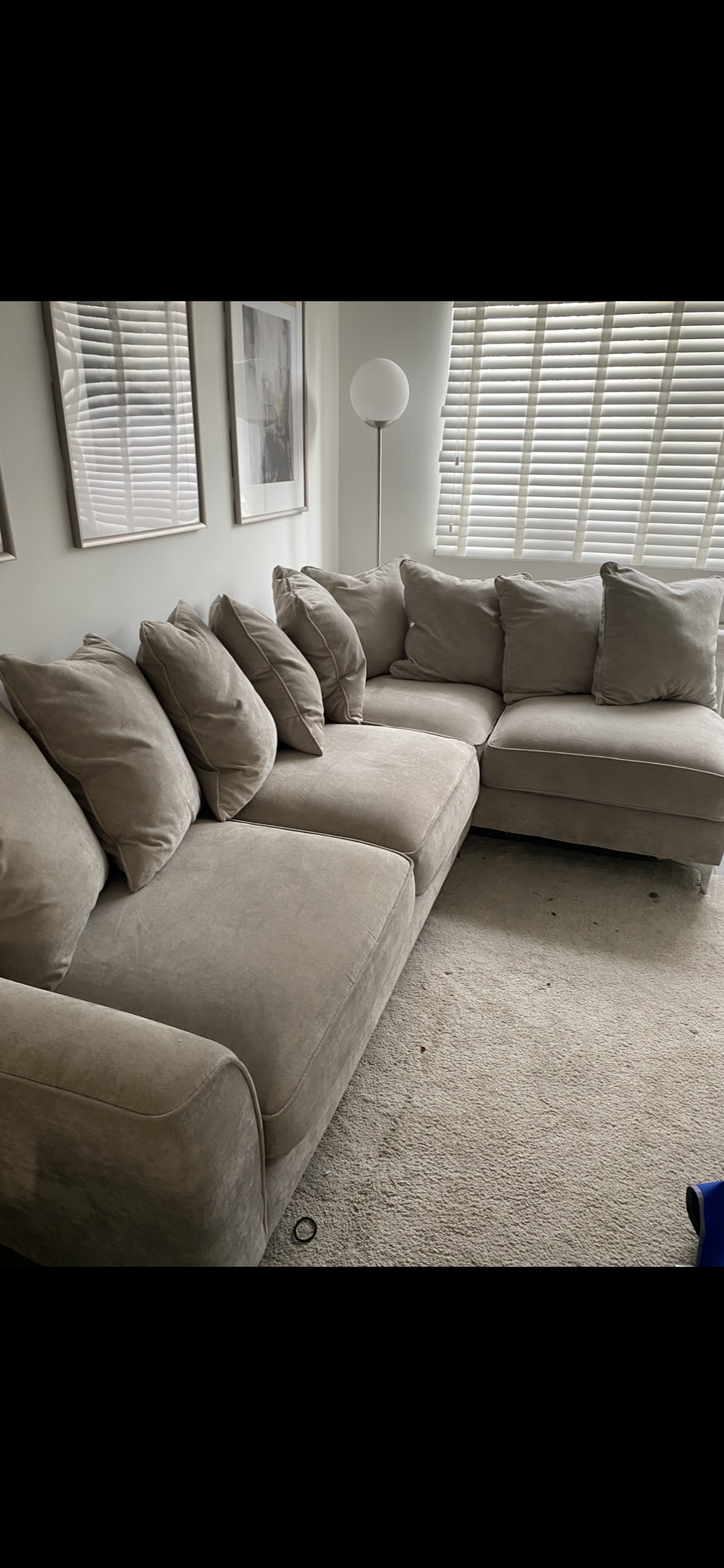 This spacious and comfortable pillow back corner sofa is part of the Legend range from Furniture Village and is in the colour Kingston Silver, which is essentially a light grey.