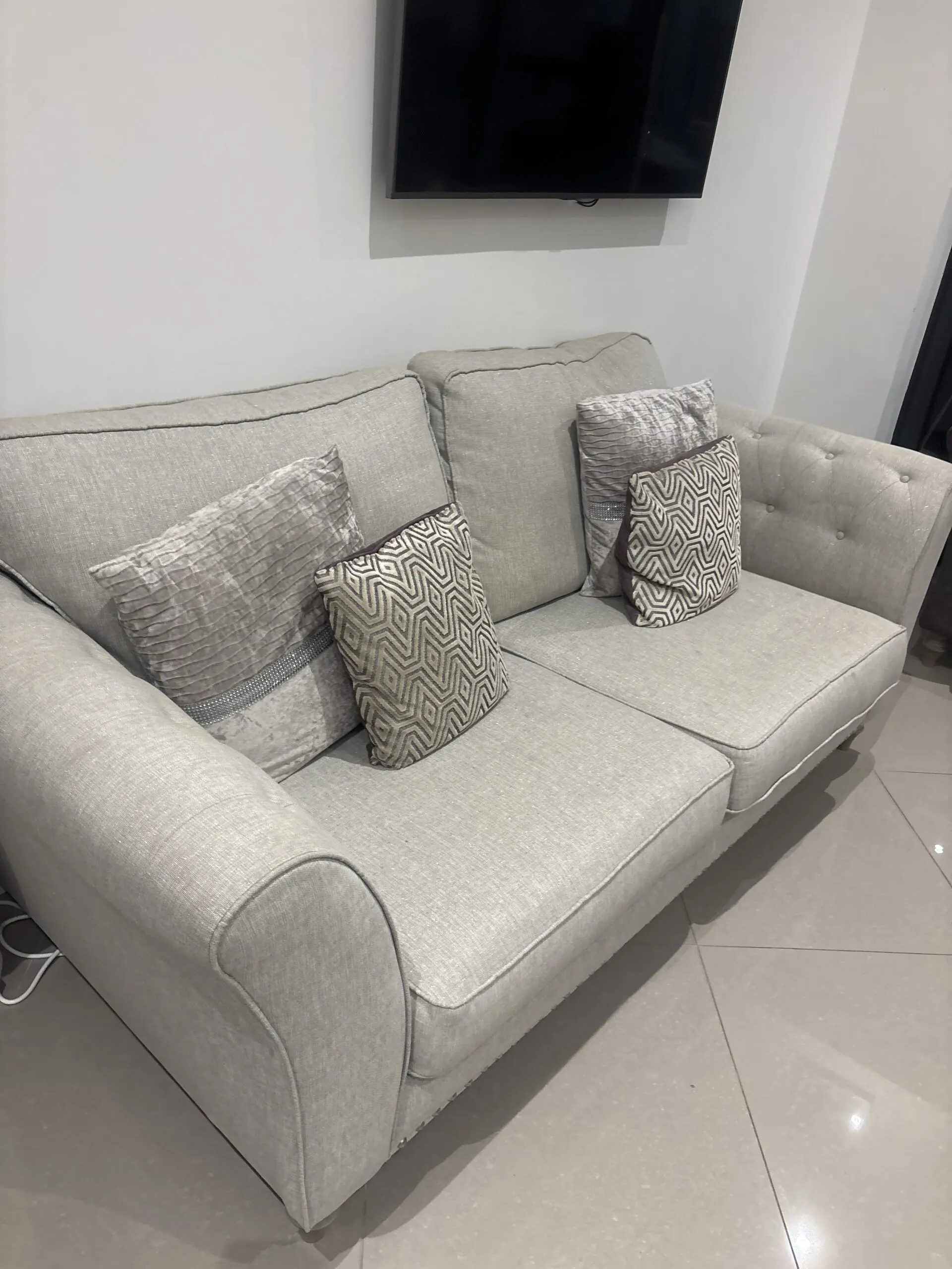 This stylish contemporary 3-seater sofa combines comfort with elegant design details. Features classic button-back arms, decorative studded trim along the base, and comes complete with coordinating patterned scatter cushions. The neutral tones make it perfect for any modern living space, whilst the generous seating provides plenty of room for family relaxation. The sleek profile and quality construction ensure this piece will be a lasting addition to your home.