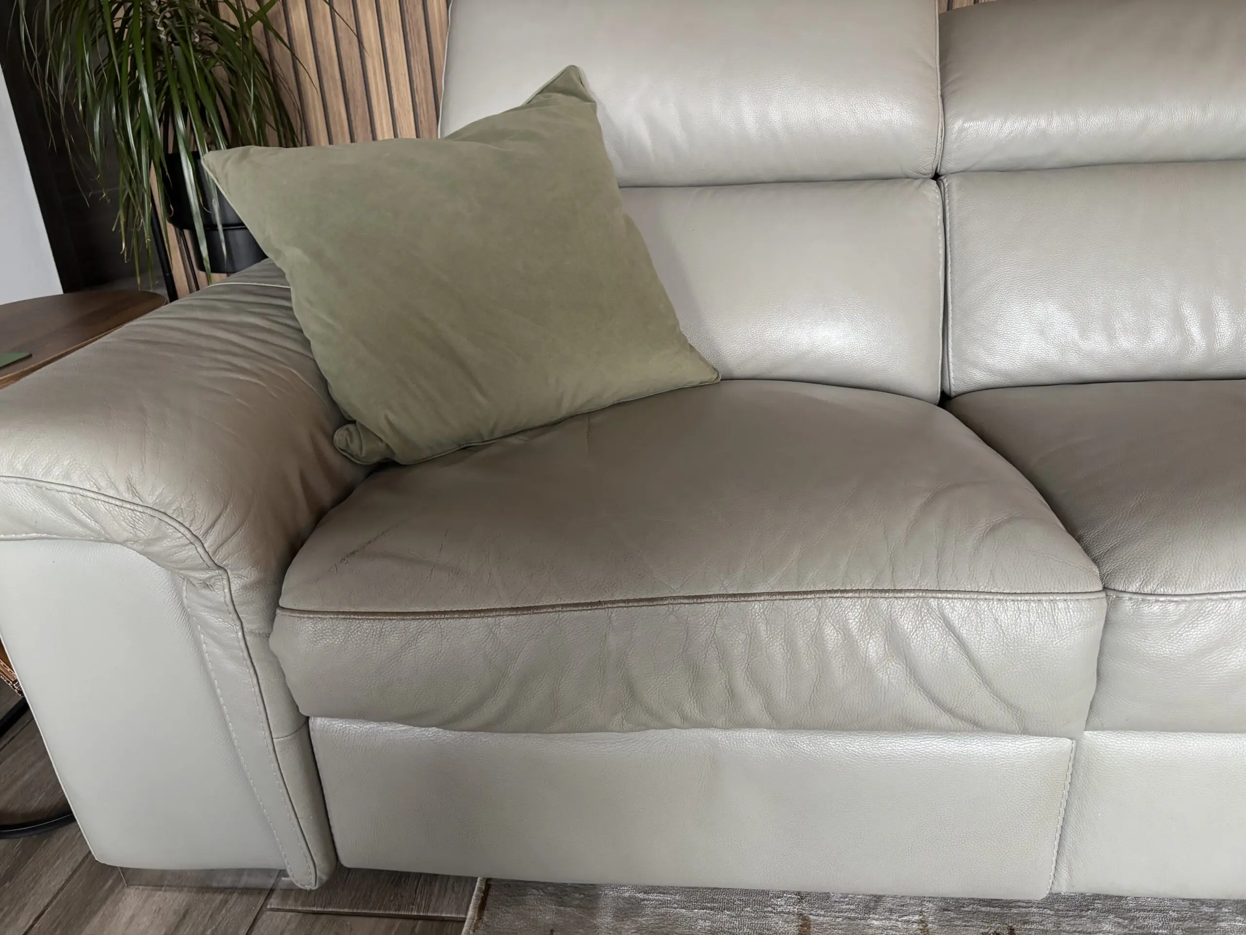 Purchased from Furniture Village 8 years ago for £3995. This Grey Italian Leather sofa boasts ratchet headrests, chaise on the right and power recliner on the left. It comes from a smoke free home. It is very comfortable and selling due to Mrs wanting a new one. The recliner side ( where I sit) is comfortable but the next owner can refit foam in the base seat it they want. There is also visible signs of wear on the leather where I also sit. It is in excellent condition, apart from my seat mentioned above.