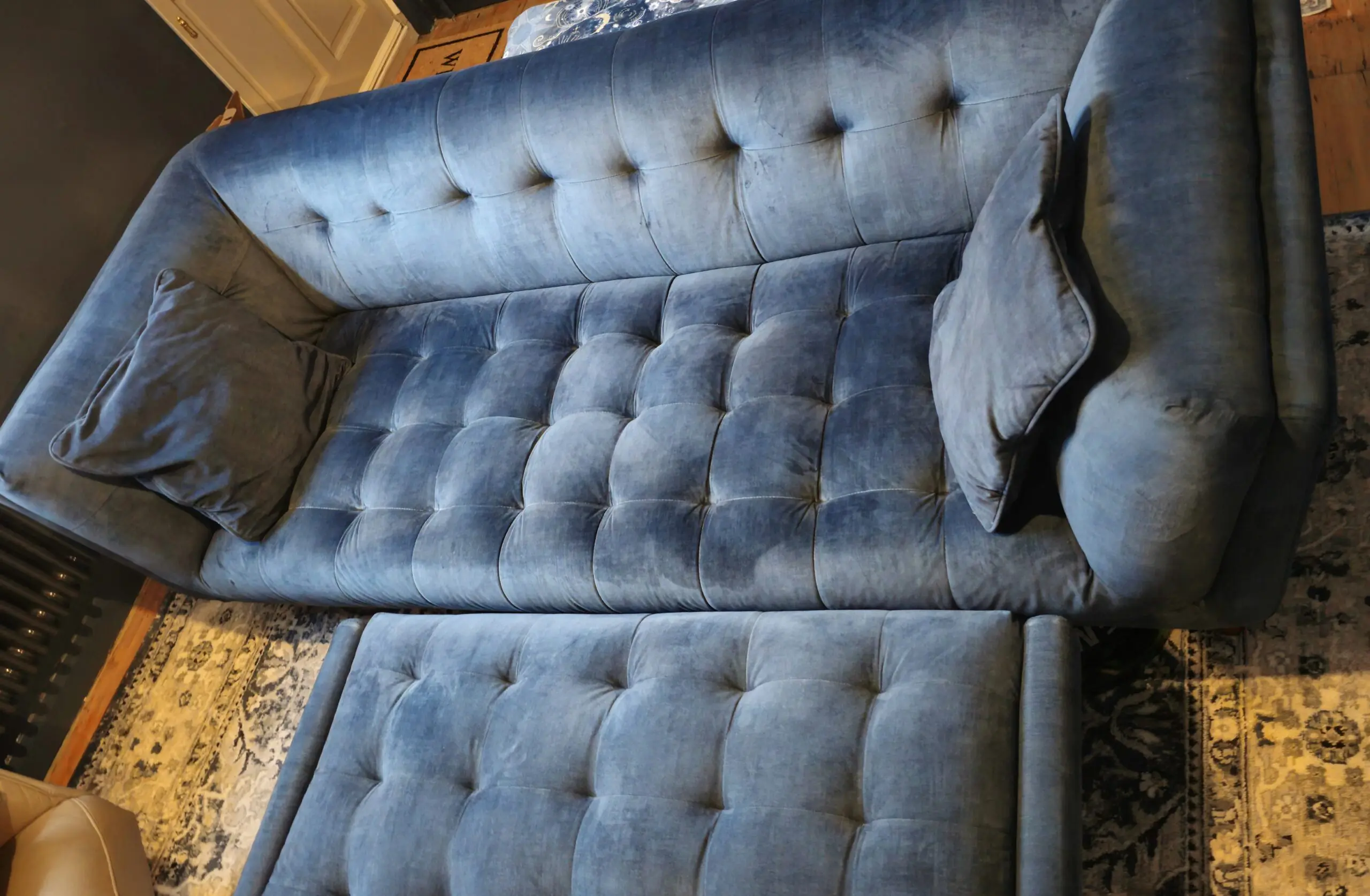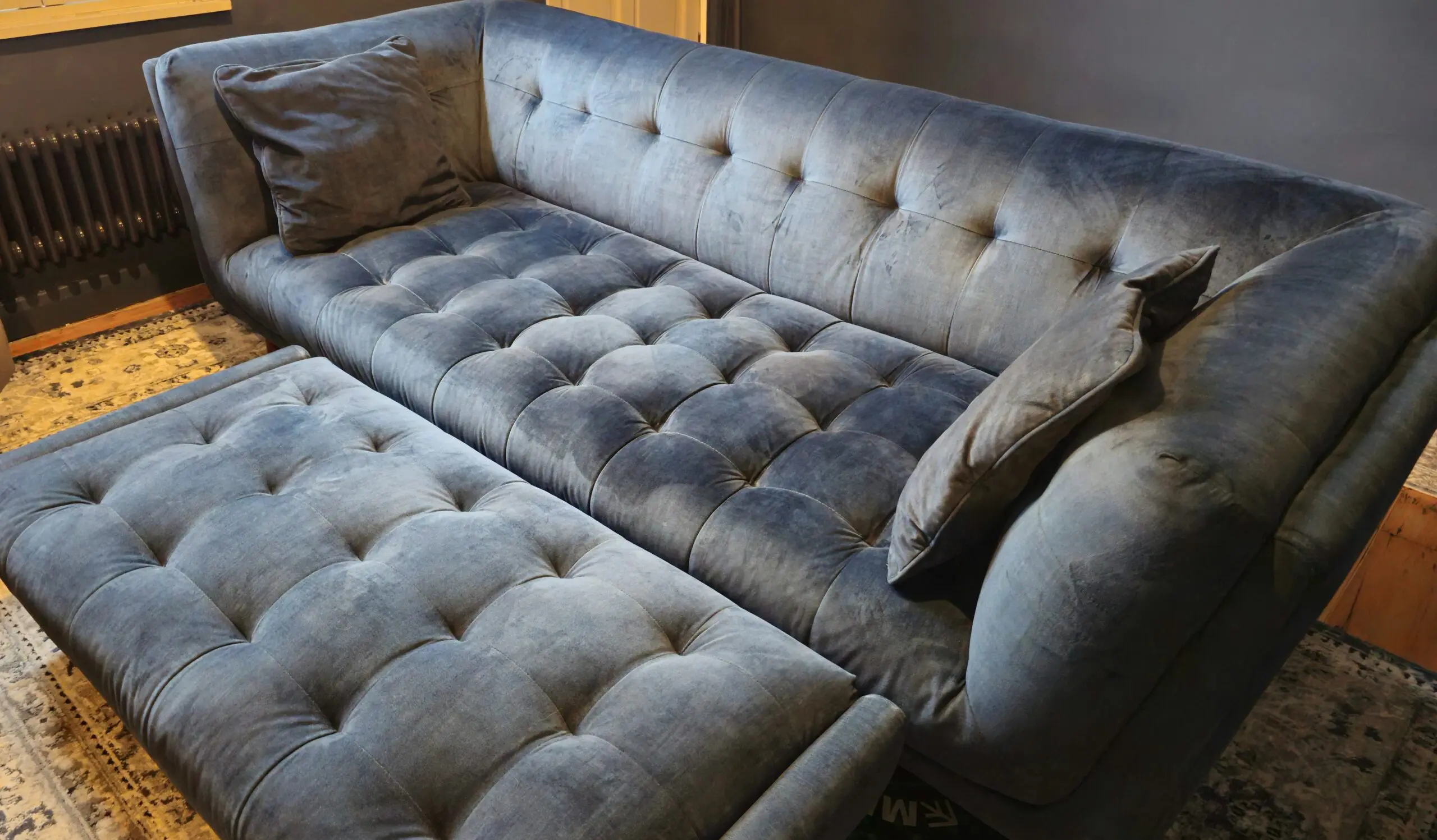 Good condition sofa with pocket sprung seats. Soft to sit on but hard-wearing and still very plump. There is a scratch on the cushion to the side which can be rectified with a fabric pen but is hidden with the included side cushions. Slight wear on the footstool arms. Getting rid of it only because it is now too big for the house we have moved into. Great for open plan living room – kitchens/dining rooms