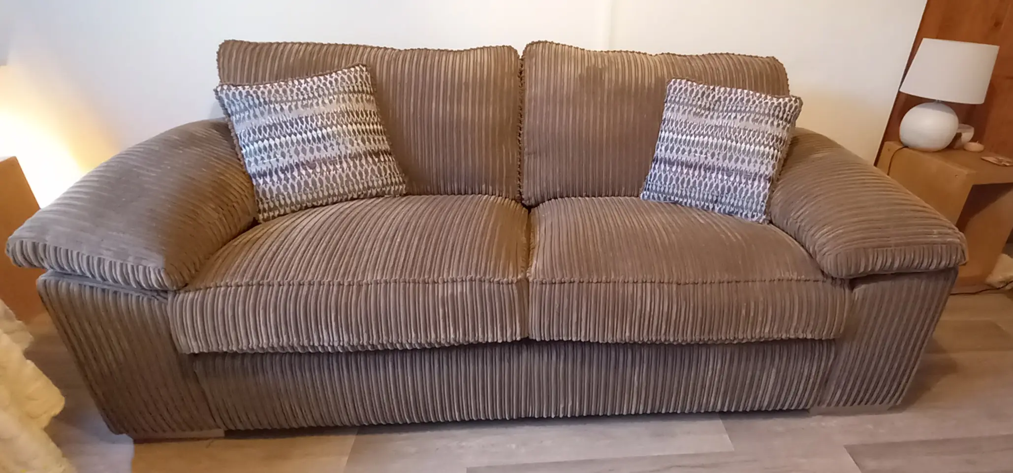 3 seater Dream Sofa. Material is Praline Cord, the scatter cushions are Sweetie Plum and the feet are light wood. This sofa is only 6 months old. Downsizing forces the sale.