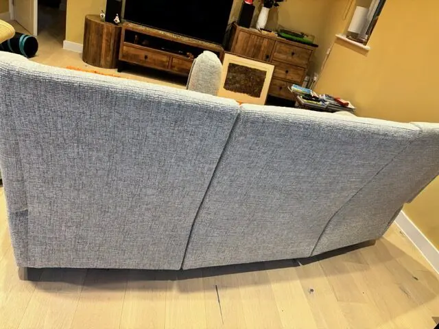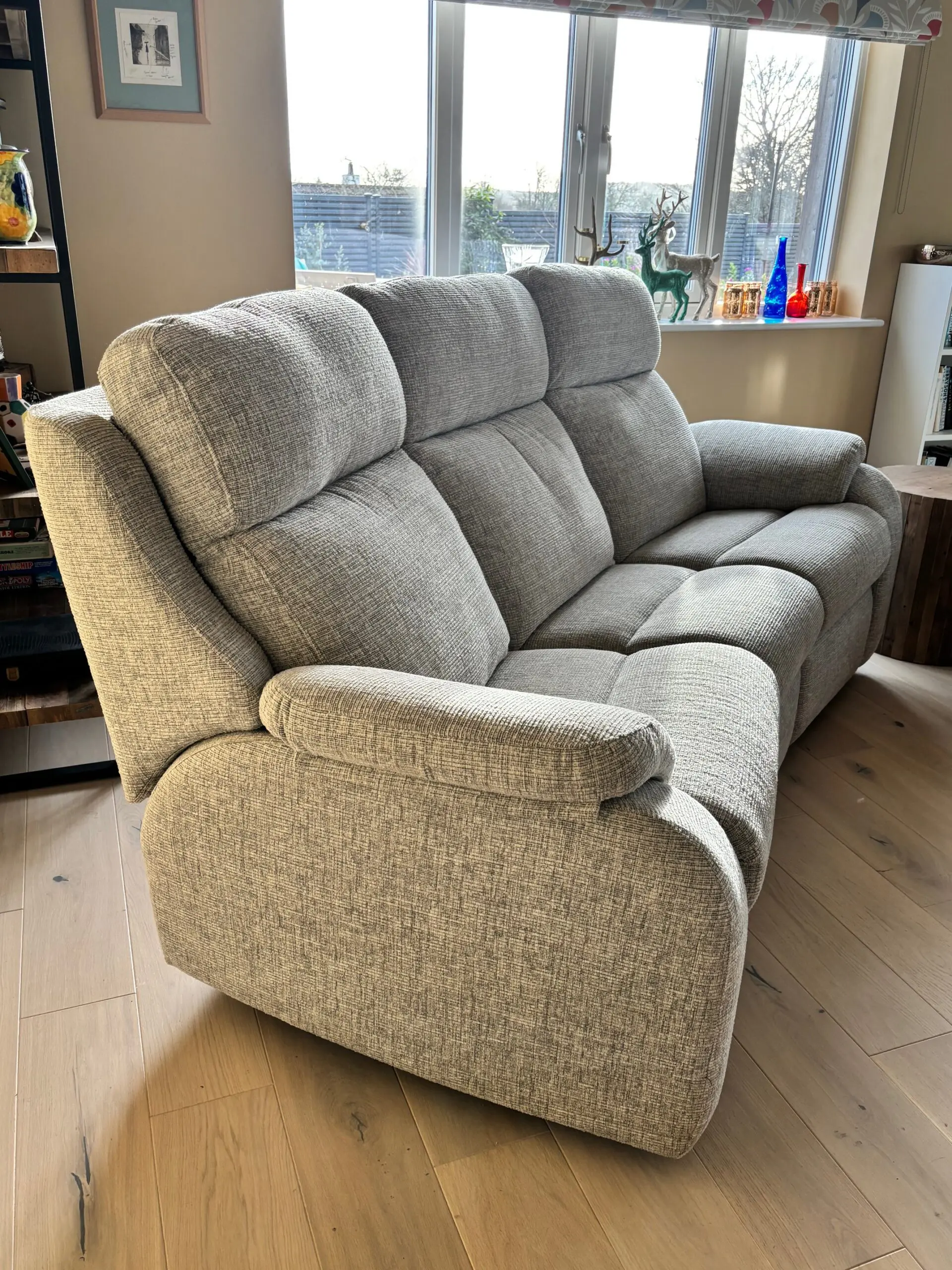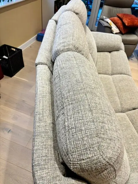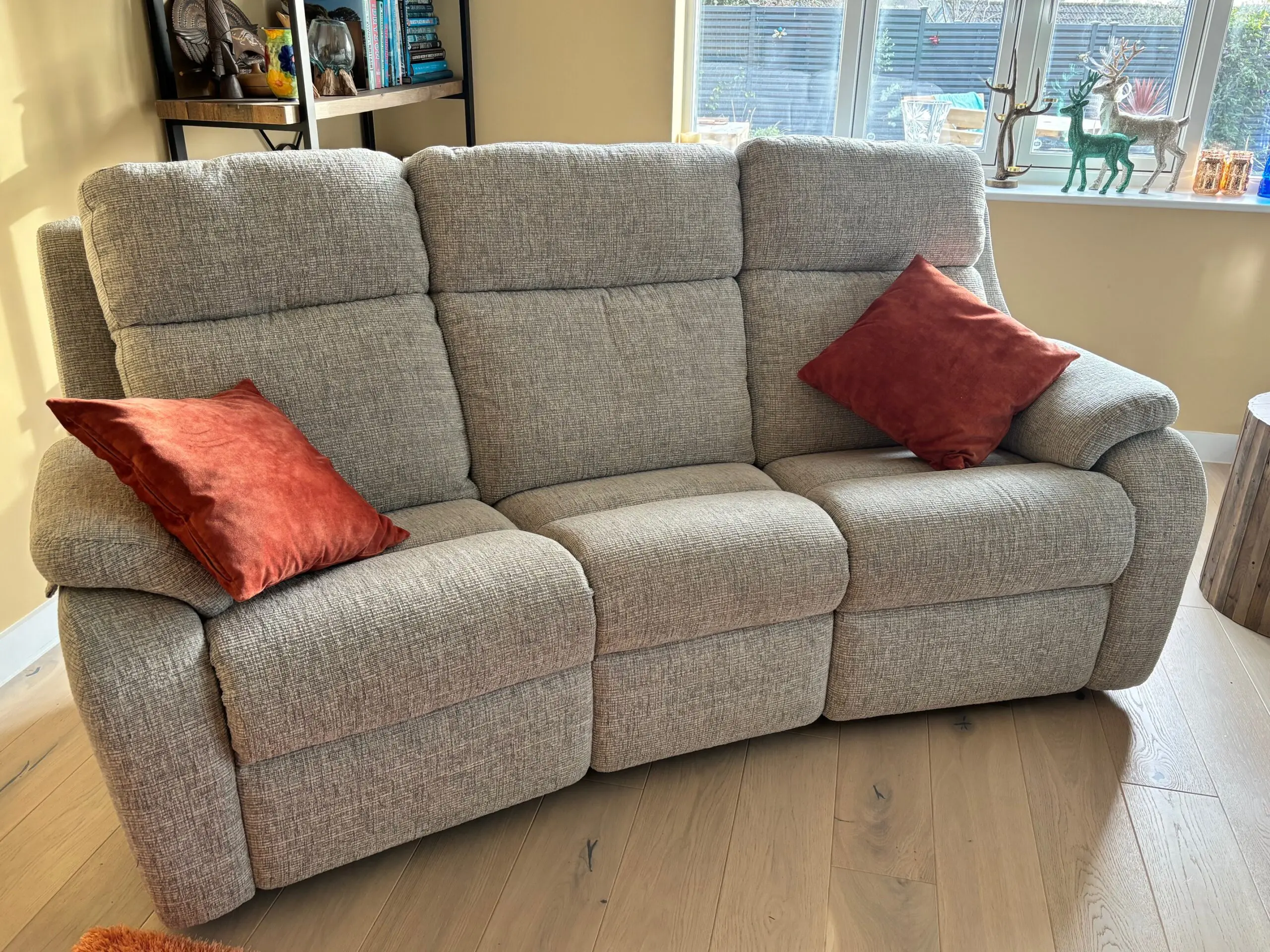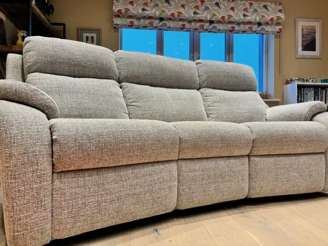 Stylish curved sofa , superb comfort from high back and pad over chaise design. Fabric upholstery in excellent condition and cushions firm. Sofa has only had very light use and is still covered by 25 year guarantee. Online reviews testify to the design of this best selling sofa from G Plan