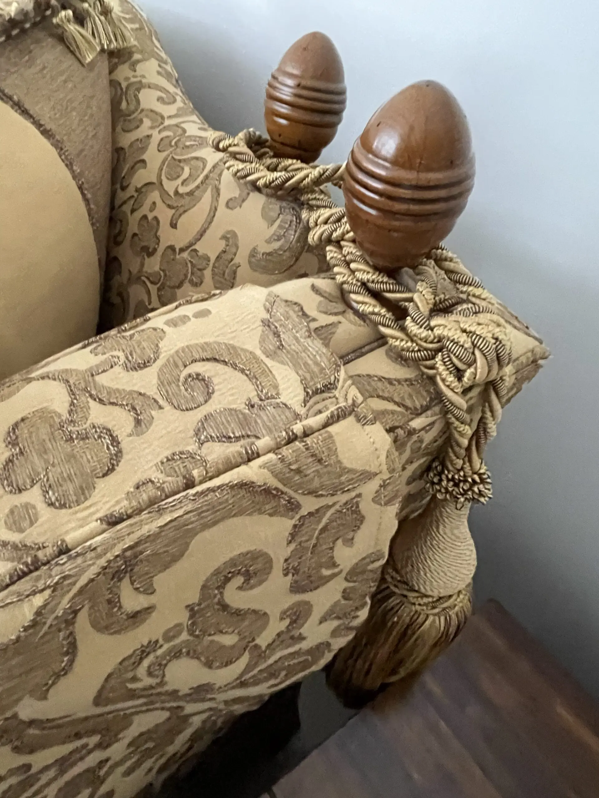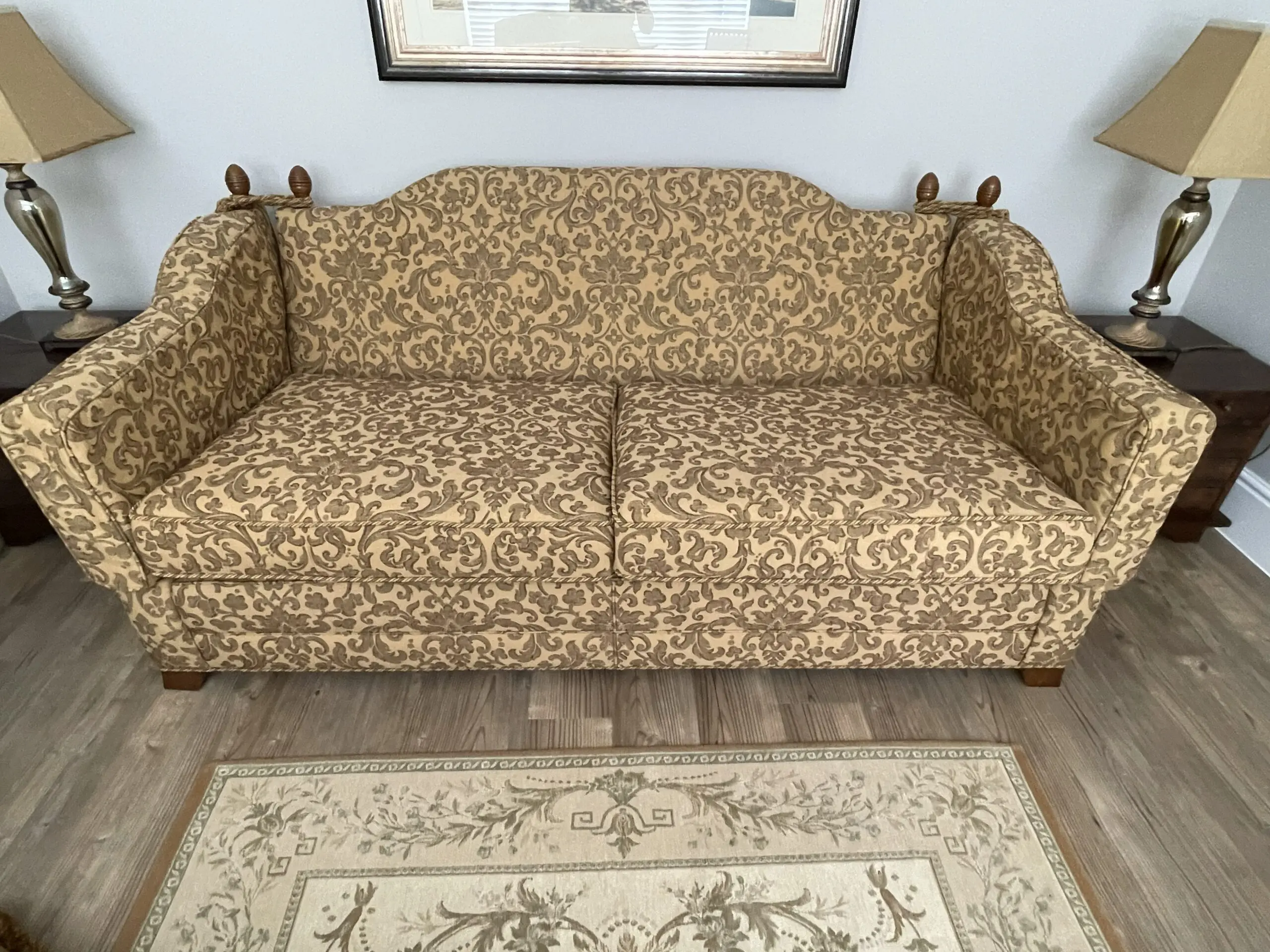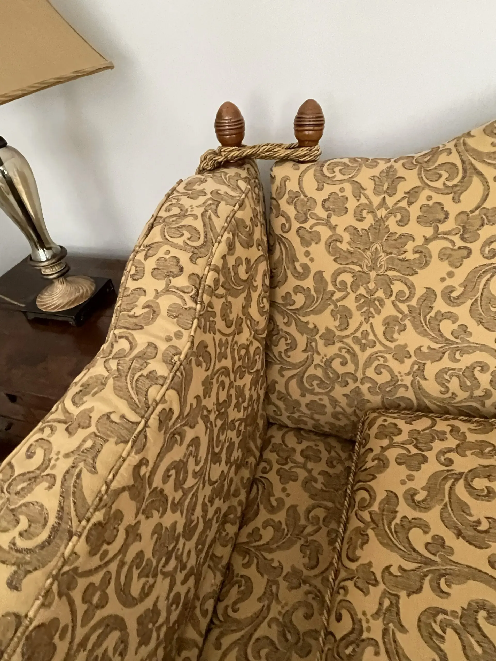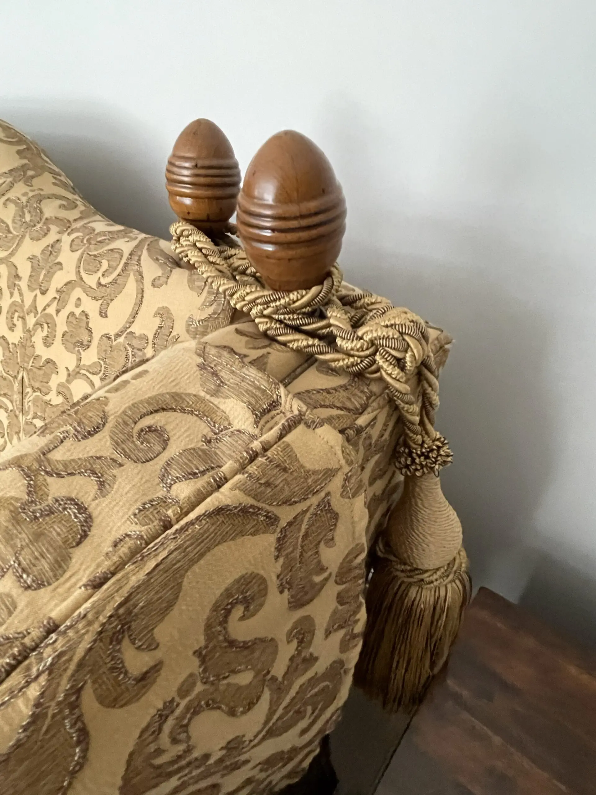 This sofa manufactured in 2008 is most likely to be from Gascoigne Designs. Exact provenance is no longer available due to moving a third time since the Sofa was purchased new. Excellent condition although one finial received some damage on during furniture removals or temporary storage.