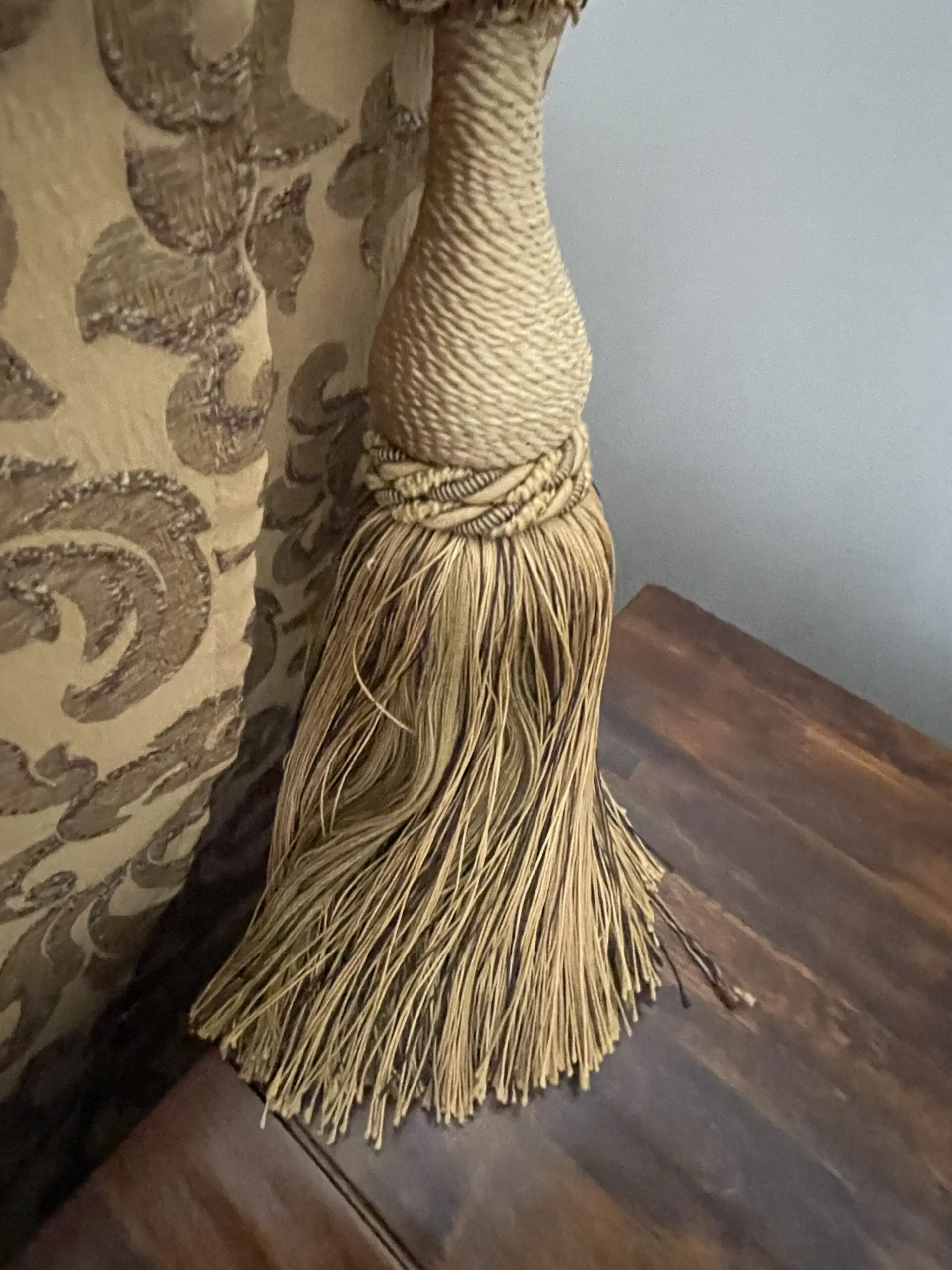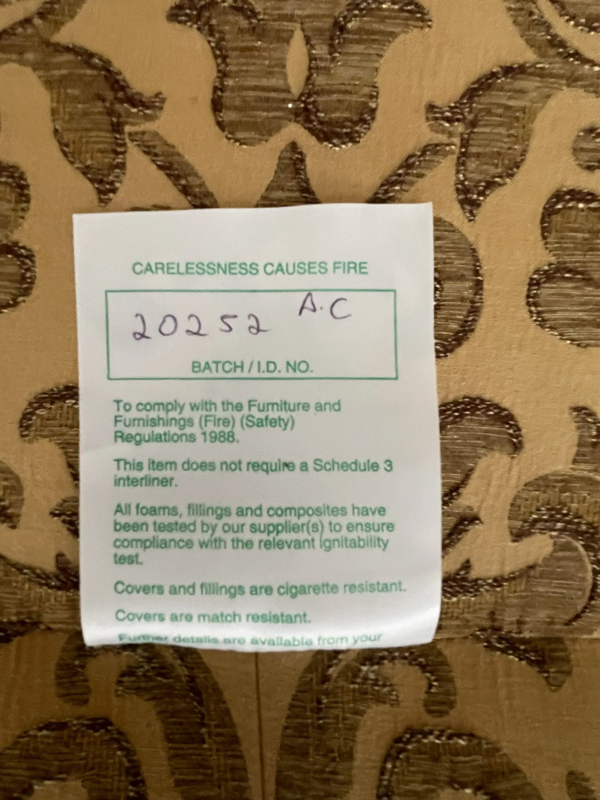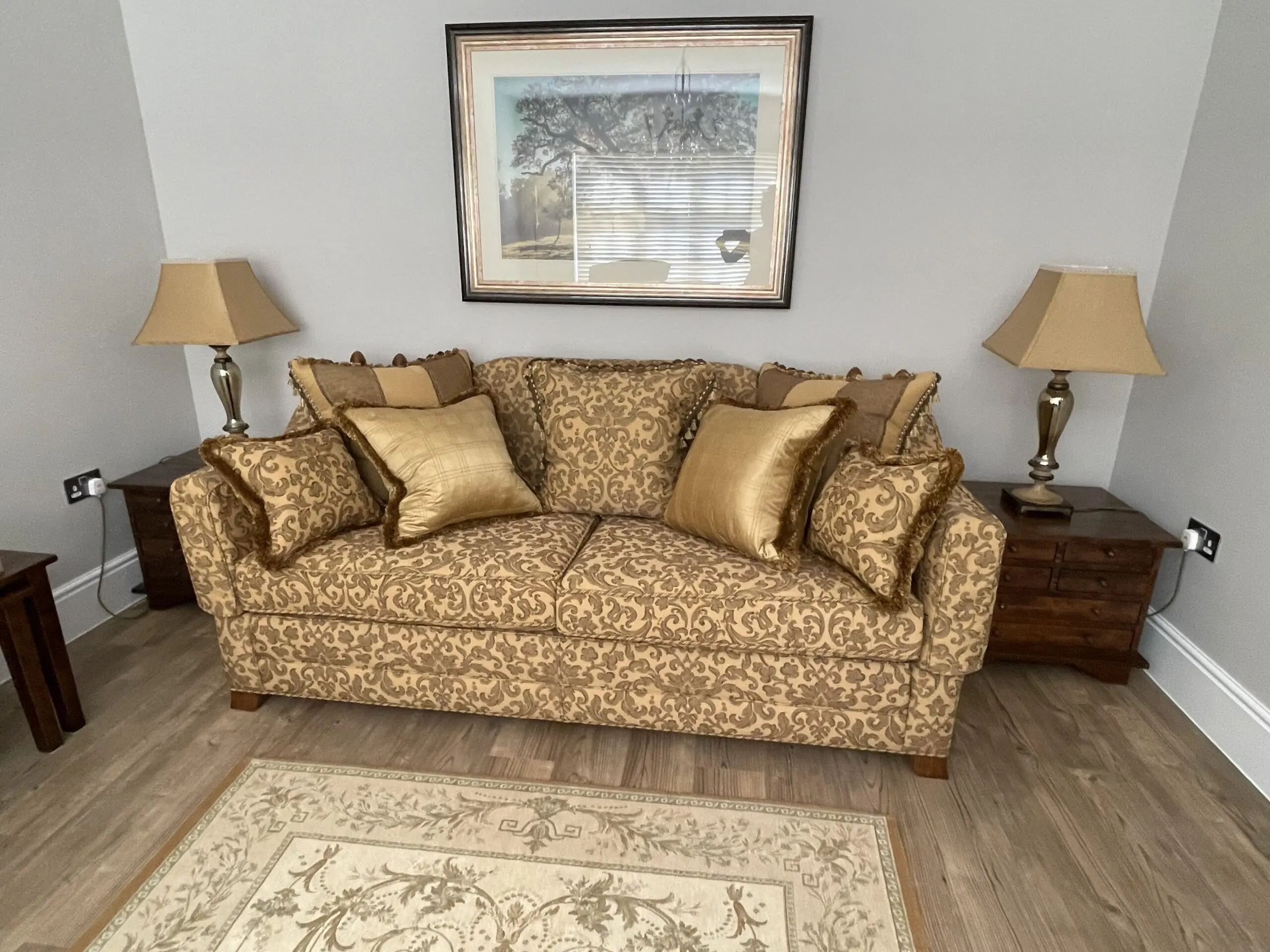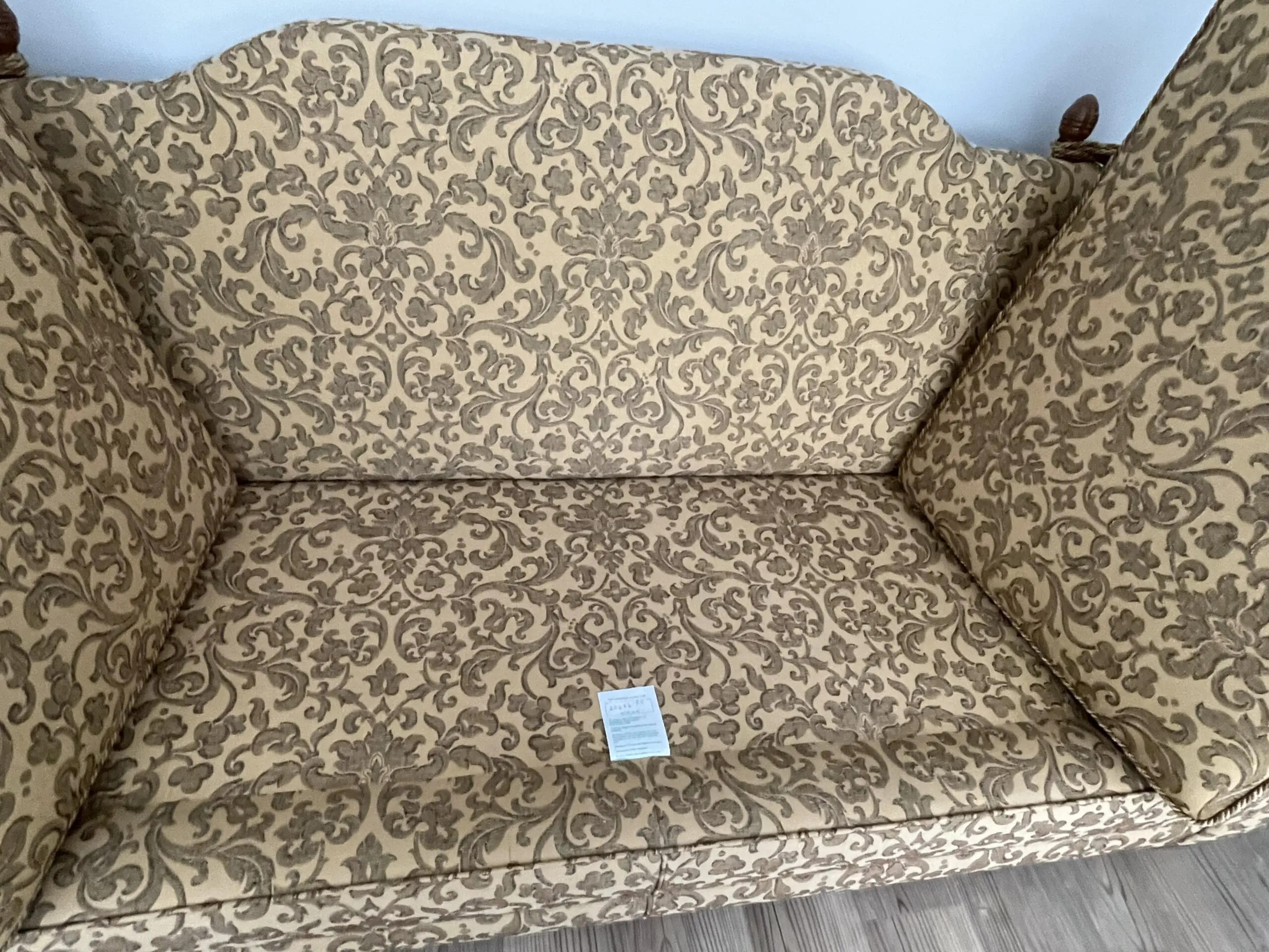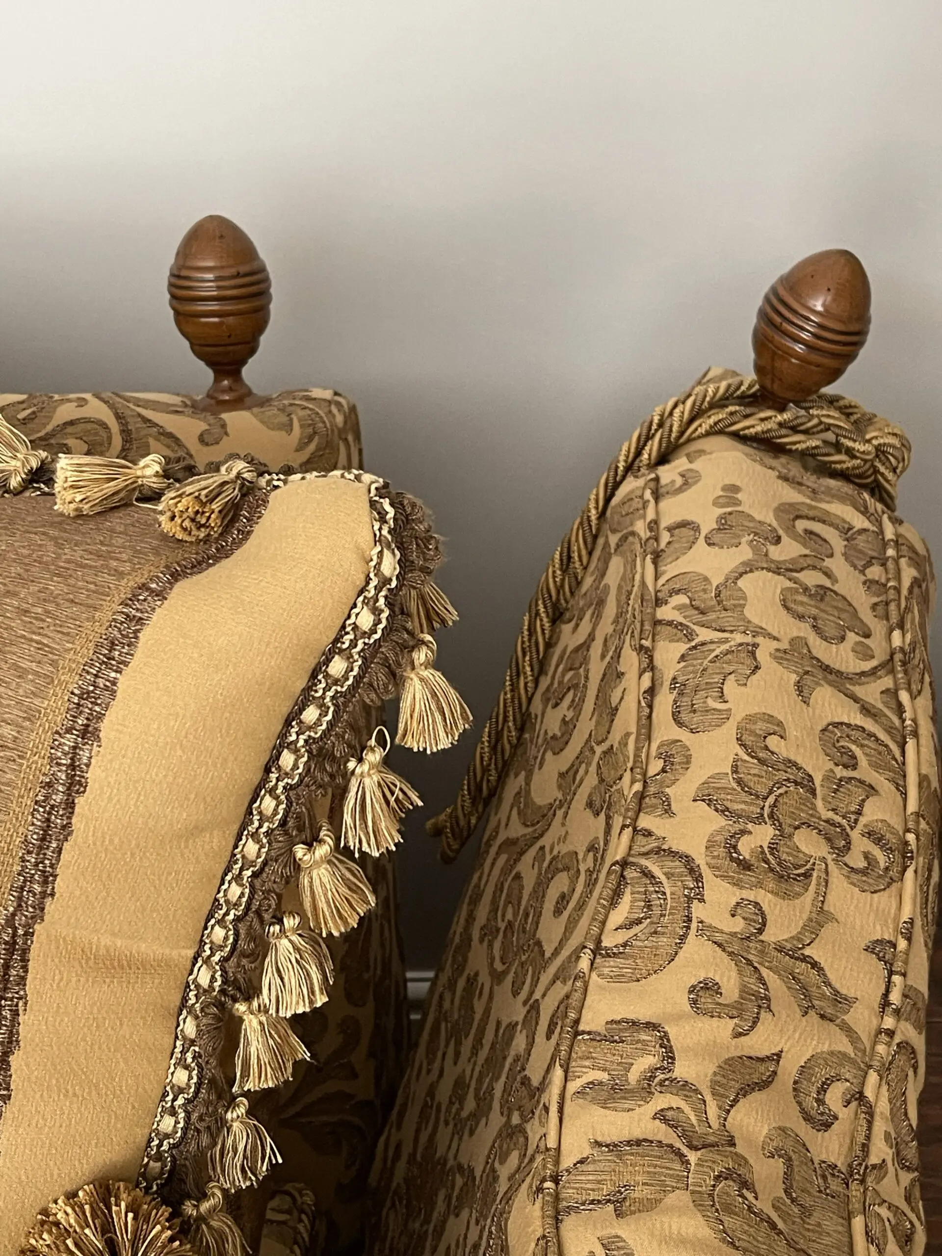 This sofa manufactured in 2008 is most likely to be from Gascoigne Designs. Exact provenance is no longer available due to moving a third time since the Sofa was purchased new. Excellent condition although one finial received some damage on during furniture removals or temporary storage.