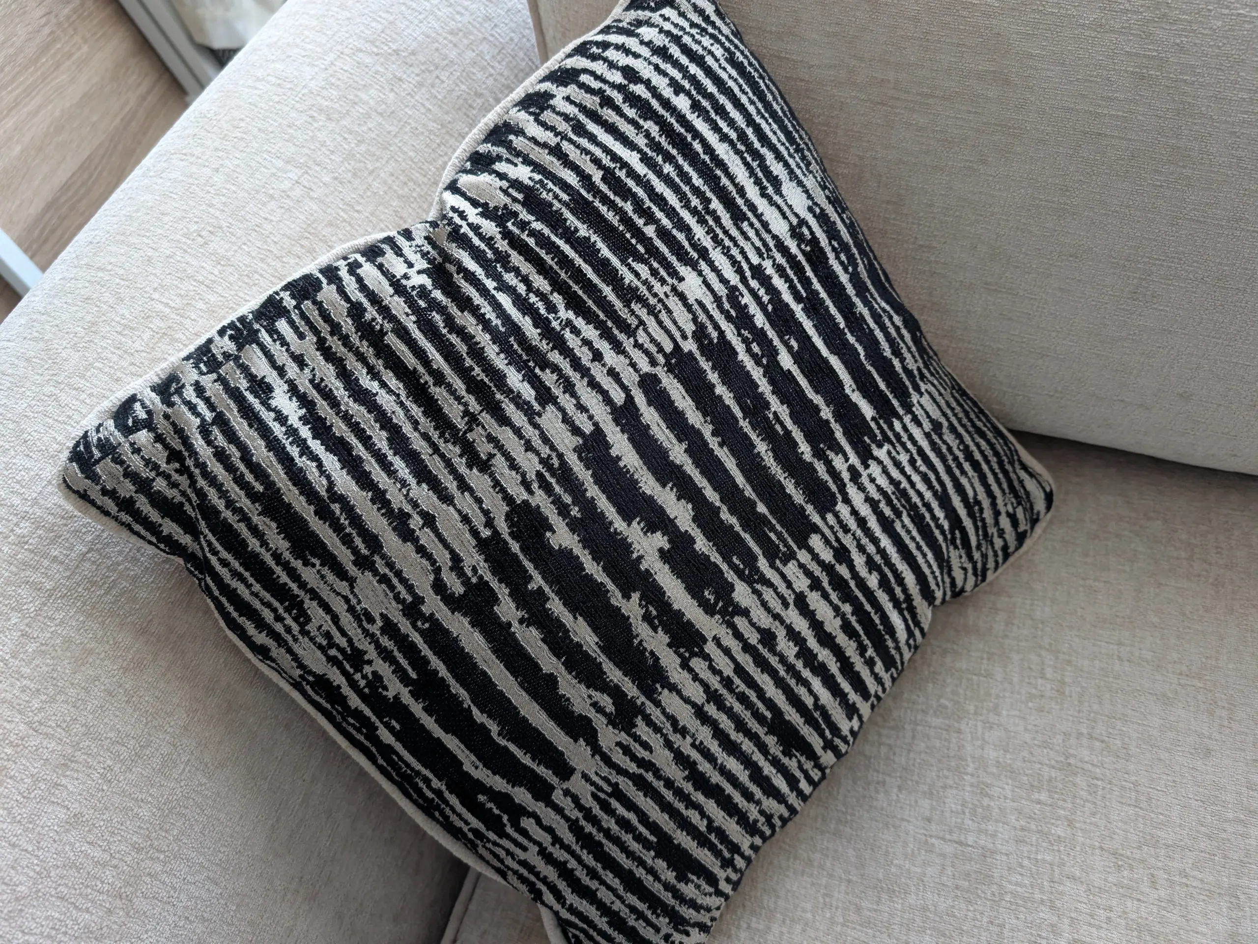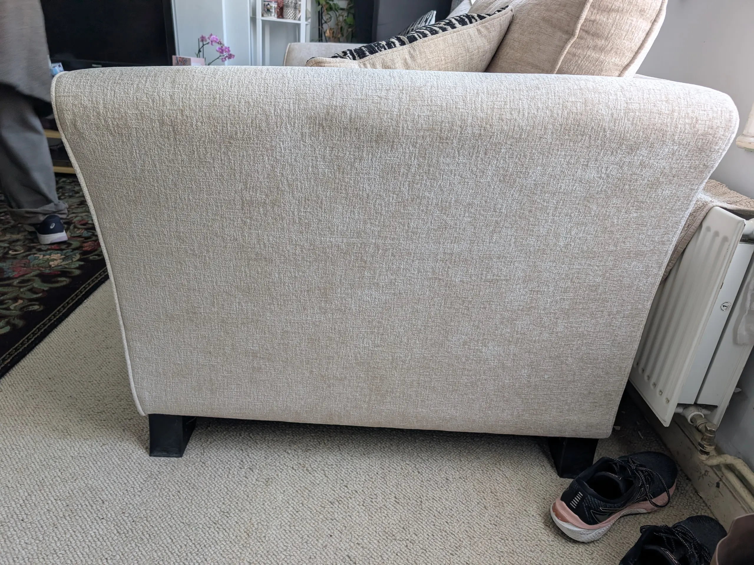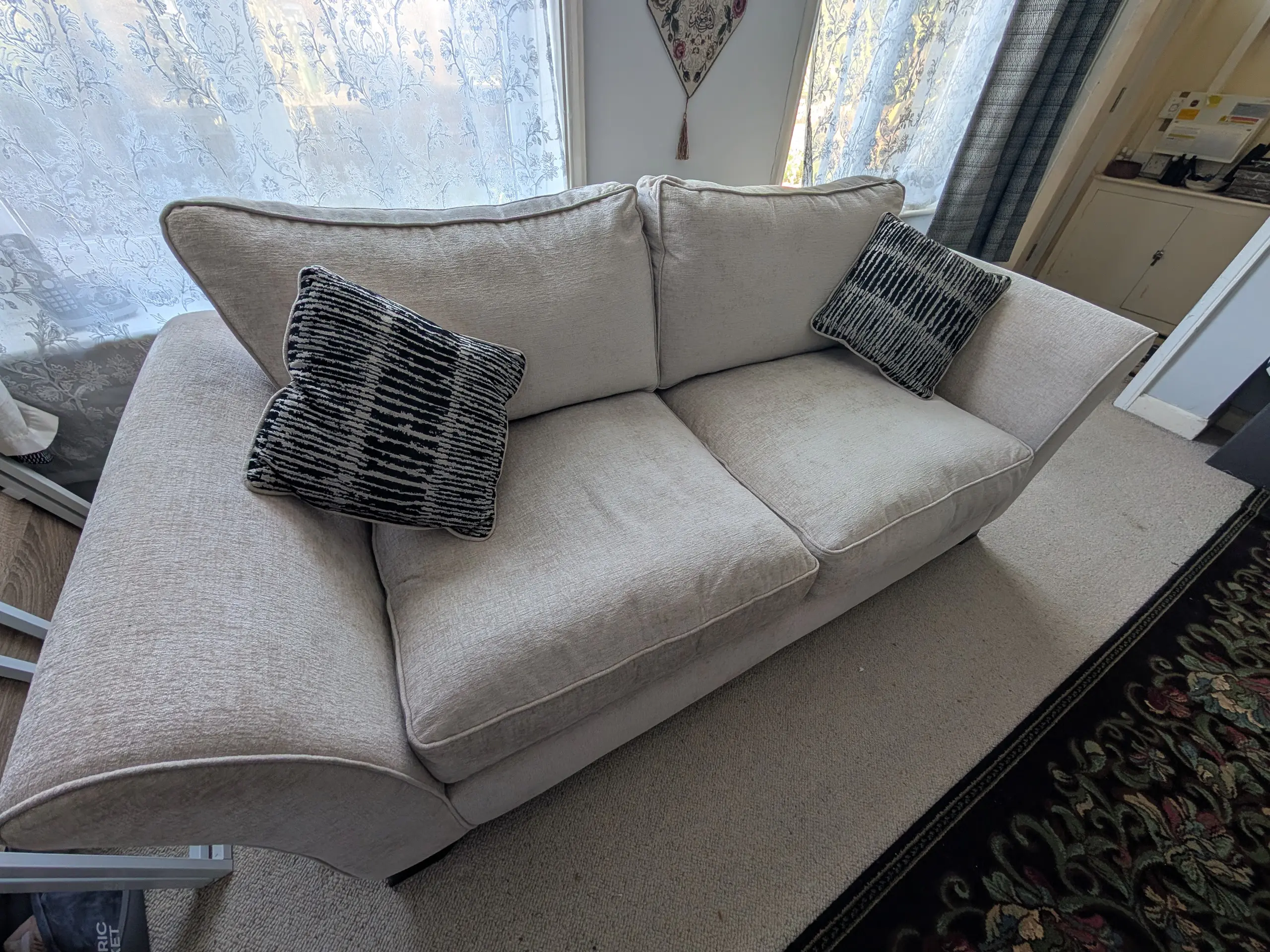 Comfortable and well looked after sofa including 2 cushions. This is a fabric sofa with wooden feet. This has been hardly used and is too big for the living room.