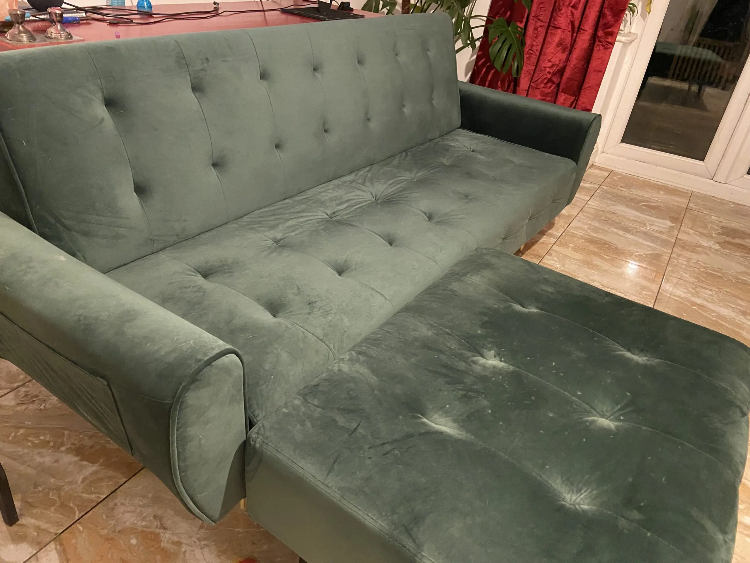 Green velvet sofa bed and footstool. Comfortably sits 3 people. Matching footstool.