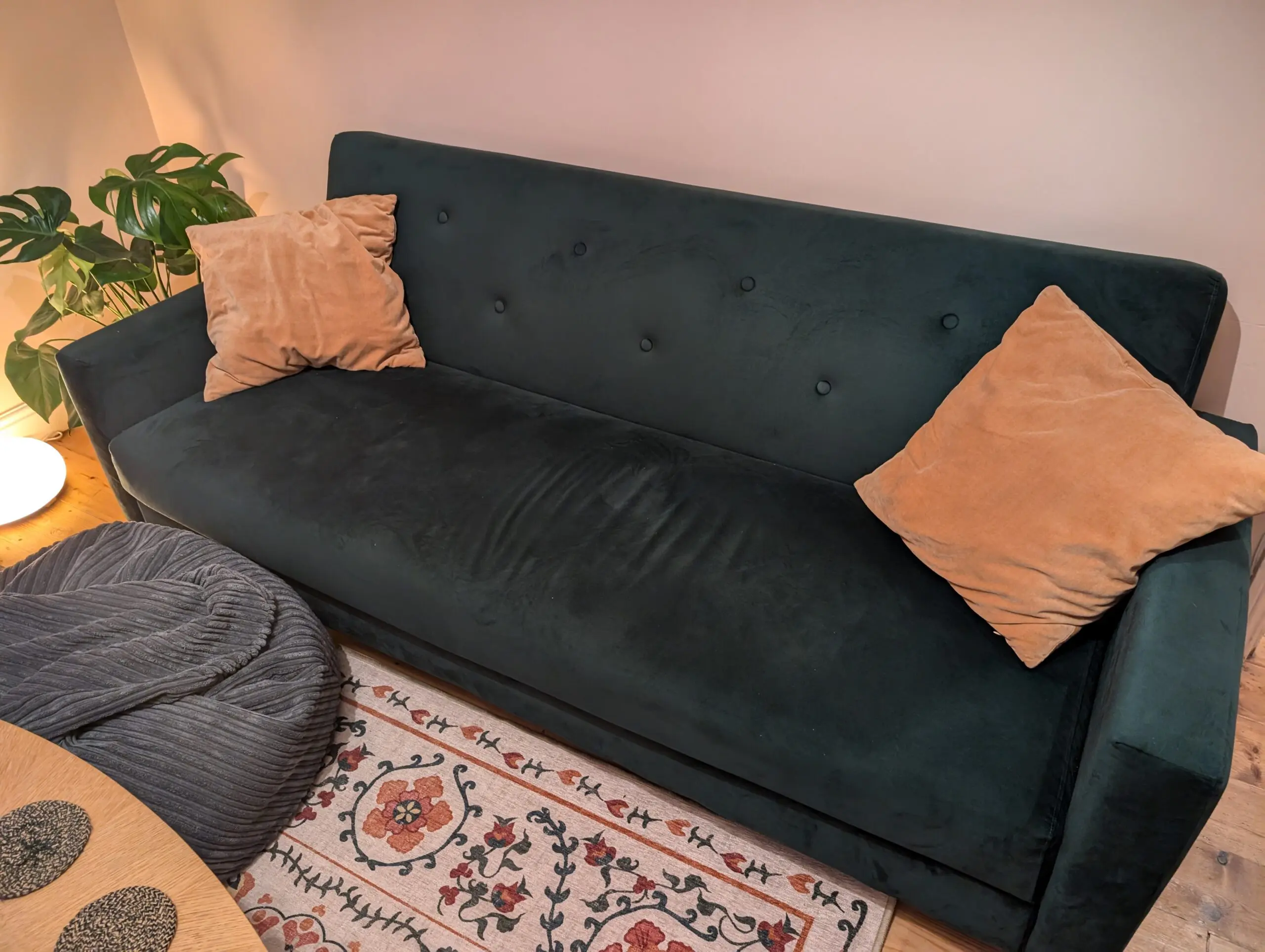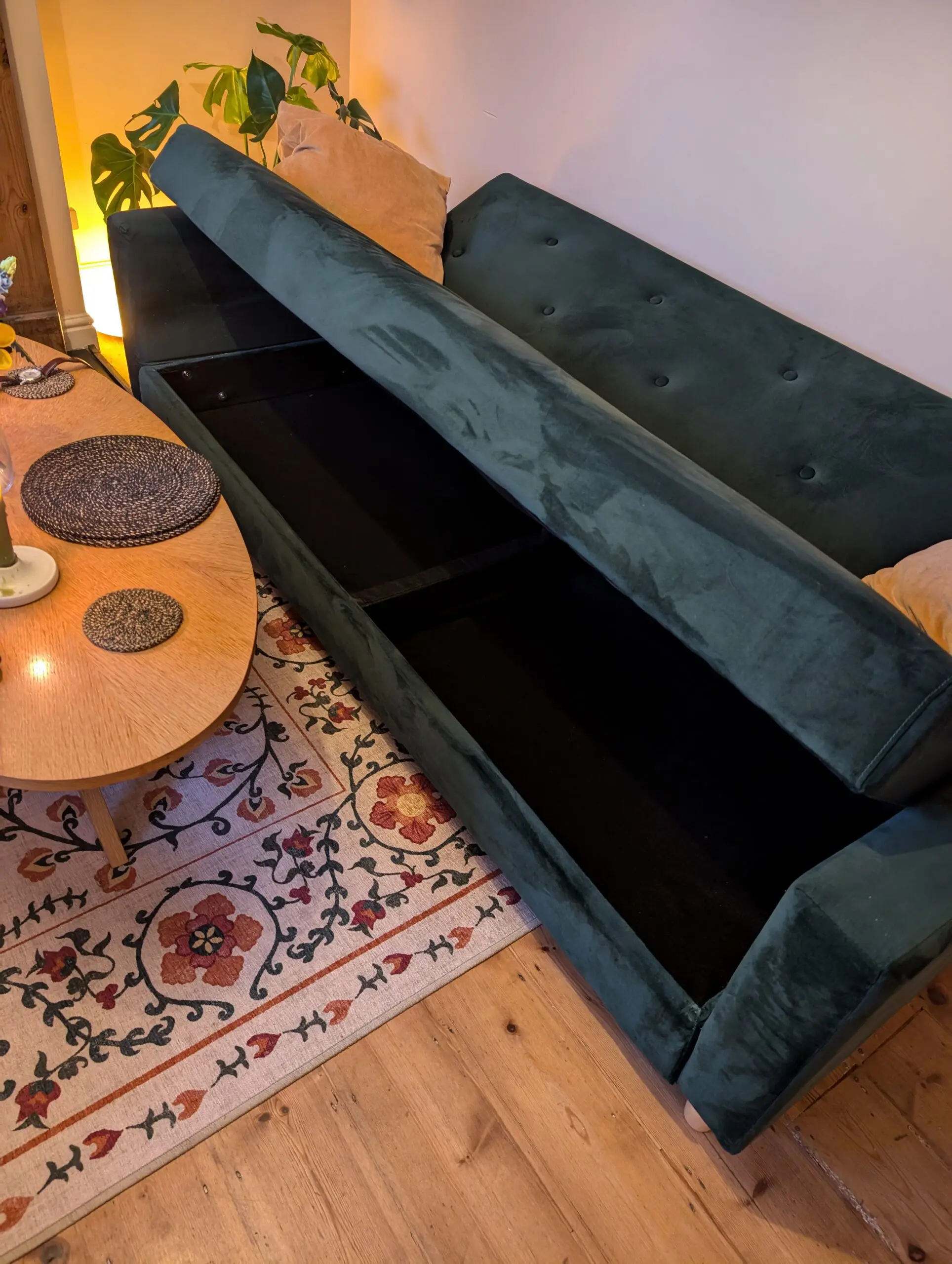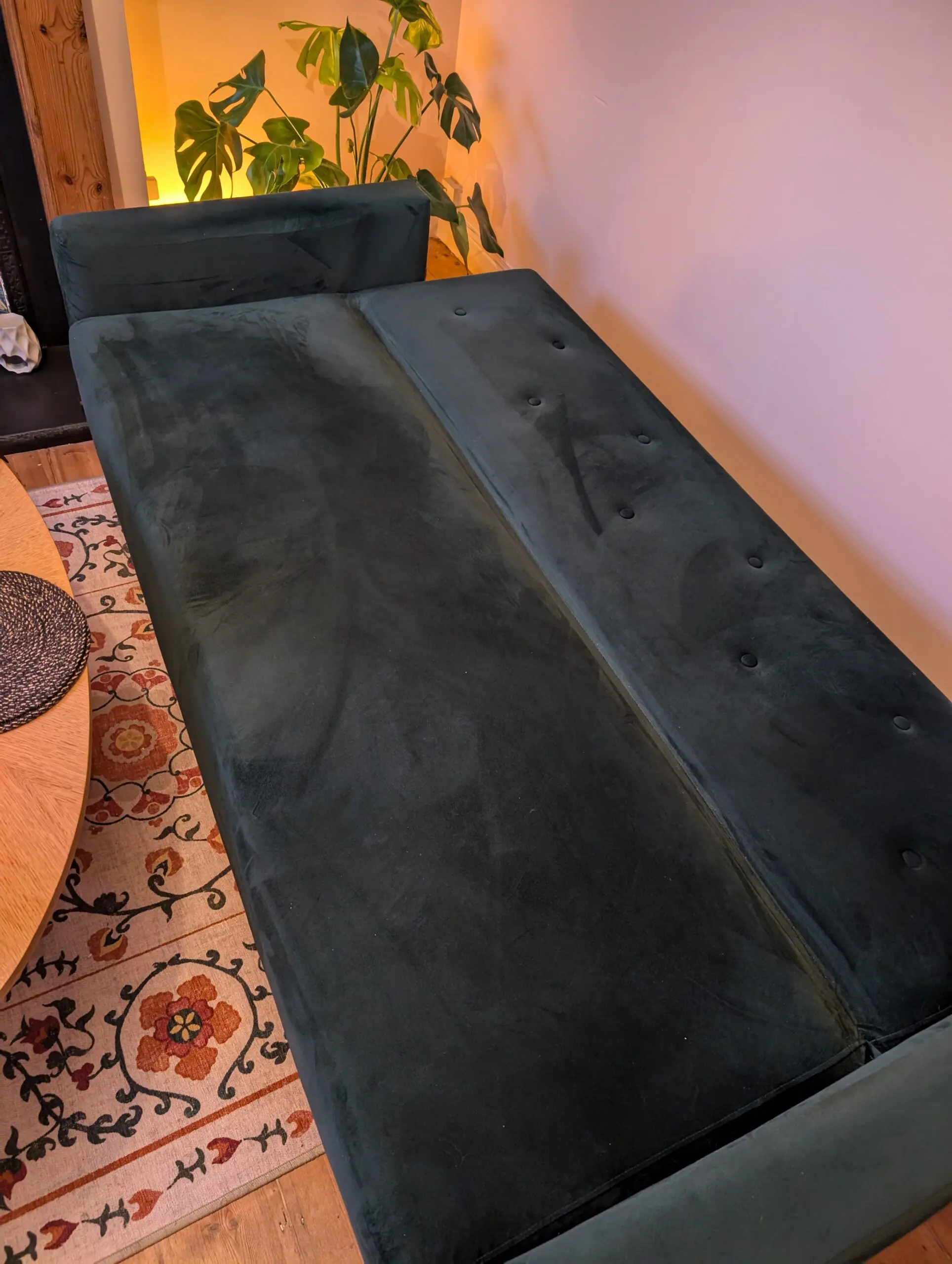 Green velvet sofa bed for sale. The back of the sofa folds down to become a bed (approx. 105cm wide/like a small double). Comes with under seat storage. In a good condition, only selling as we have recently moved house.
