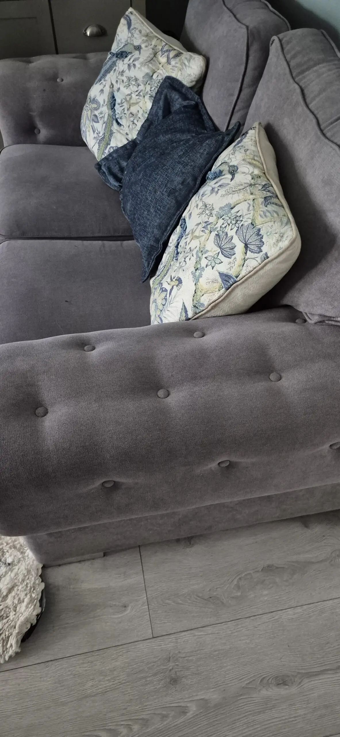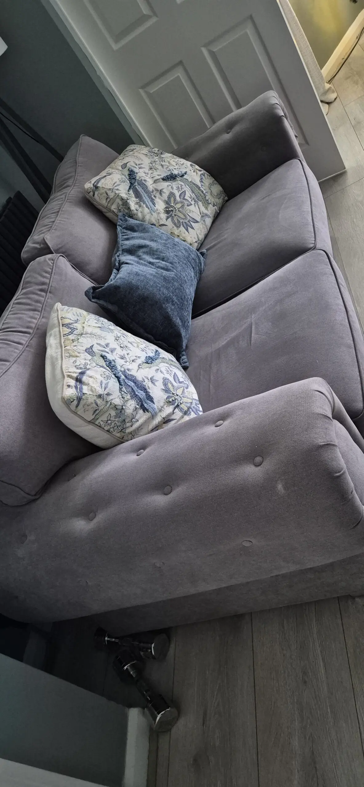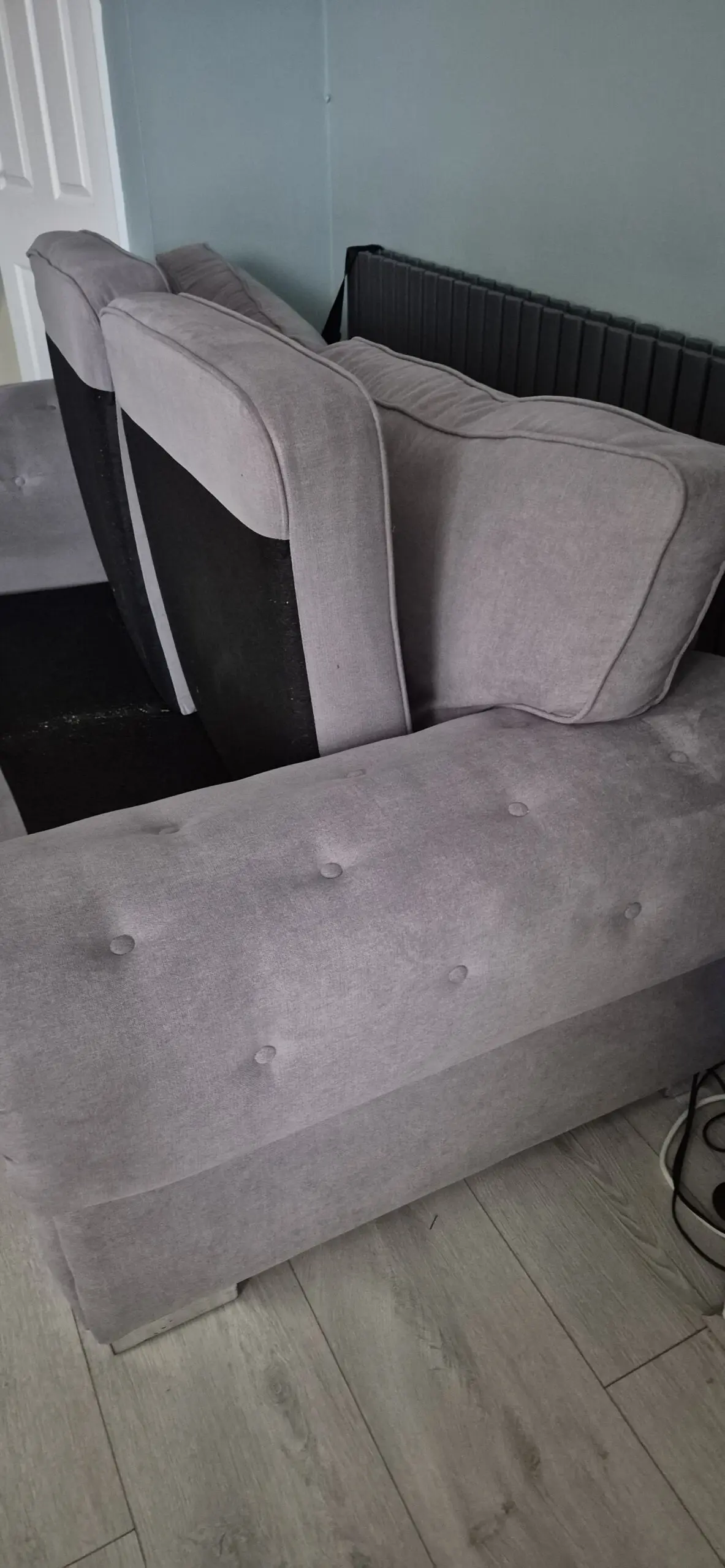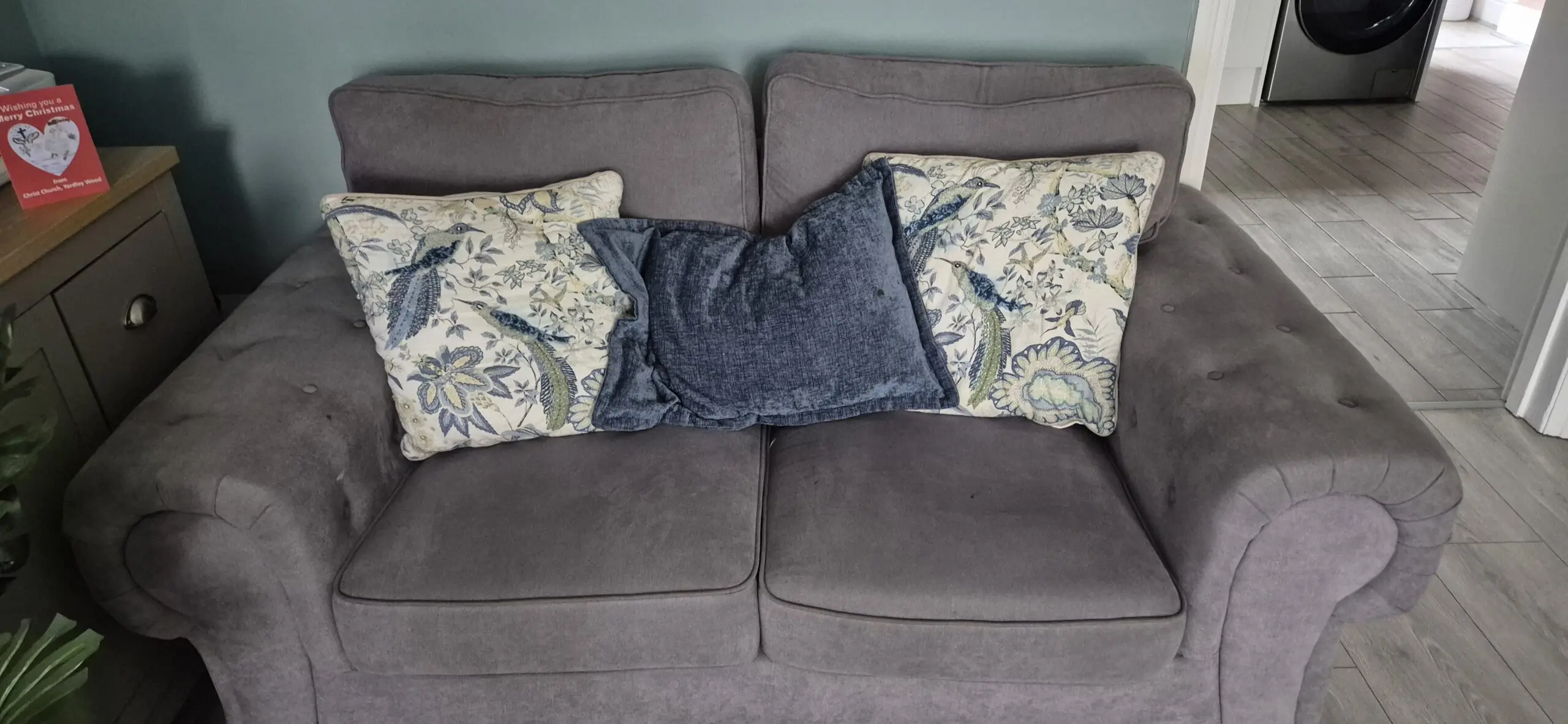 Three seater sofa in a lightish grey with accompanying two seater sofa,in good condition, all cushions still plump and no sagging springs.