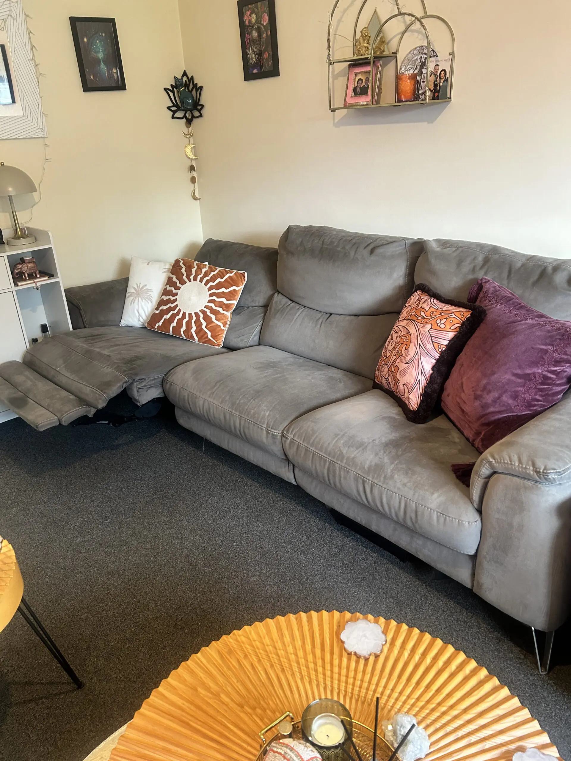 Grey 3 seater sofa, but could sit 4 people, one seat is an electric recliner. Some tears underneath sofa but not on actual sofa, good condition has been looked after and cleaned.