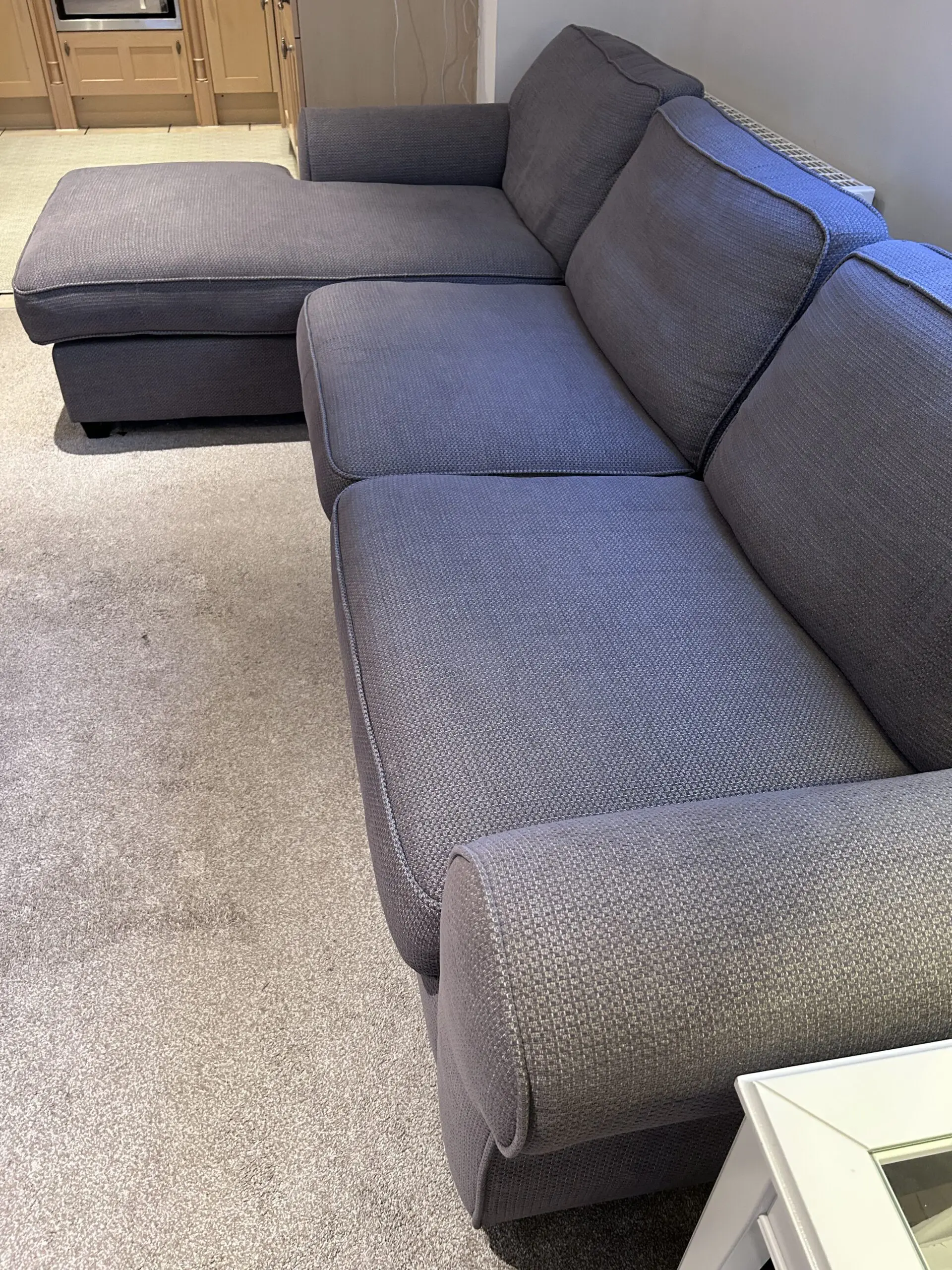 Nimbus 3 seater chaise left hand facing sofa, from Sofology. Grey textured. Small tear on base. Machine washable covers.
