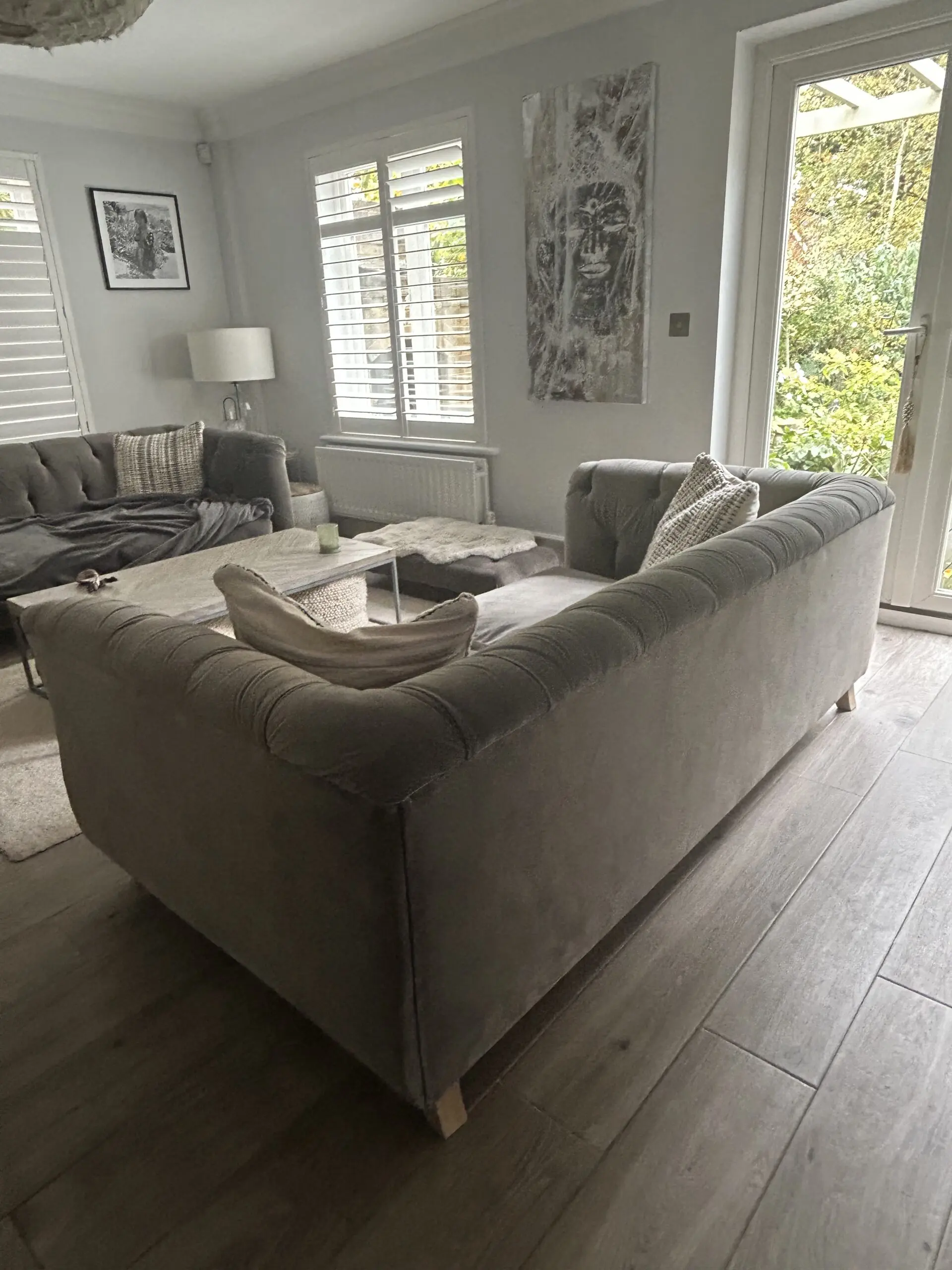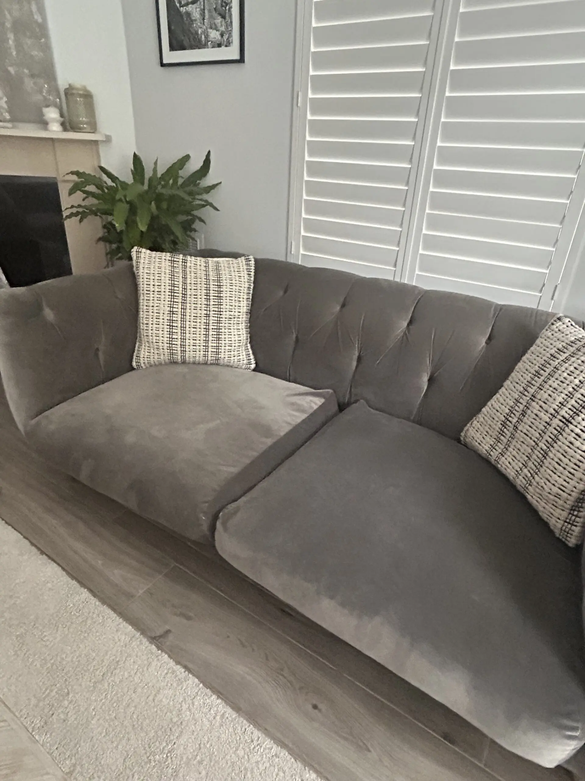 In excellent condition, three seater grey clever velvet loaf sofa. One has a mark on the rear as shown