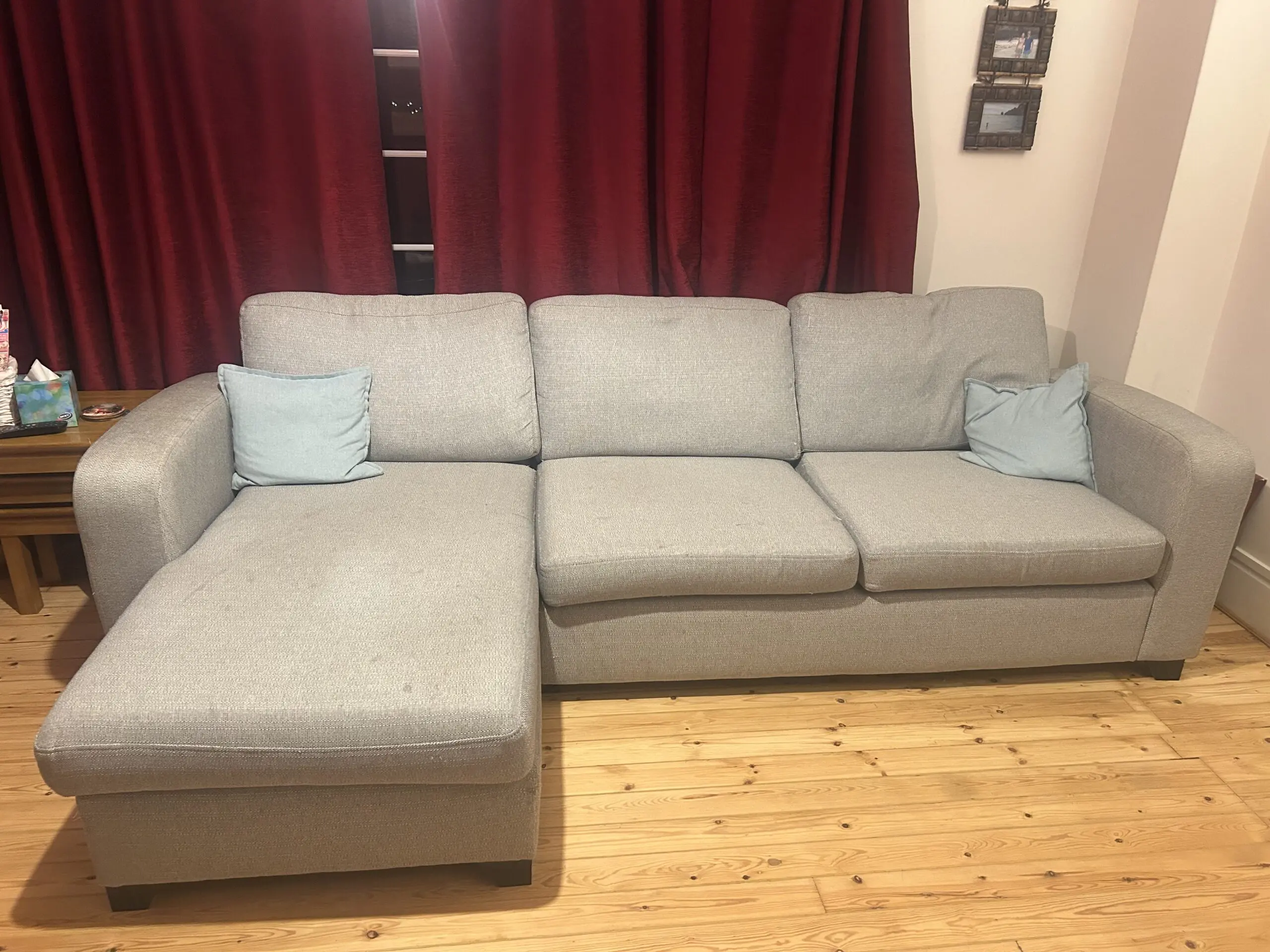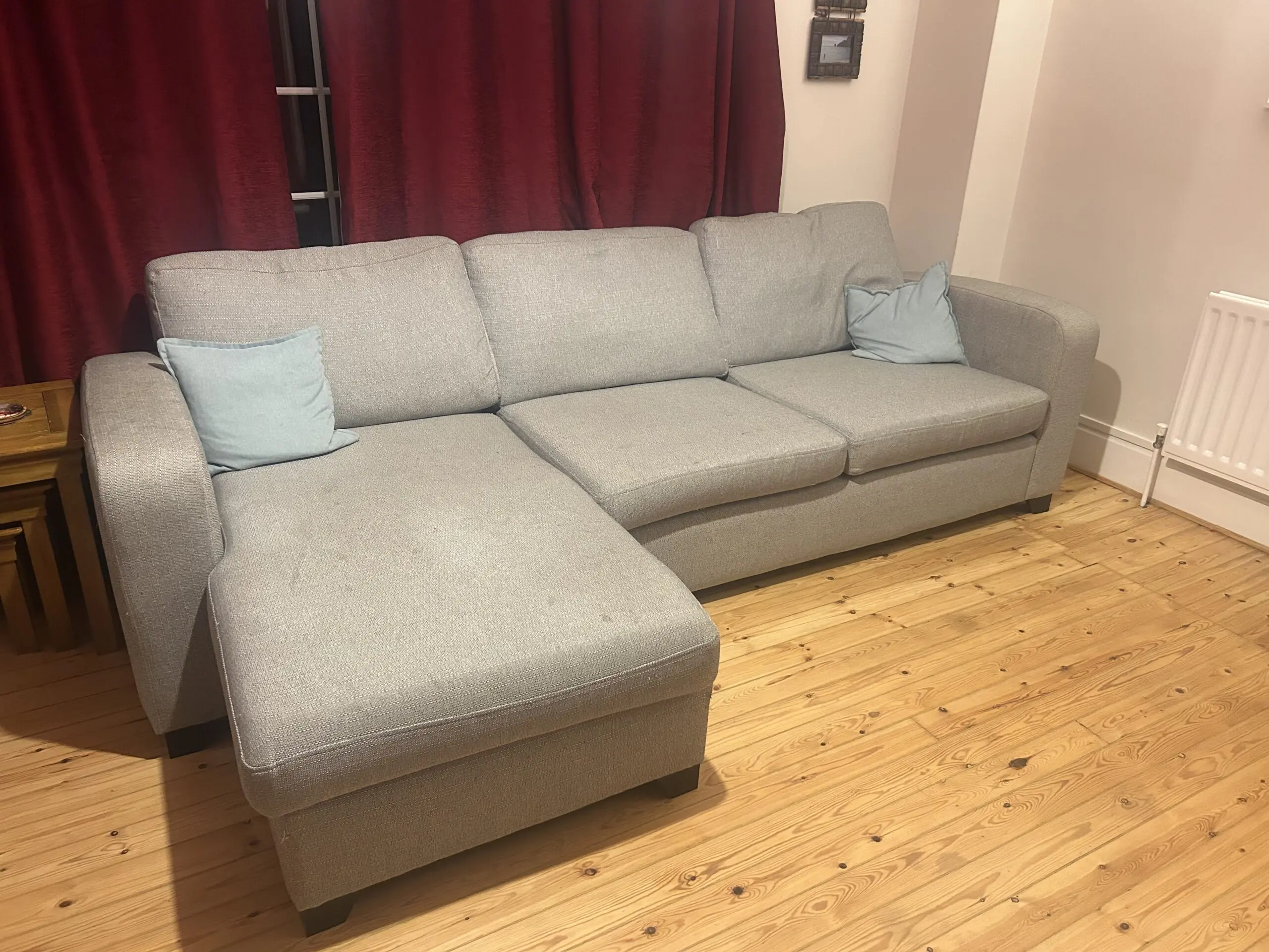 Grey DFS sofa chaise longue. Depth is 95 cm on shorter section, 155 cm on chaise longue.