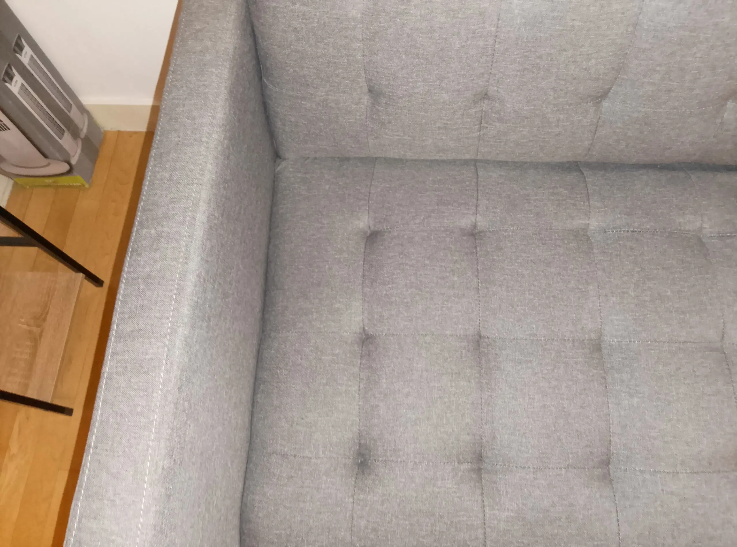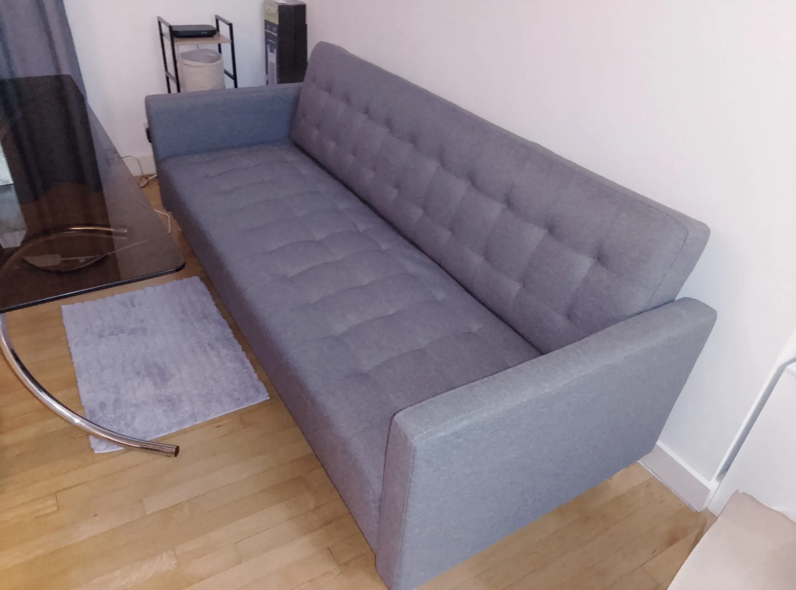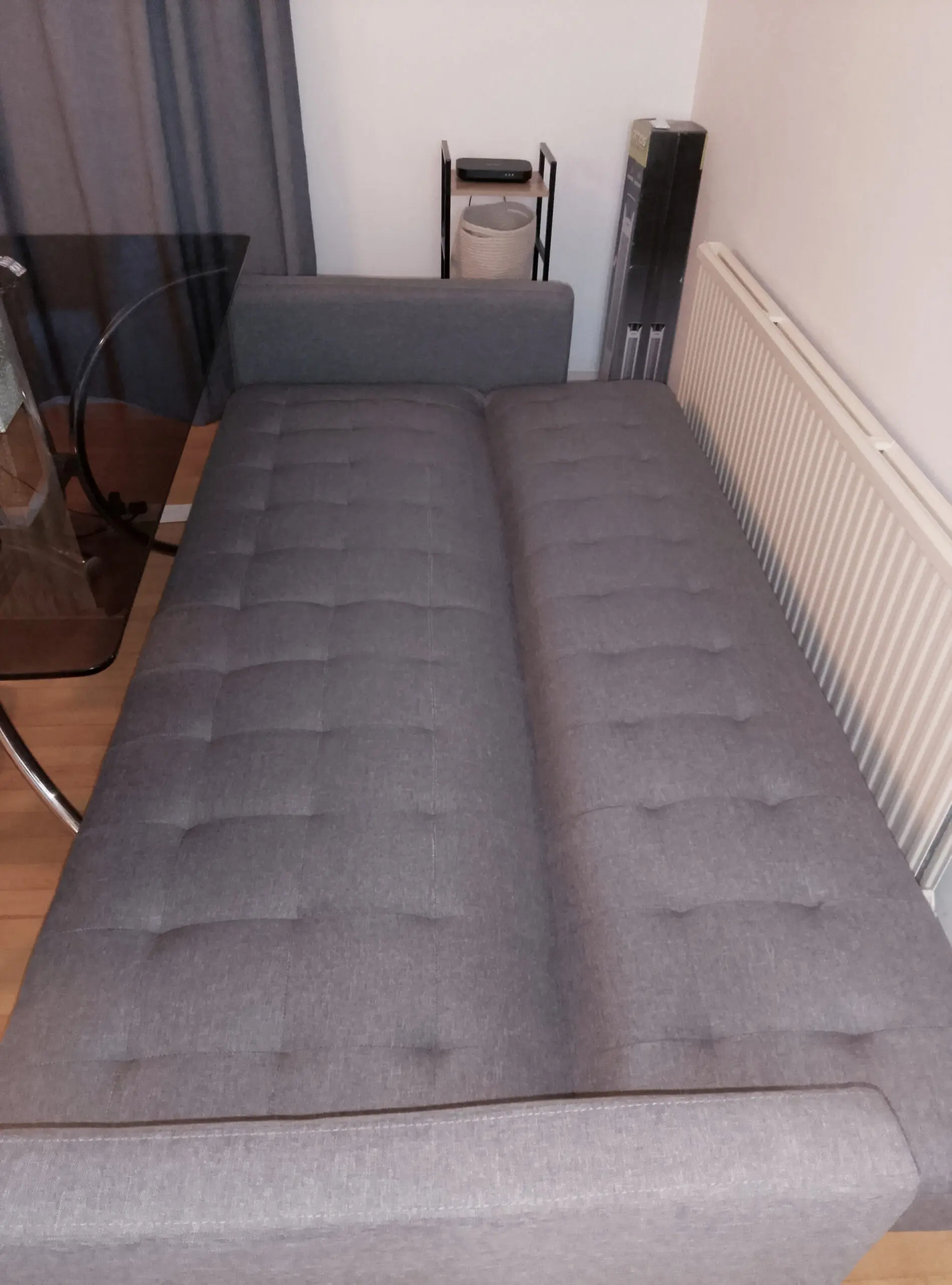 Grey fabric 3-seater sofa bed from JYSK. Bought a few months ago, used very lightly. Home with no pets and no children – the sofa has always been covered with throws, so the fabric is in excellent, almost new condition, with no stains or marks.