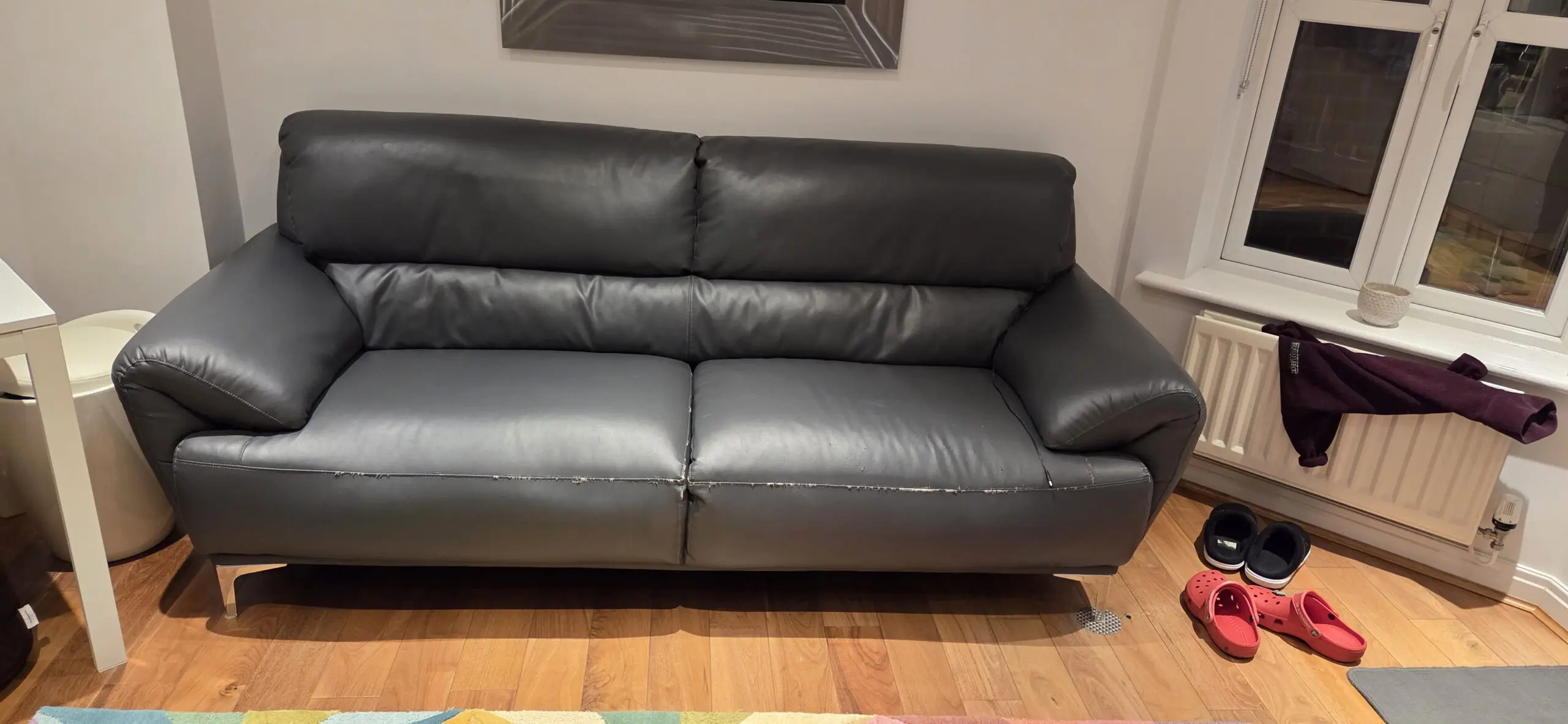 Grey faux leather modern sofa chrome feet. Little worn as per the photos