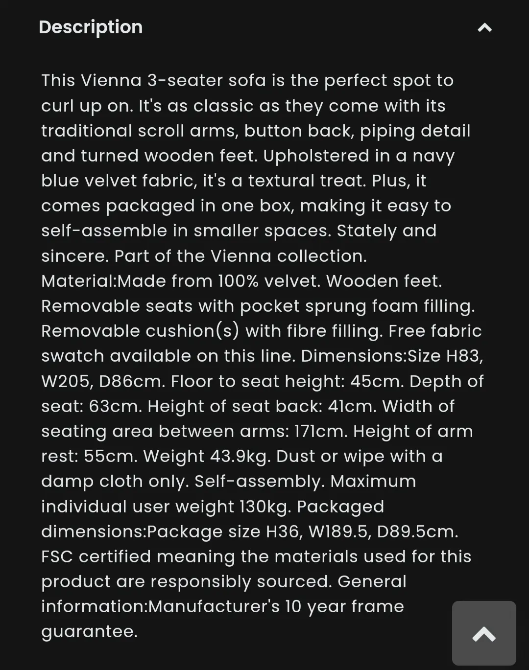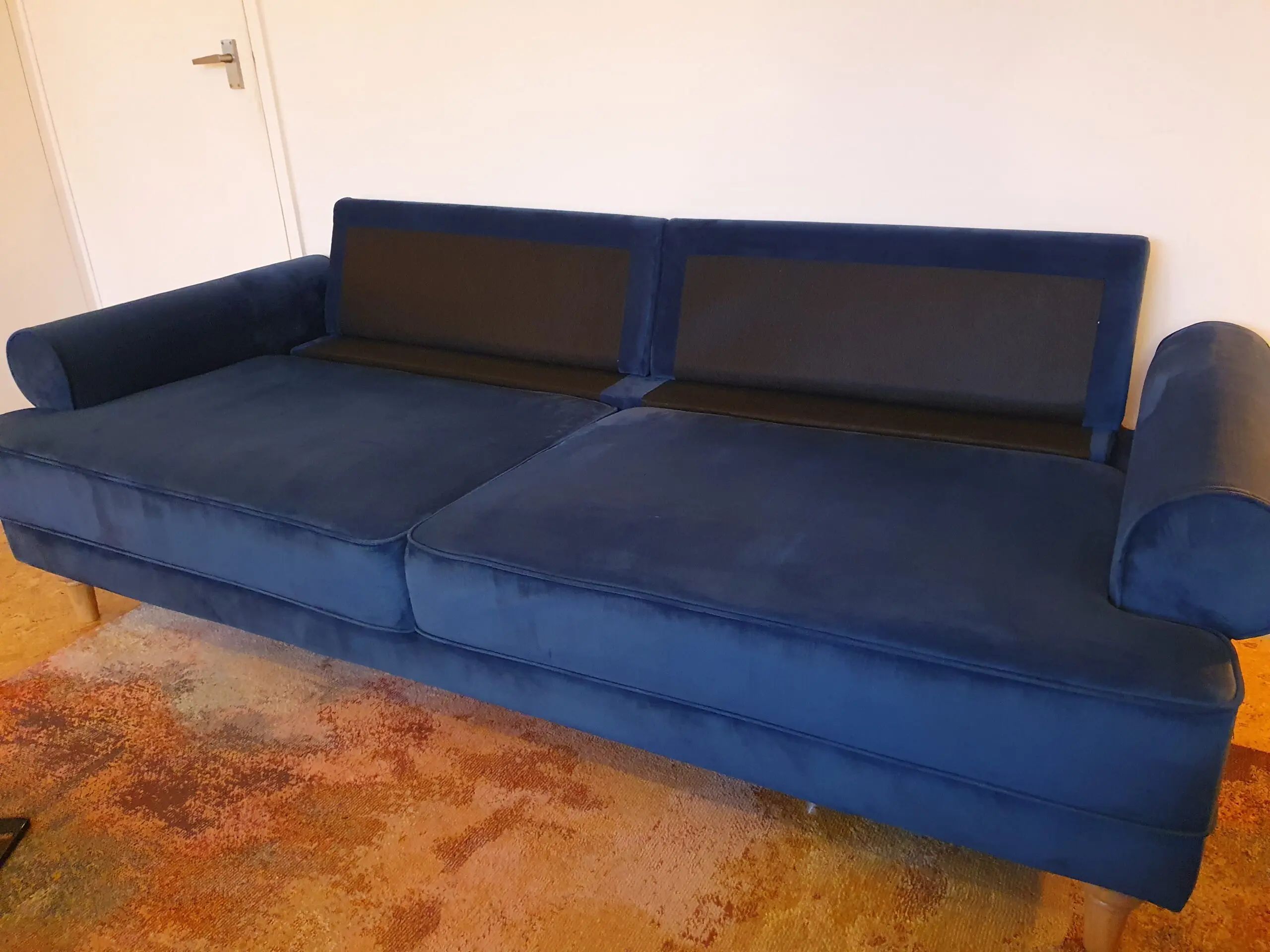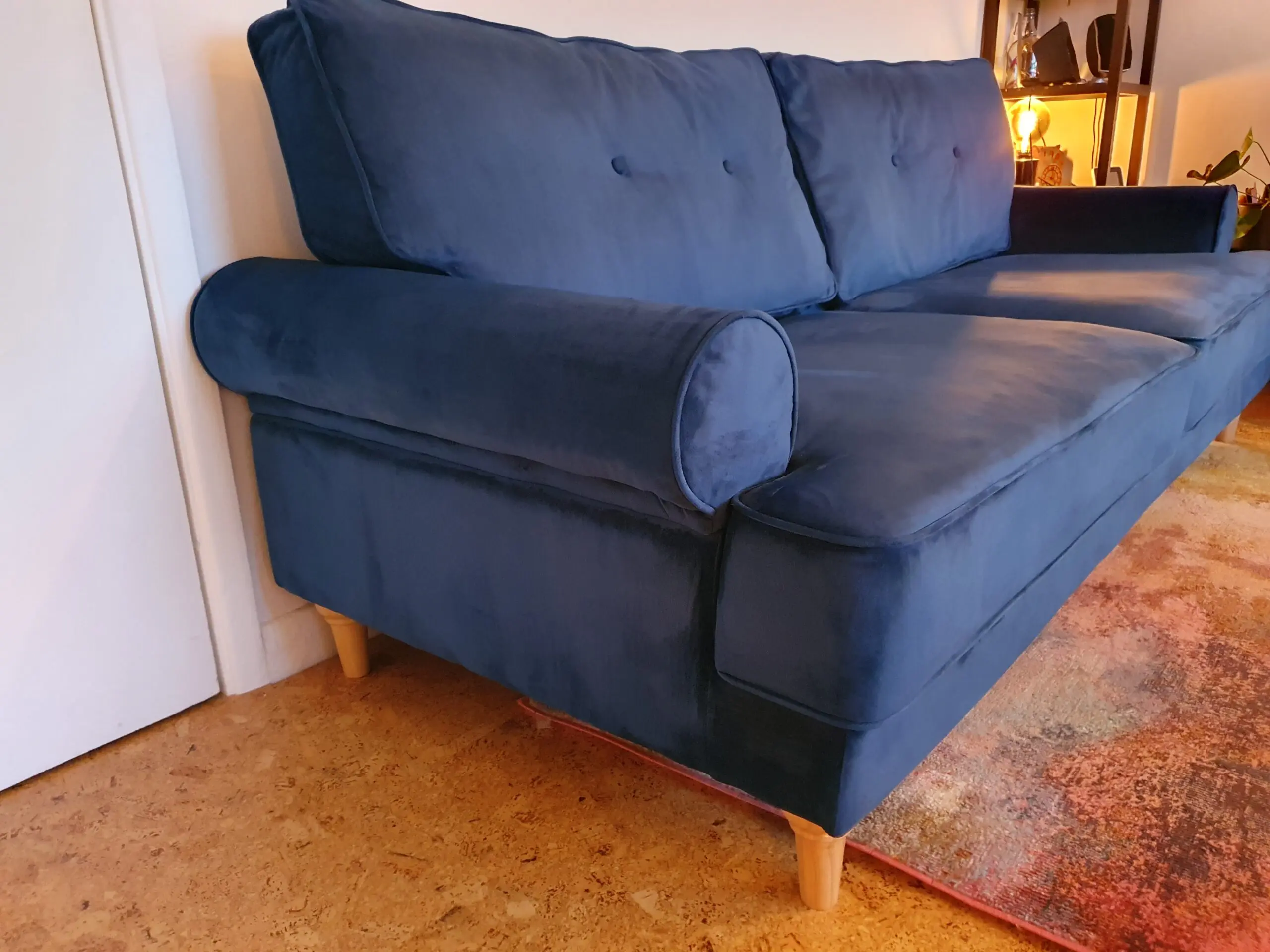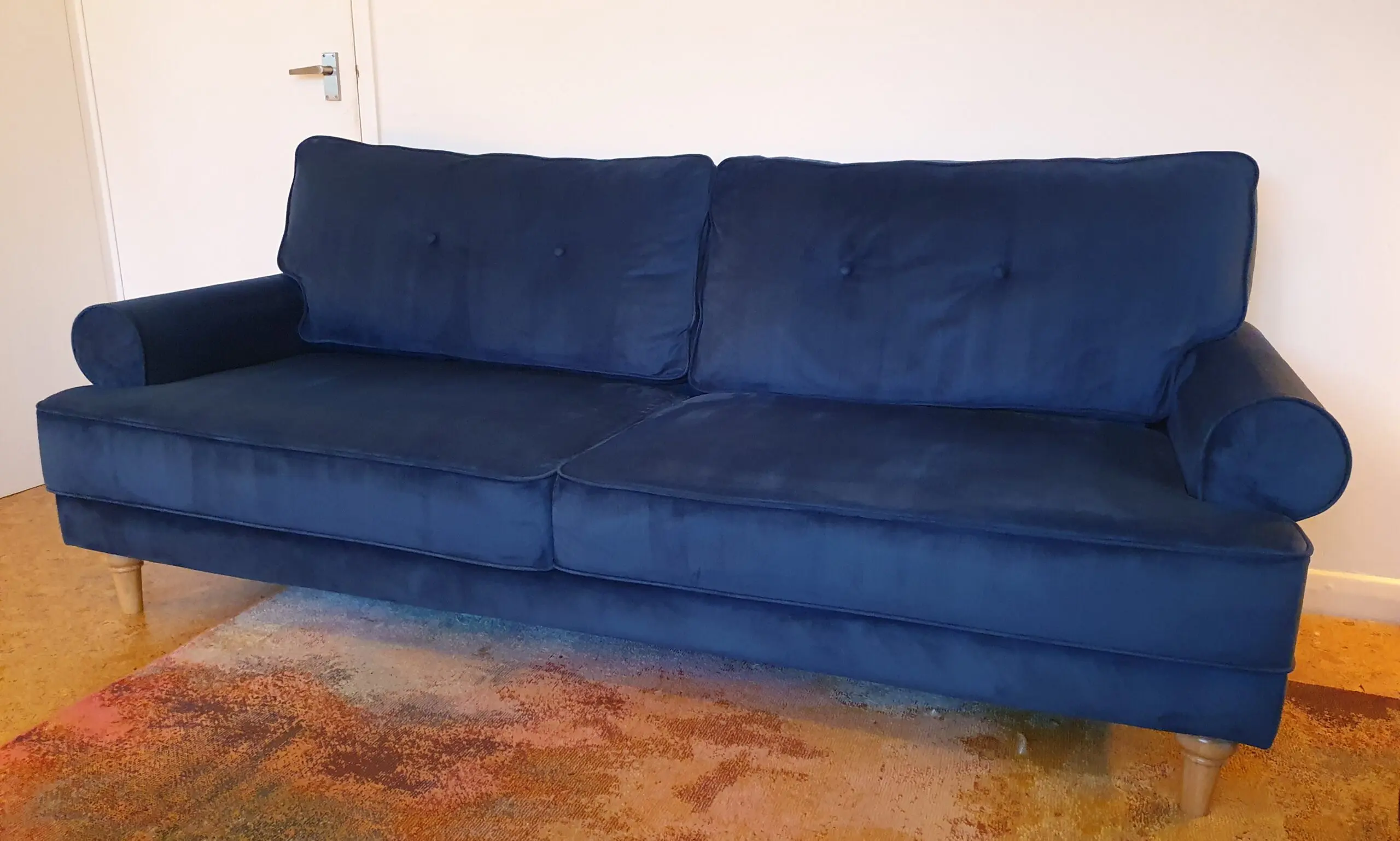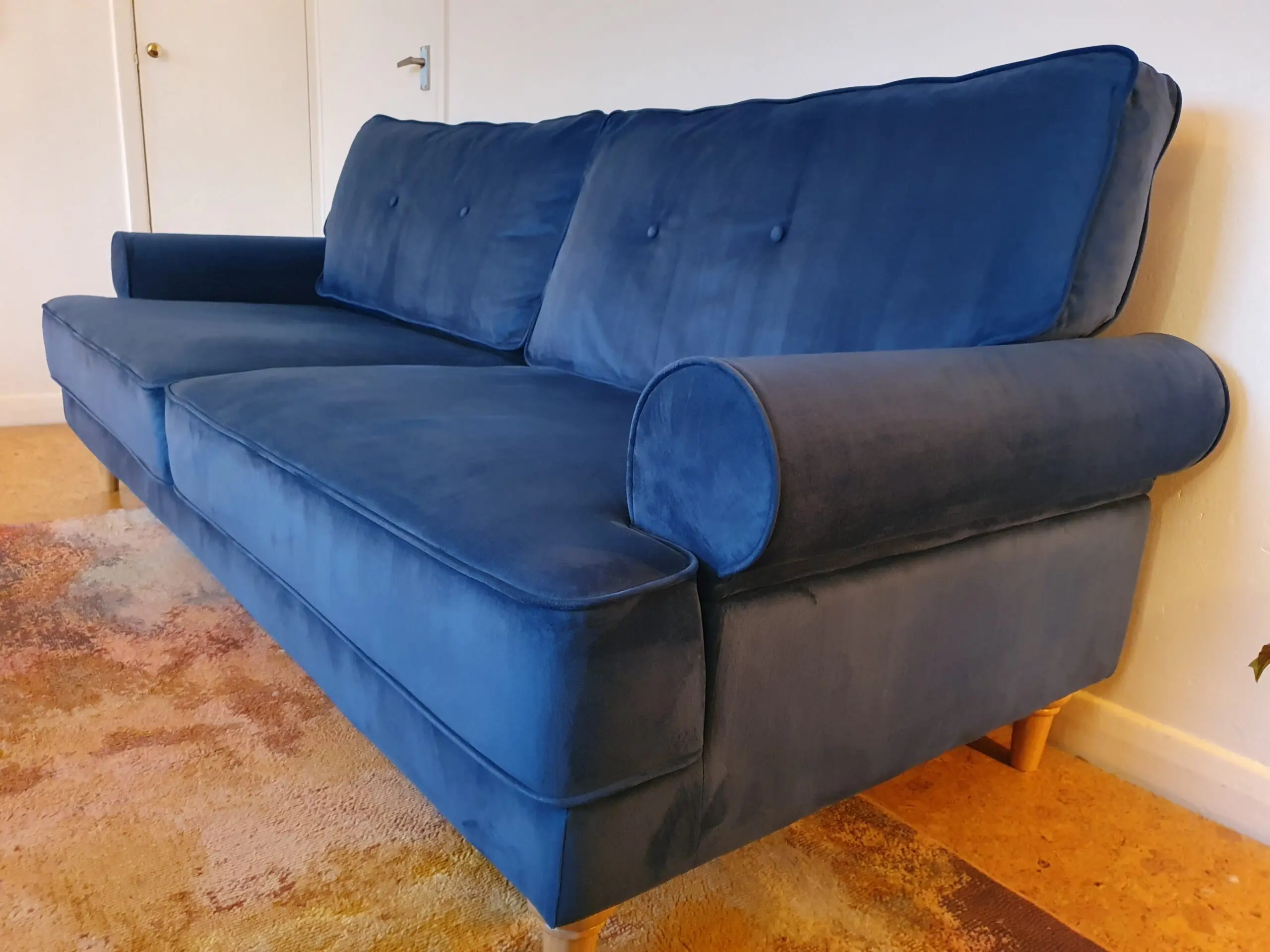 Gorgeous deep blue velvet sofa, from the Habitat Vienna range. Only 2 years old with very few signs of use. Really well cared for and freshly steam cleaned. The sofa back, legs and arms all detach for transport making it an ideal option for smaller spaces with awkward access.
