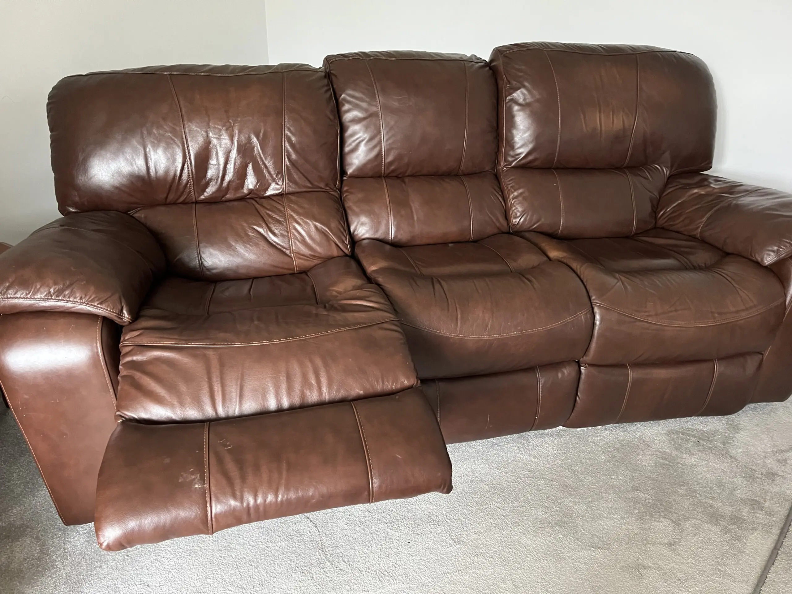 A 3 seater premium leather recliner sofa. Bought from Harvey’s and in good condition.